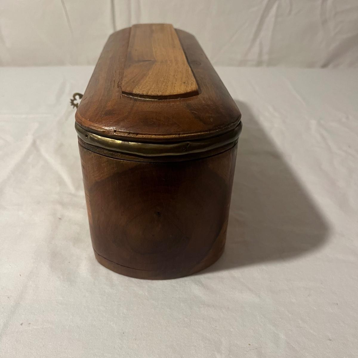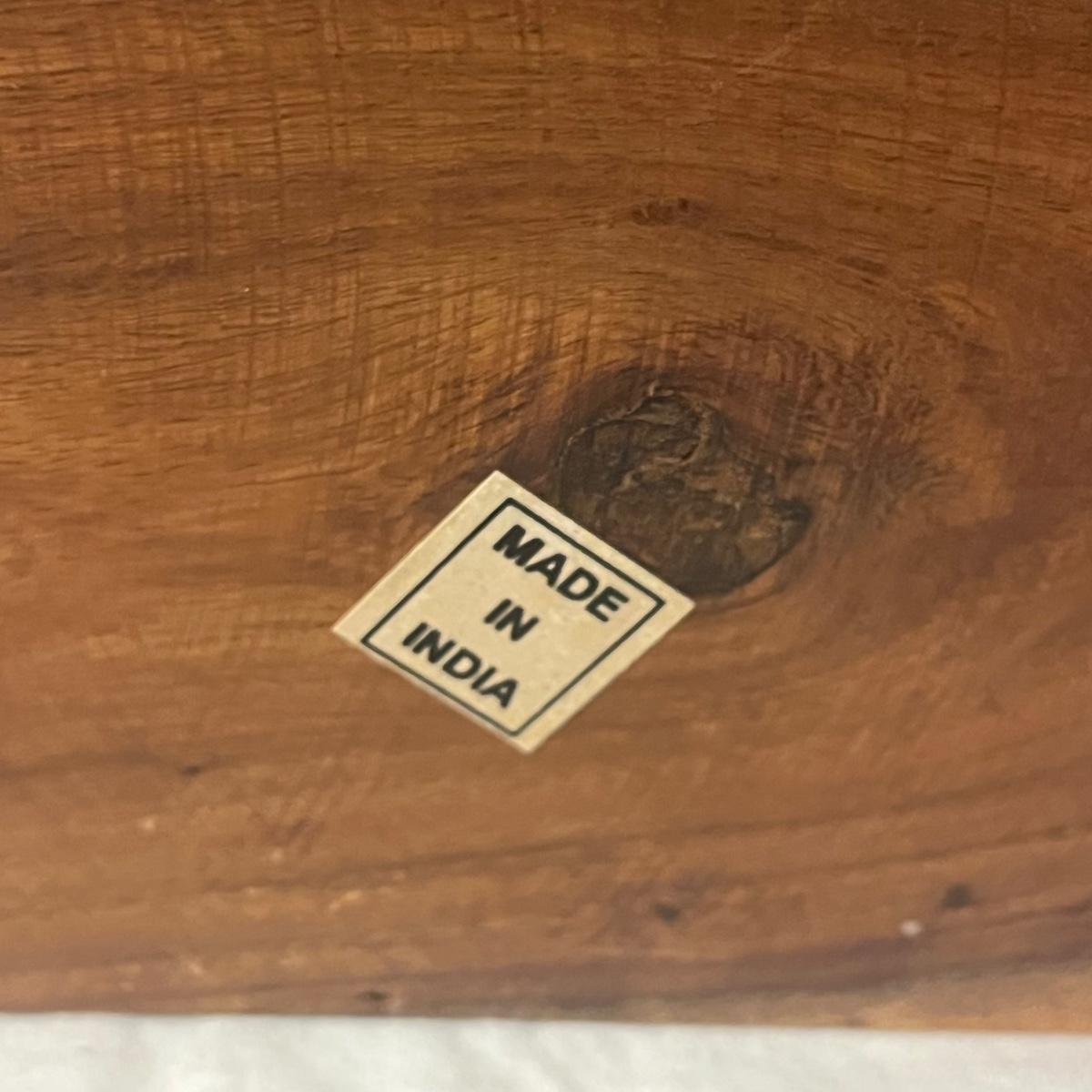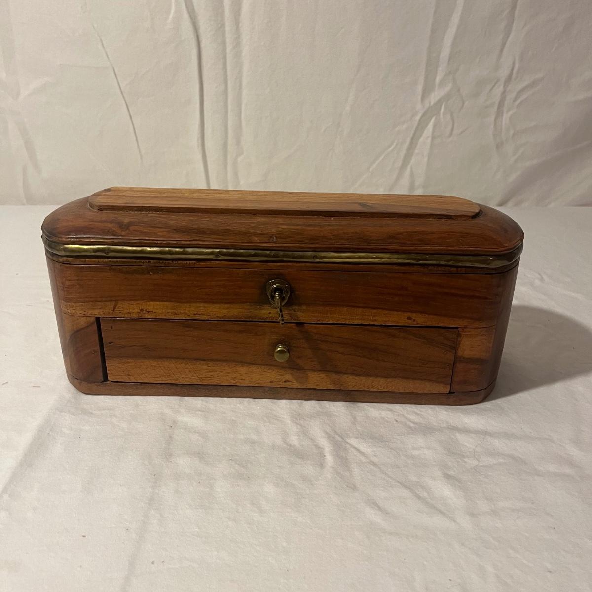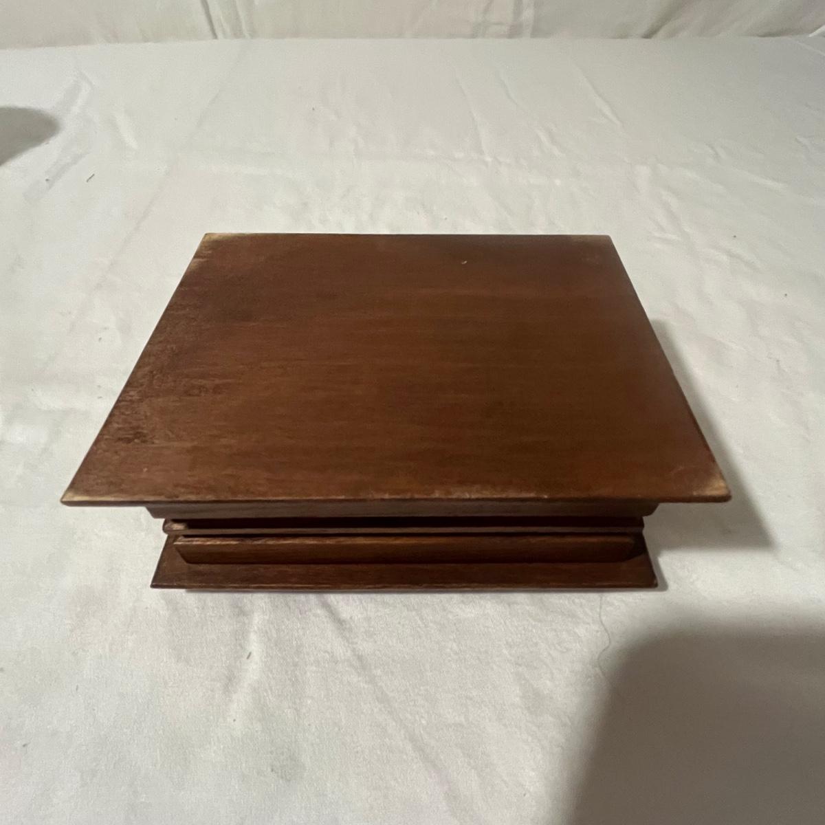 Lot includes two small wooden trinket or jewelry boxes. The larger box was made in India and has brass colored trim. There is a locking top with a drawer below. Key included. It measures 5” x 13.5” x 5.25”H. Also includes a small wooden box with a circular cutout on top.