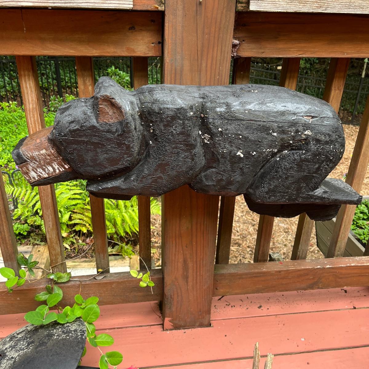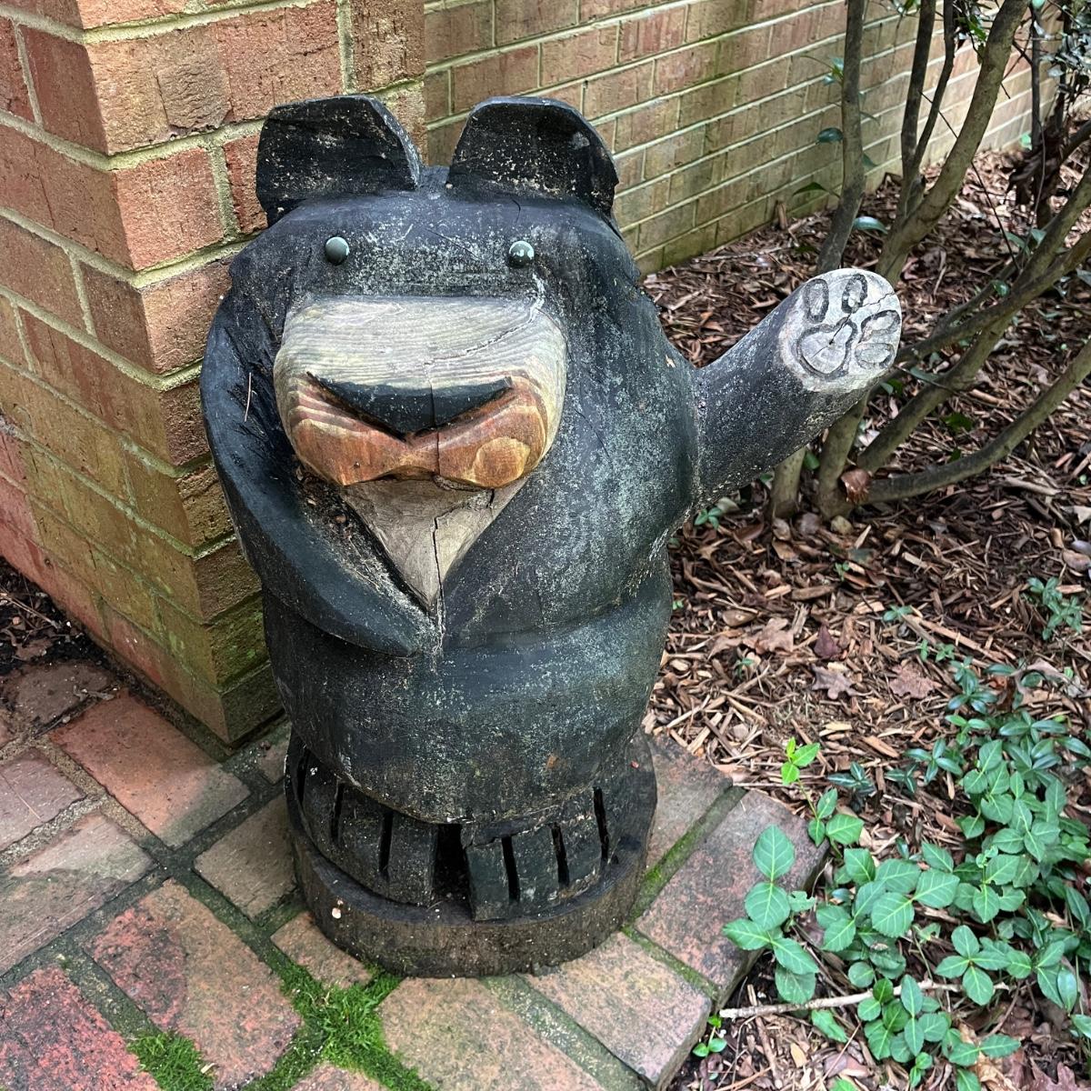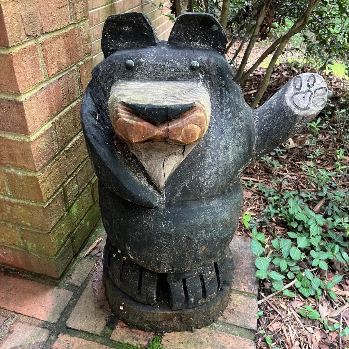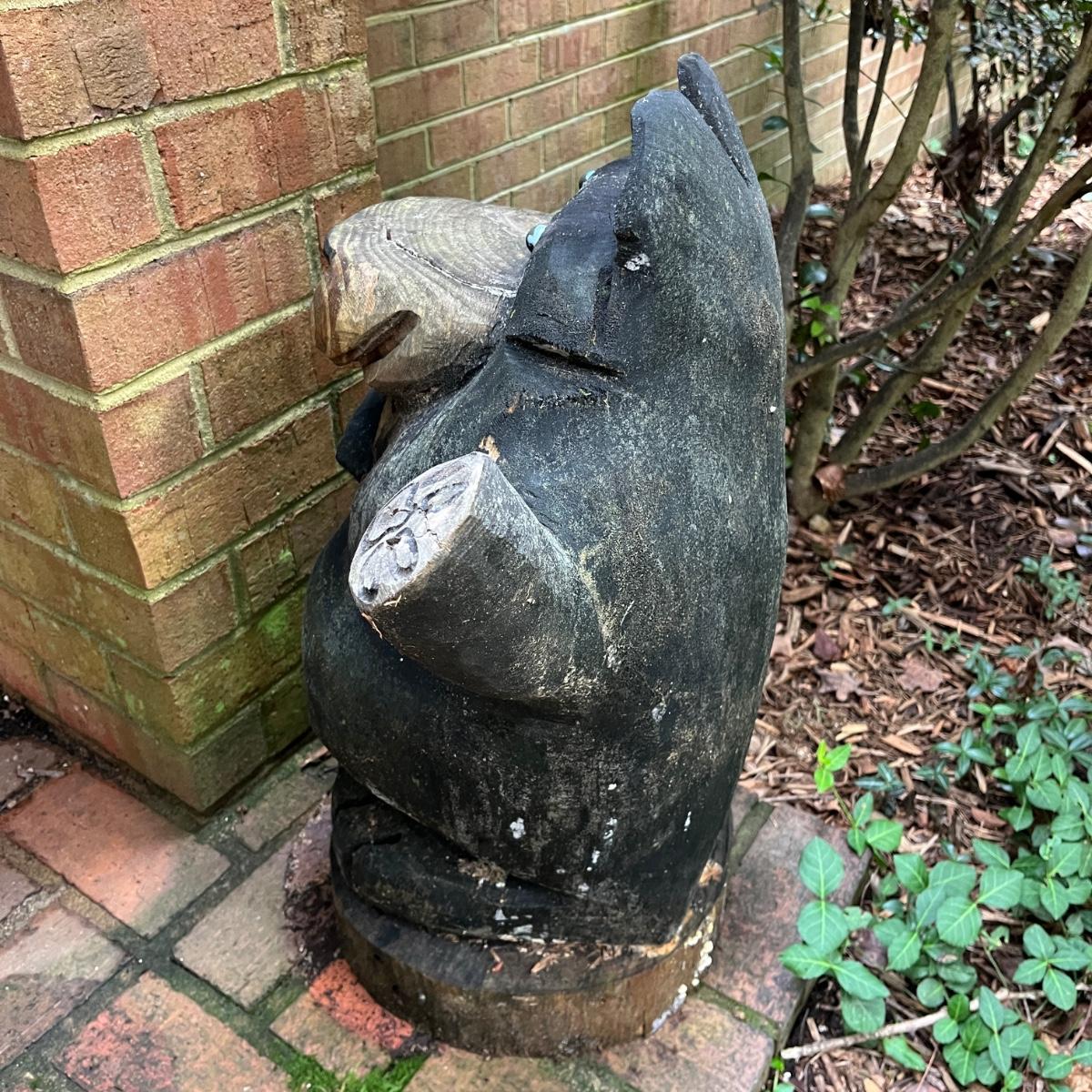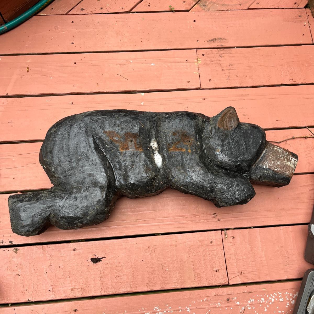 Lot includes two wooden carved black bear statues that appear to be carved with a chainsaw. Largest bear measures 18” x 8” x 25”H and other bear measures 30” x 5” x 12”H. Small bear has two holes where screws were and larger bear has crack on his snout, see pictures. Local Pickup Only