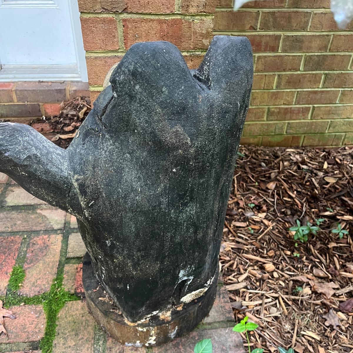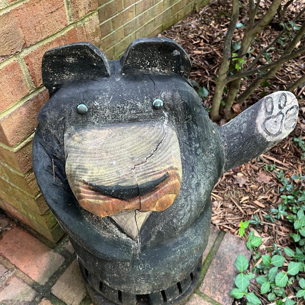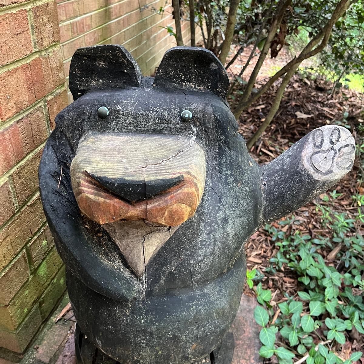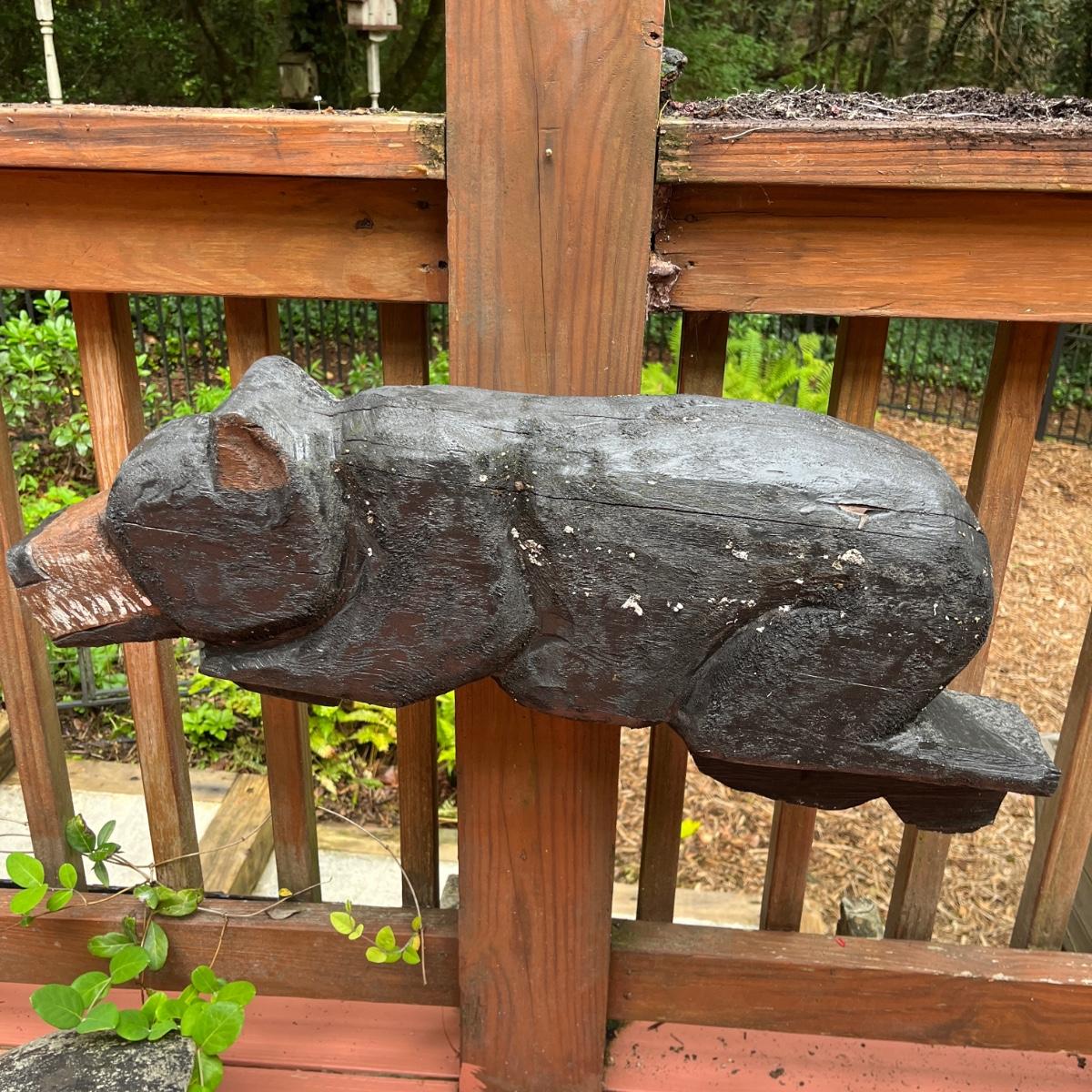 Lot includes two wooden carved black bear statues that appear to be carved with a chainsaw. Largest bear measures 18” x 8” x 25”H and other bear measures 30” x 5” x 12”H. Small bear has two holes where screws were and larger bear has crack on his snout, see pictures. Local Pickup Only
