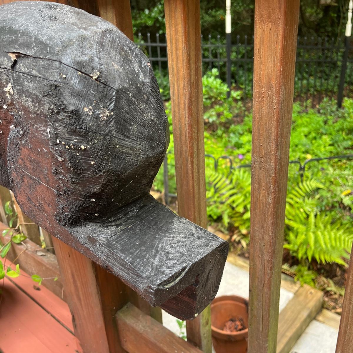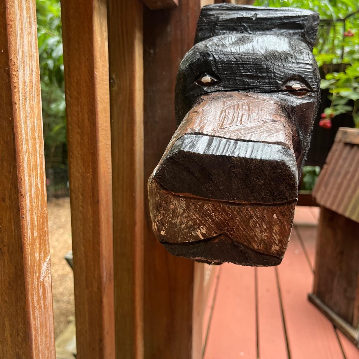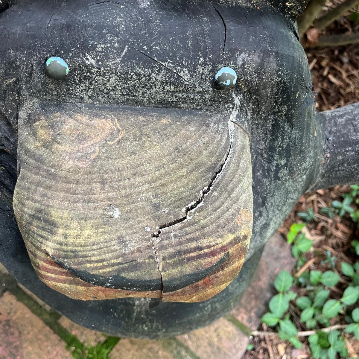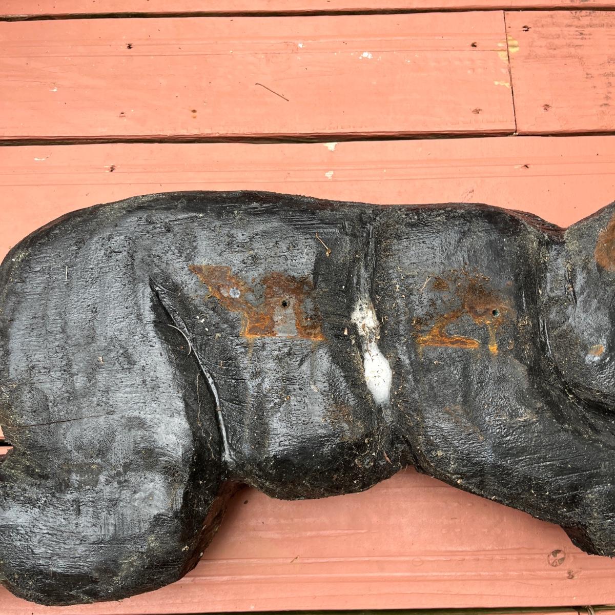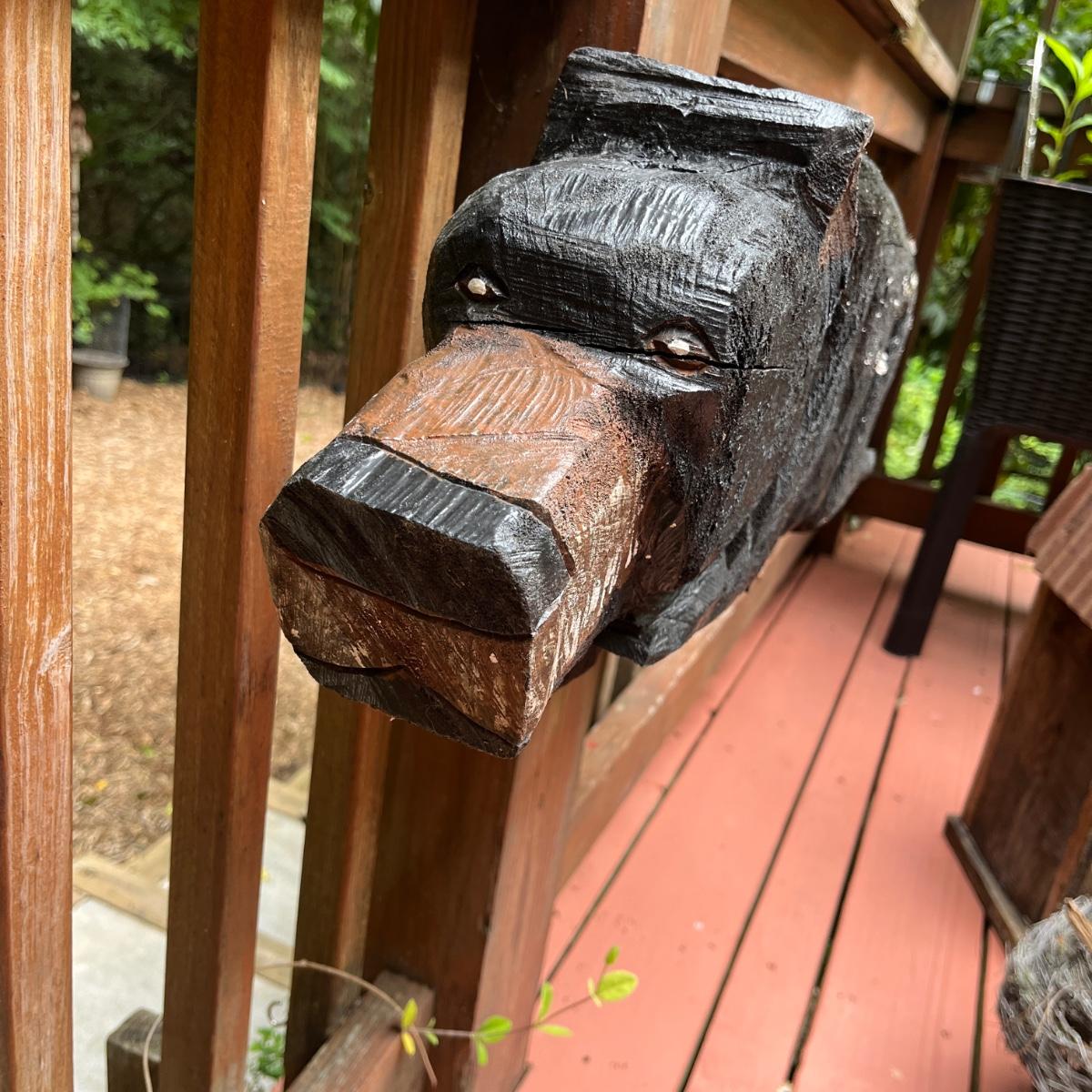 Lot includes two wooden carved black bear statues that appear to be carved with a chainsaw. Largest bear measures 18” x 8” x 25”H and other bear measures 30” x 5” x 12”H. Small bear has two holes where screws were and larger bear has crack on his snout, see pictures. Local Pickup Only
