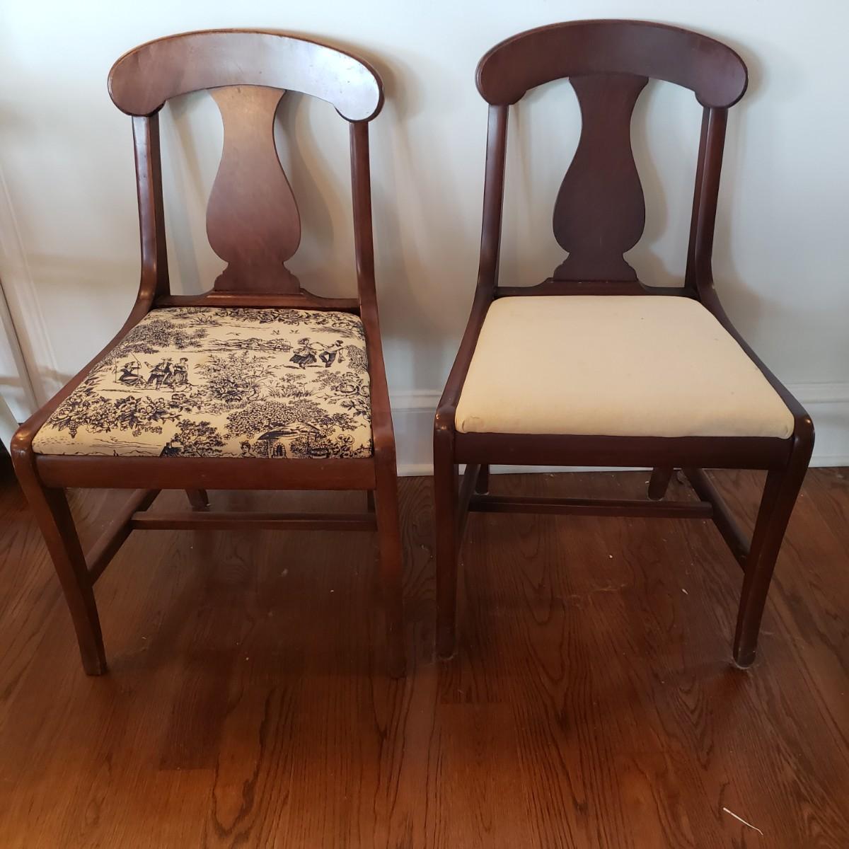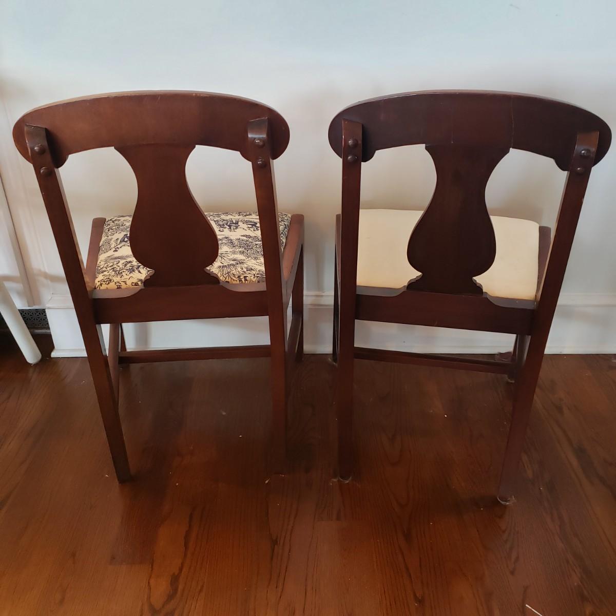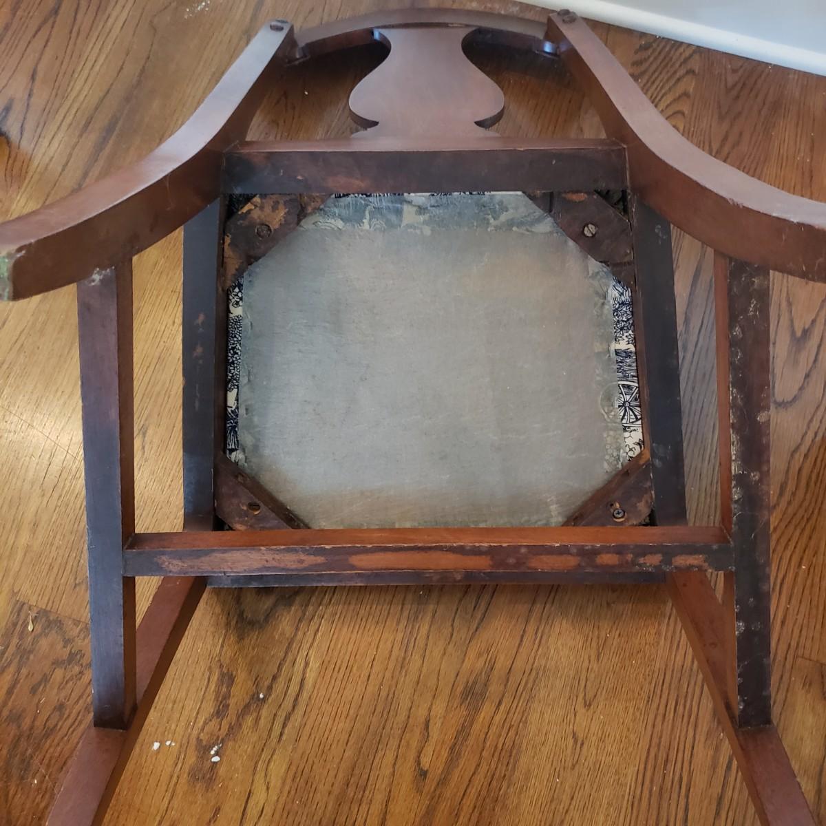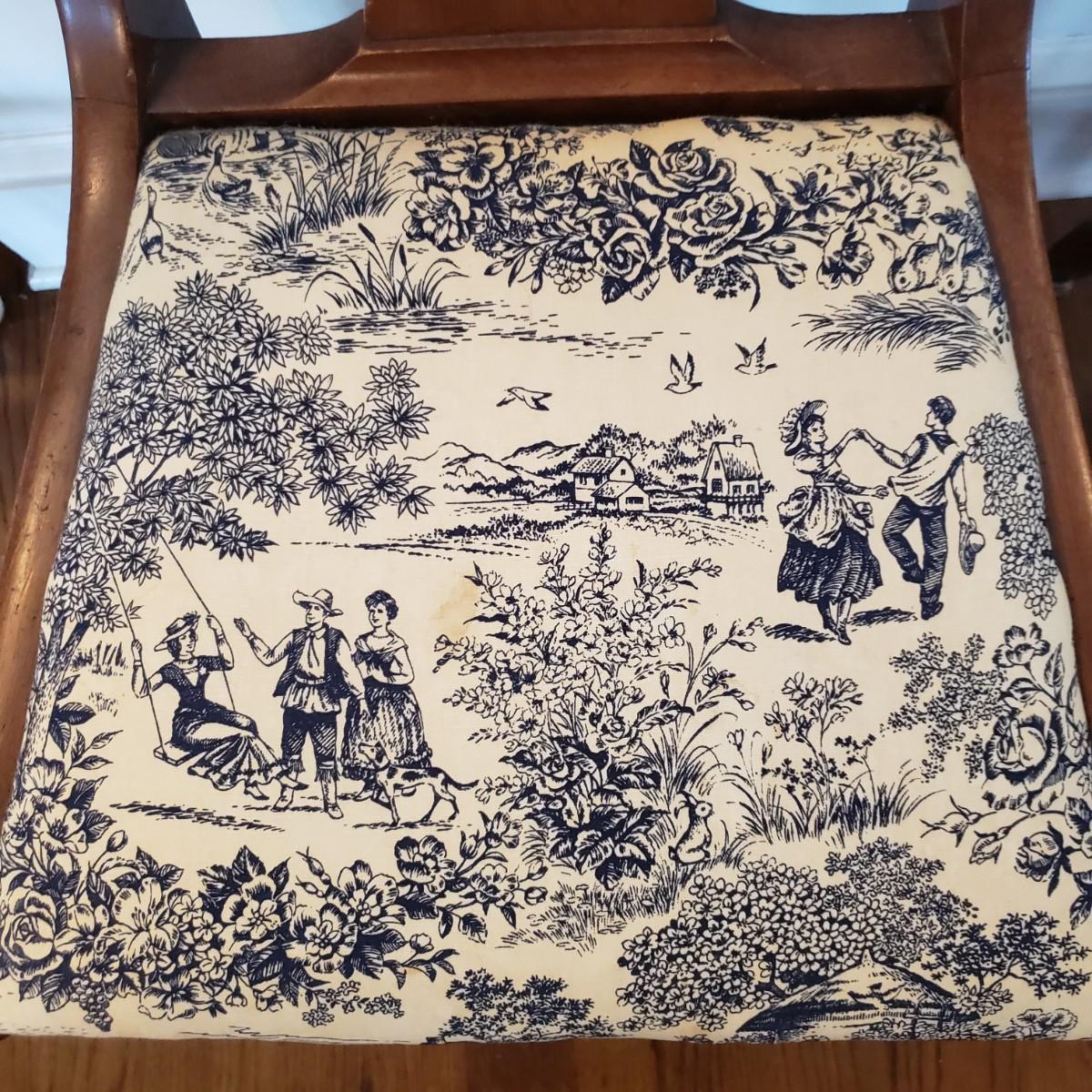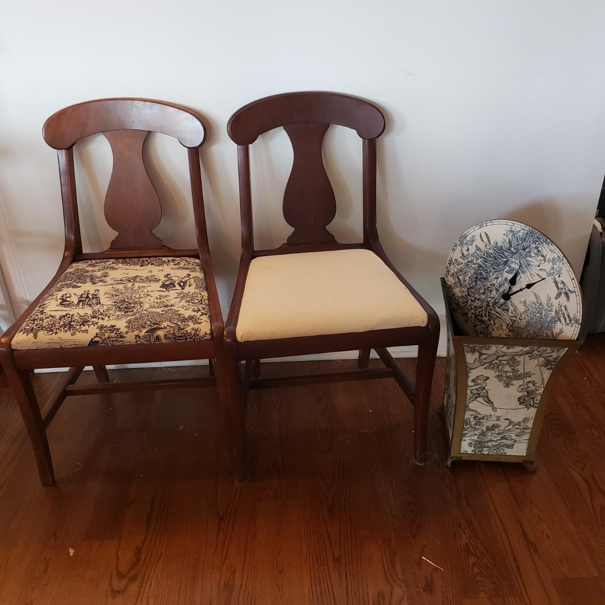 This lot features two identical wooden chairs, with different cloth prints on the seats. The chairs each measure 19" x 15" x 31" H. The seat height is 17". The pattern on the blue patterned chair is very similar to the two accessories. The trash can is wooden with metal claw feet and measures 10.5" x 10.5" x 16" H. The trash can is printed in a black and white pattern. The blue and white patterned clock appears to be made of pressed wood and runs on a AA battery, but we were unable to test the clock. The clock measures 14".