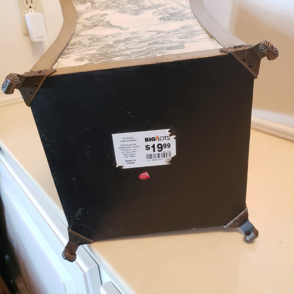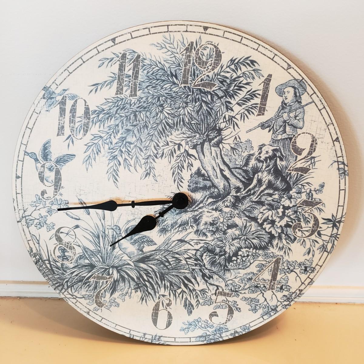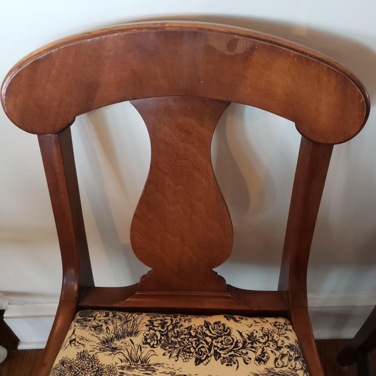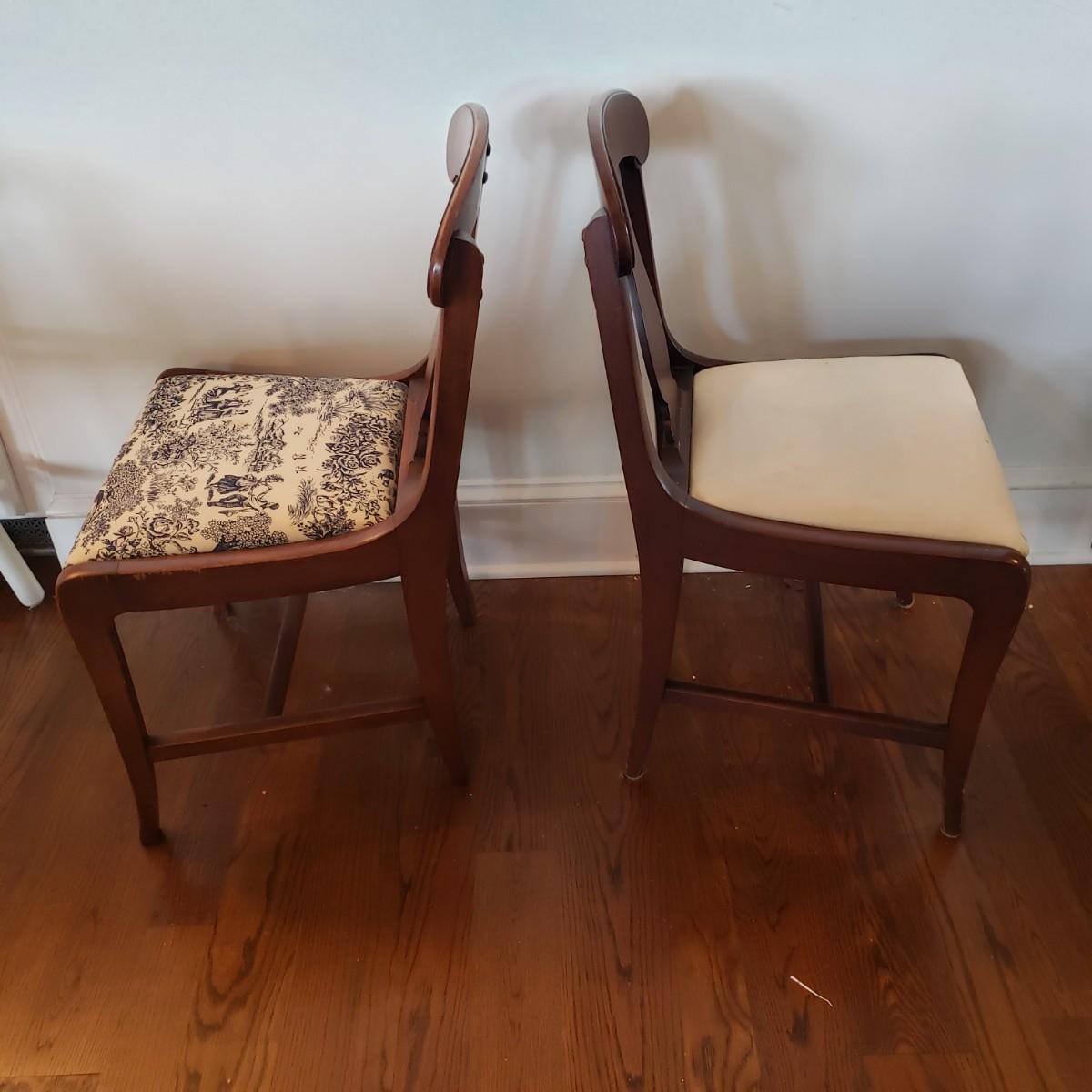 This lot features two identical wooden chairs, with different cloth prints on the seats. The chairs each measure 19" x 15" x 31" H. The seat height is 17". The pattern on the blue patterned chair is very similar to the two accessories. The trash can is wooden with metal claw feet and measures 10.5" x 10.5" x 16" H. The trash can is printed in a black and white pattern. The blue and white patterned clock appears to be made of pressed wood and runs on a AA battery, but we were unable to test the clock. The clock measures 14".