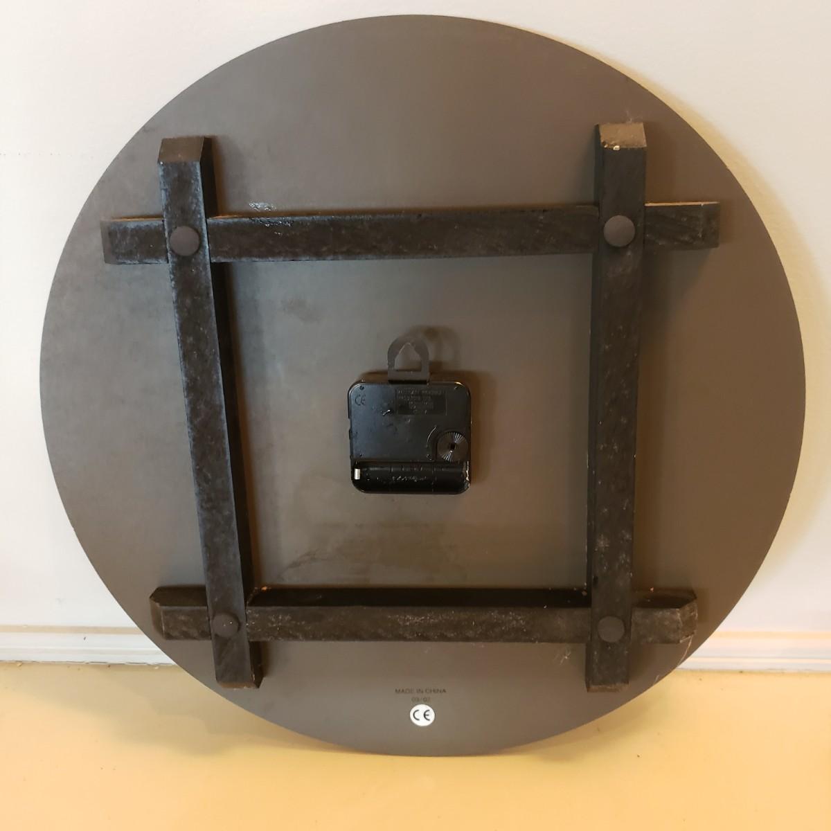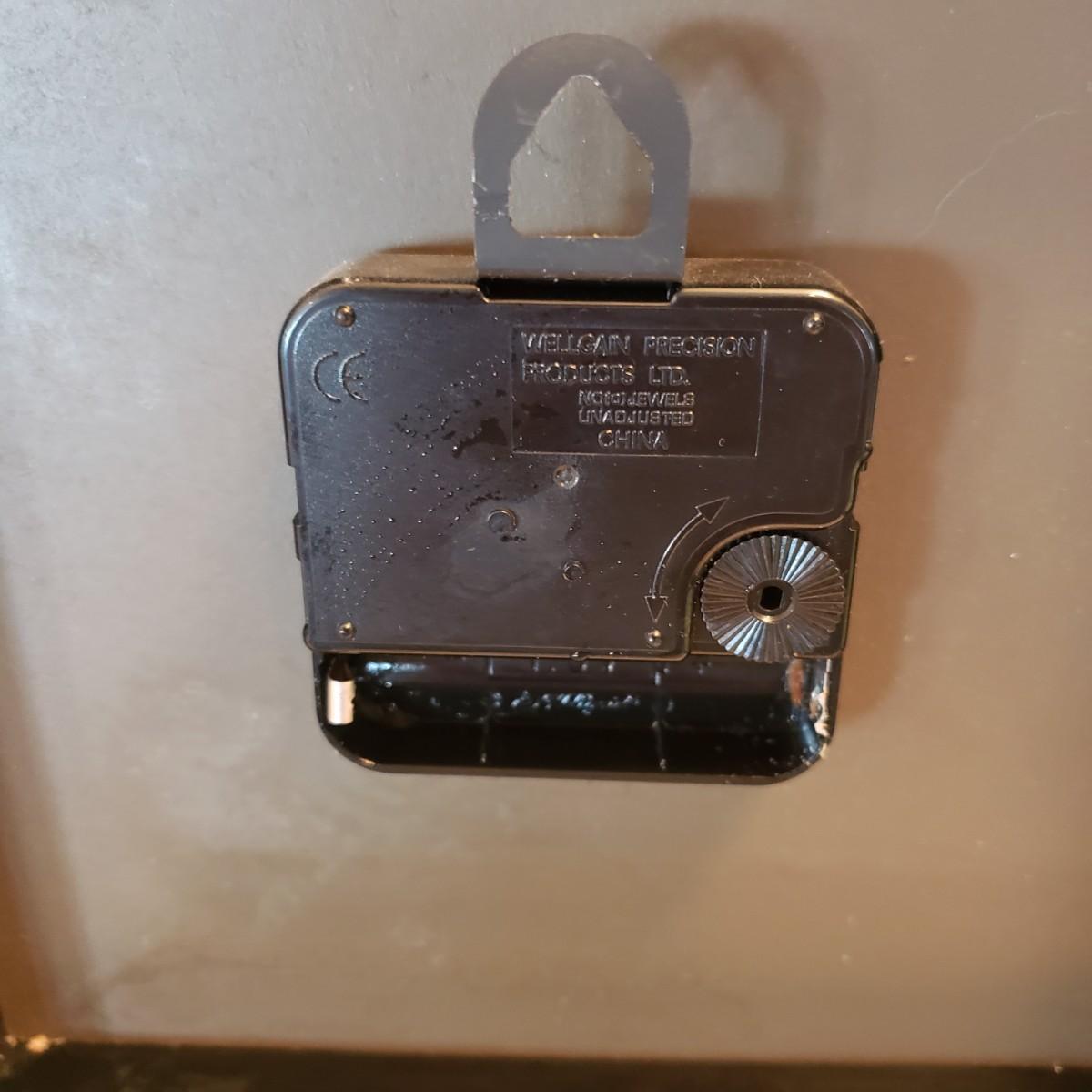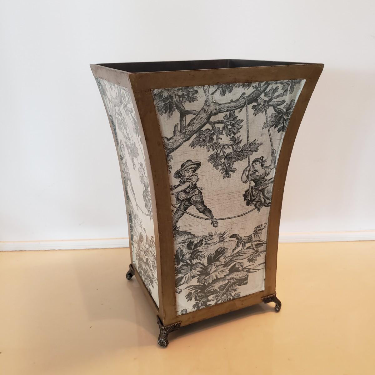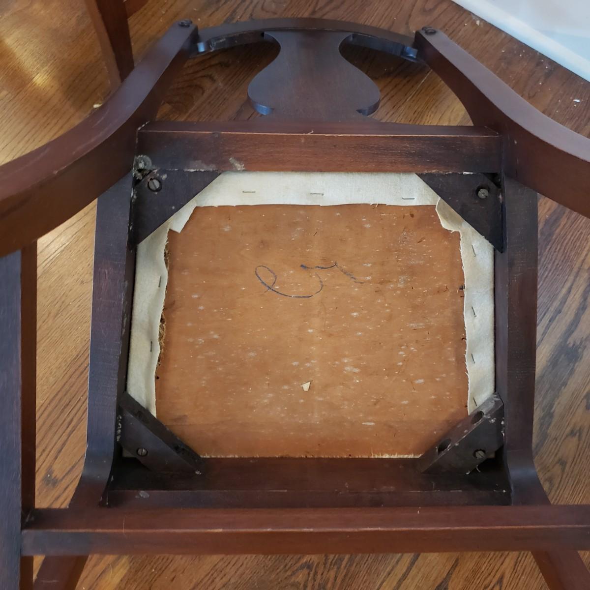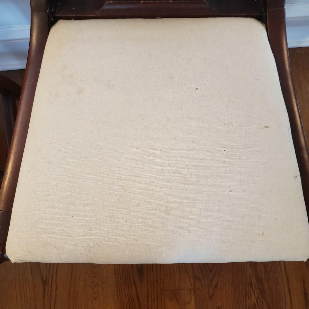 This lot features two identical wooden chairs, with different cloth prints on the seats. The chairs each measure 19" x 15" x 31" H. The seat height is 17". The pattern on the blue patterned chair is very similar to the two accessories. The trash can is wooden with metal claw feet and measures 10.5" x 10.5" x 16" H. The trash can is printed in a black and white pattern. The blue and white patterned clock appears to be made of pressed wood and runs on a AA battery, but we were unable to test the clock. The clock measures 14".