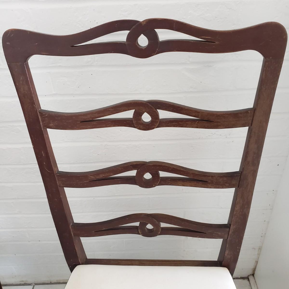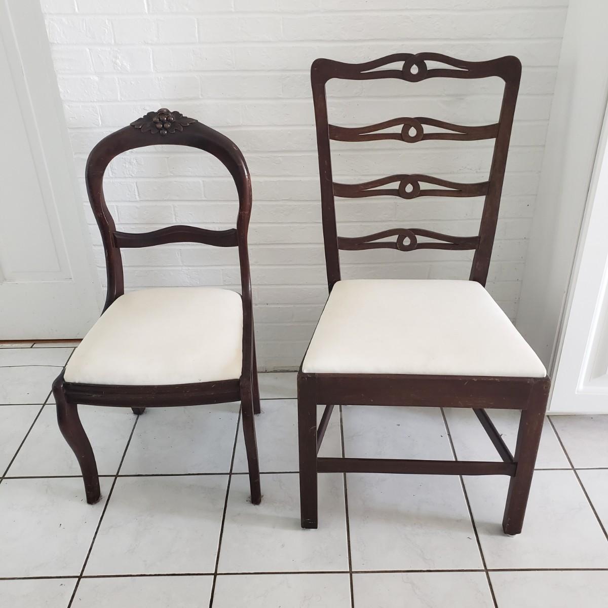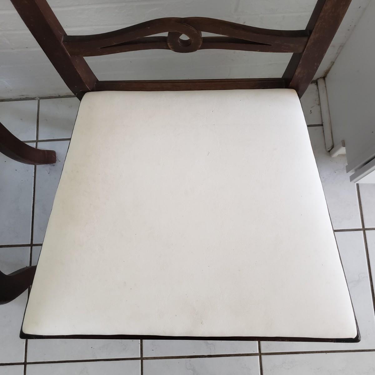 The largest chair measures 20" x 17" x 40", with a seat height of 18". The seat back has a unique swirl design. Both seats are covered in white vinyl. The smaller chair measures 17" x 16" x 34"H. The seat height is 17". This seat has a crack on the inside corner, see picture. Both seats are sturdy.