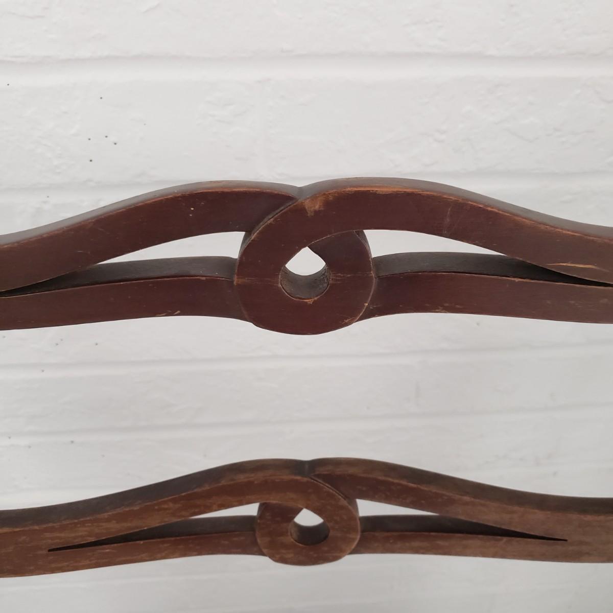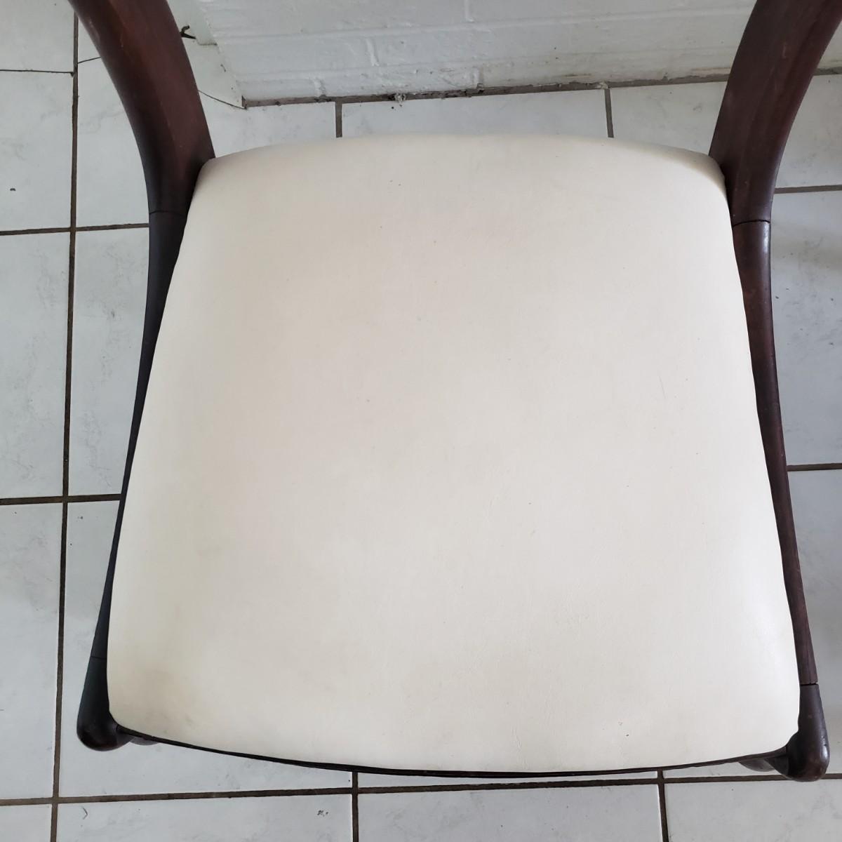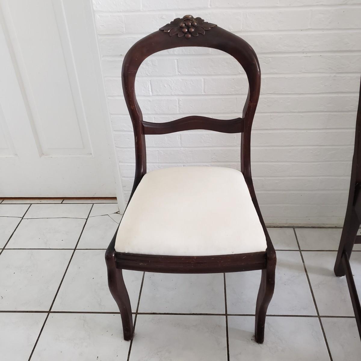 The largest chair measures 20" x 17" x 40", with a seat height of 18". The seat back has a unique swirl design. Both seats are covered in white vinyl. The smaller chair measures 17" x 16" x 34"H. The seat height is 17". This seat has a crack on the inside corner, see picture. Both seats are sturdy.