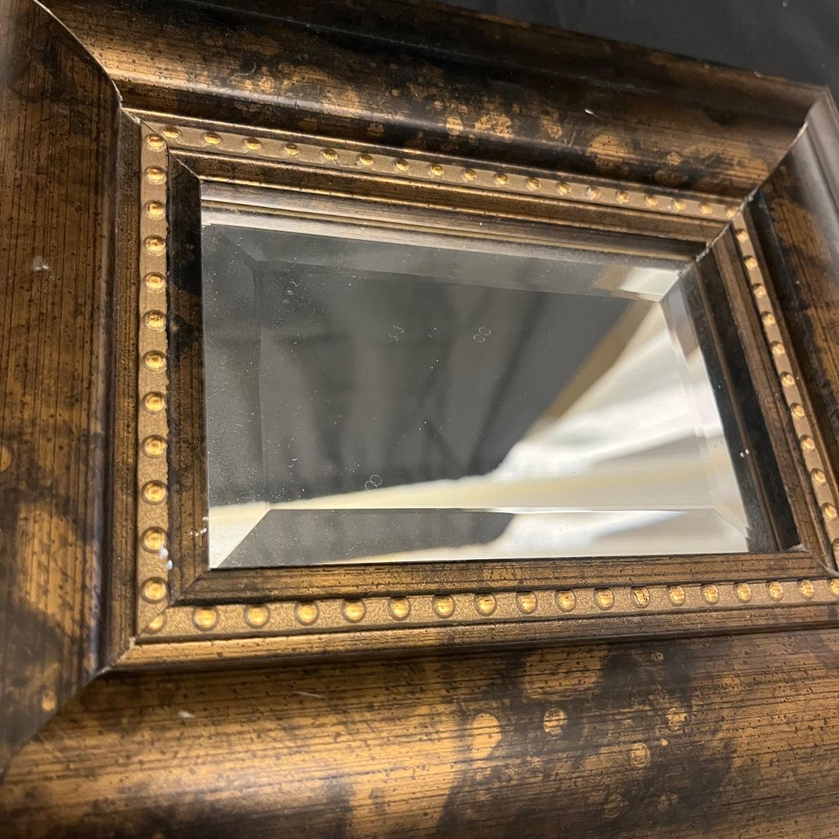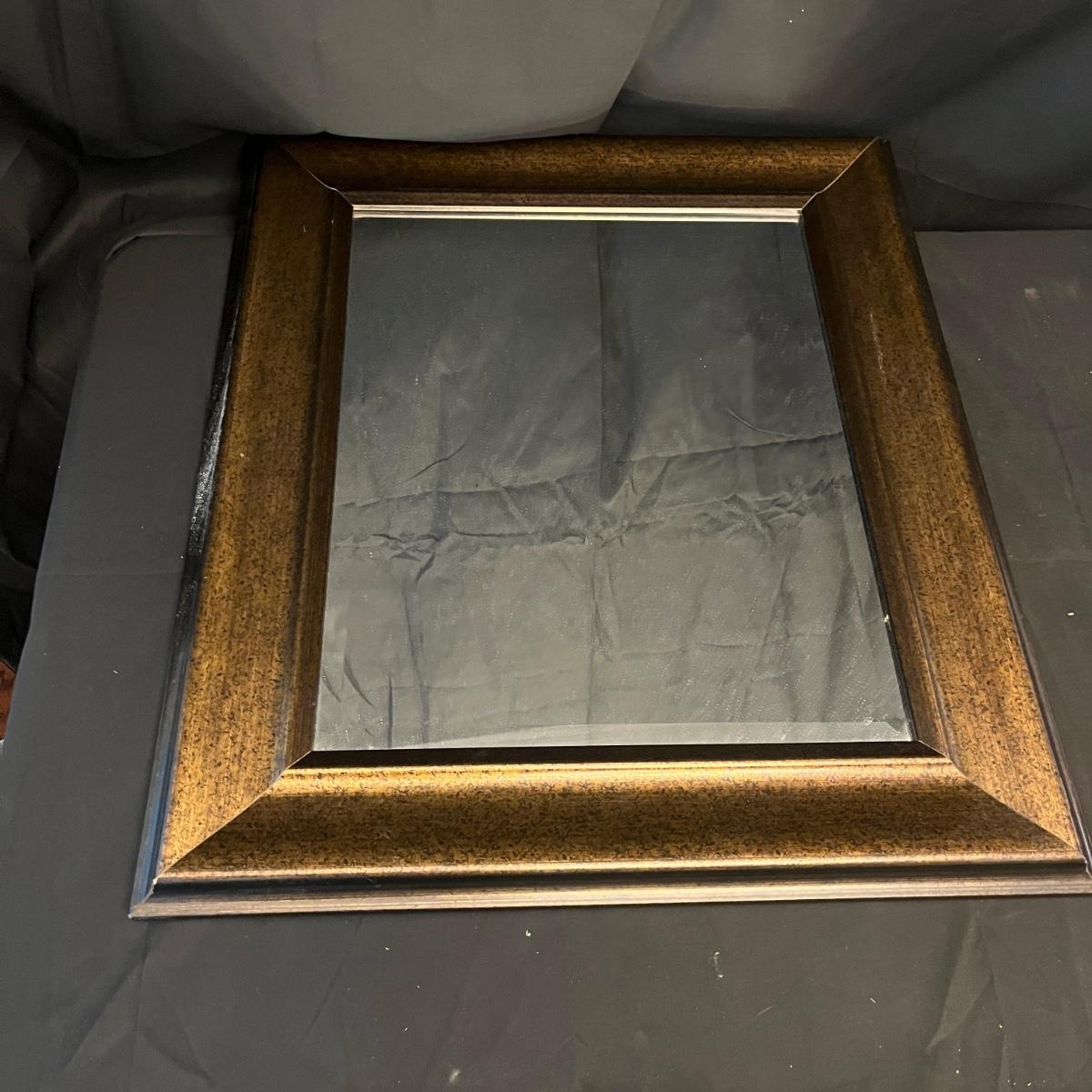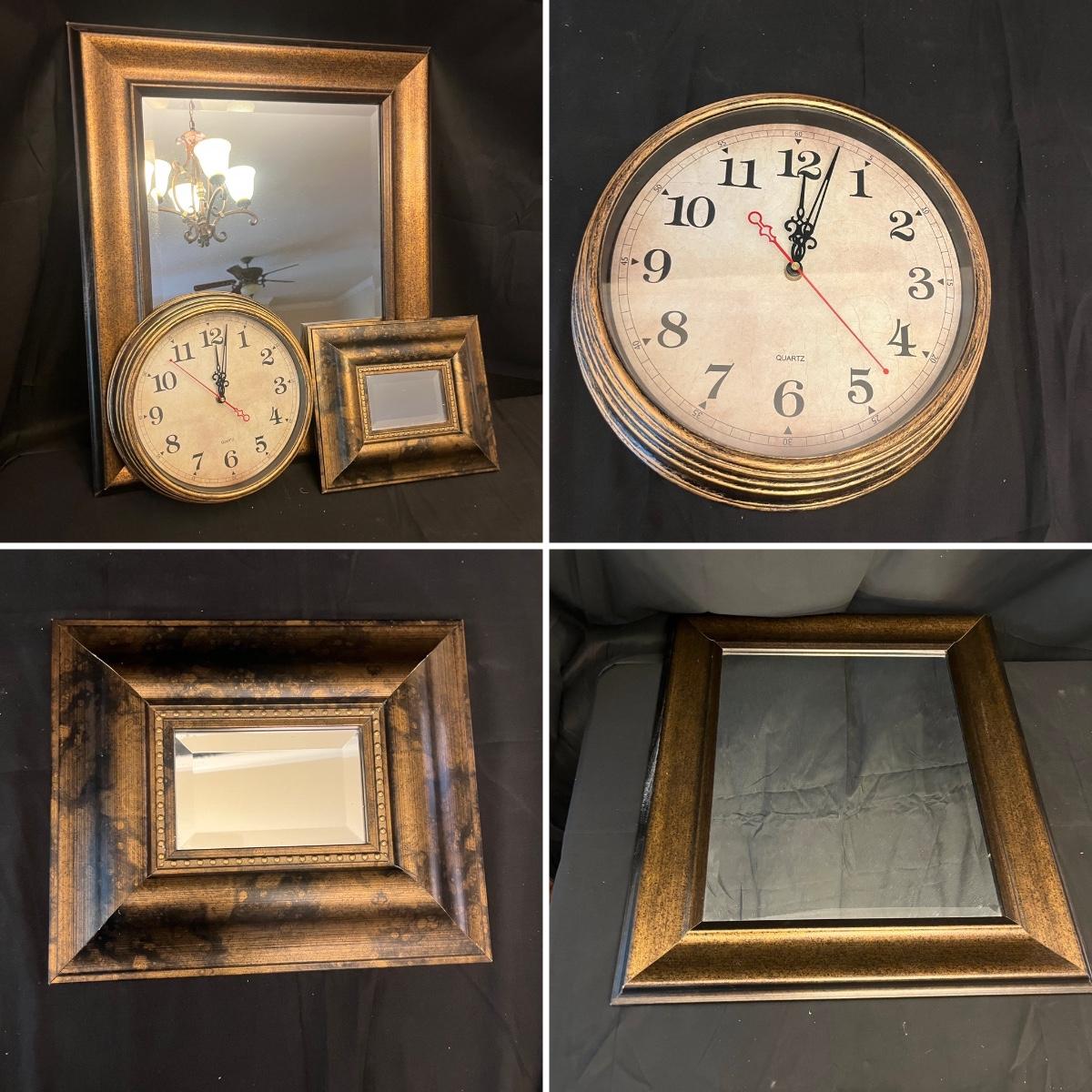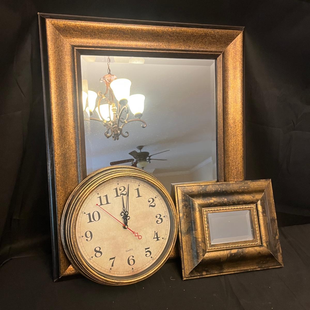 Lot includes two wooden framed beveled glass mirrors and a round plastic quartz wall clock that was running when pictures were taken of it. Largest frame 23.5” x 27.5”H.