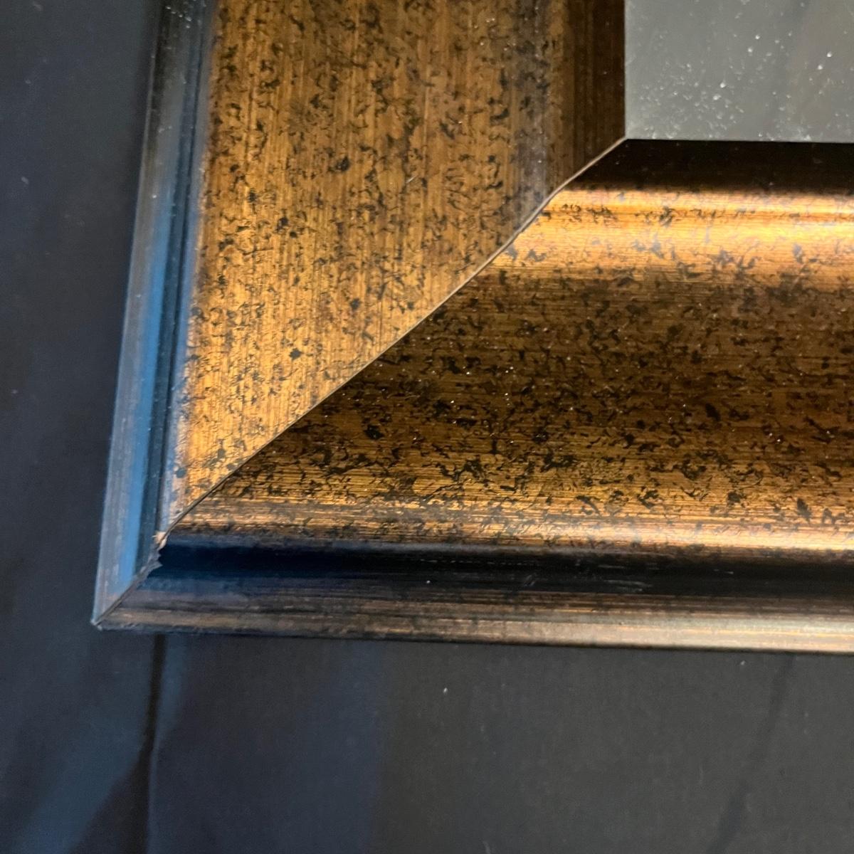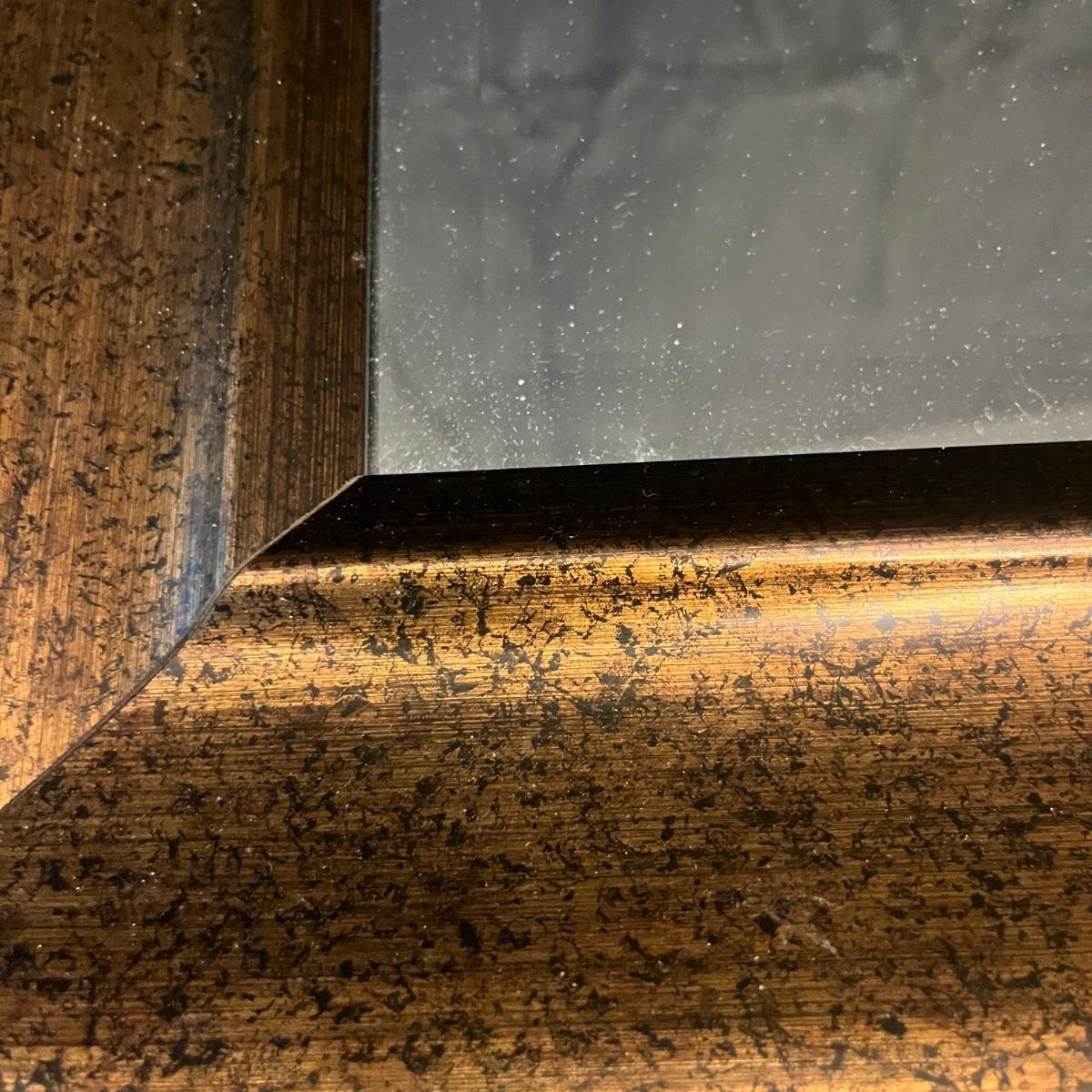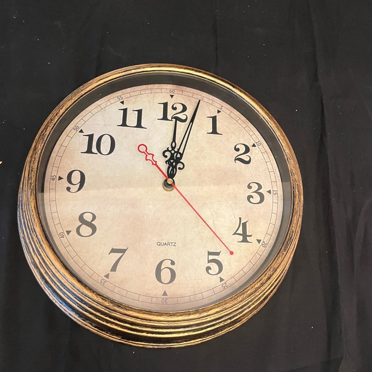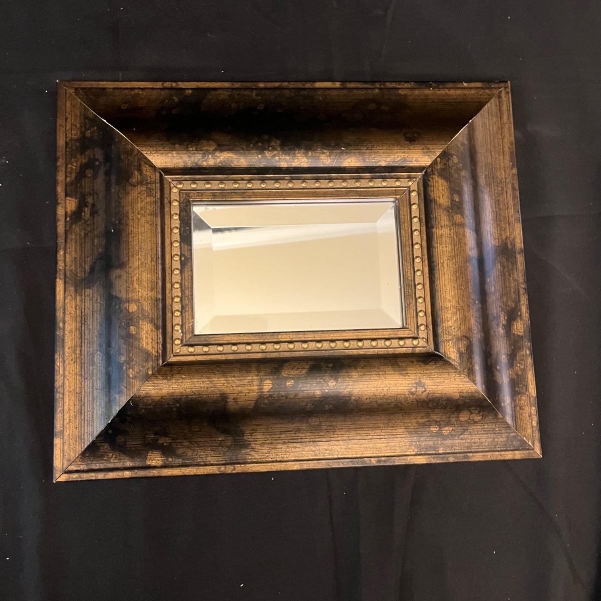 Lot includes two wooden framed beveled glass mirrors and a round plastic quartz wall clock that was running when pictures were taken of it. Largest frame 23.5” x 27.5”H.
