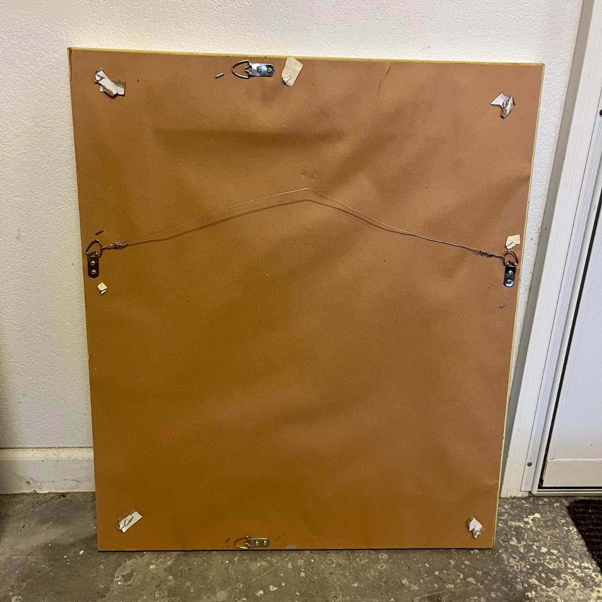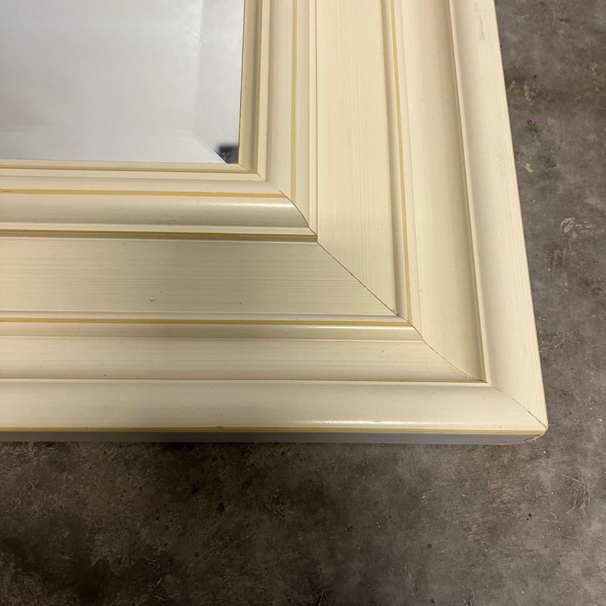 These two mirrors both have beveled glass with one decorated with a floral design. Largest frame measures 24” x 29” x 1.5”.