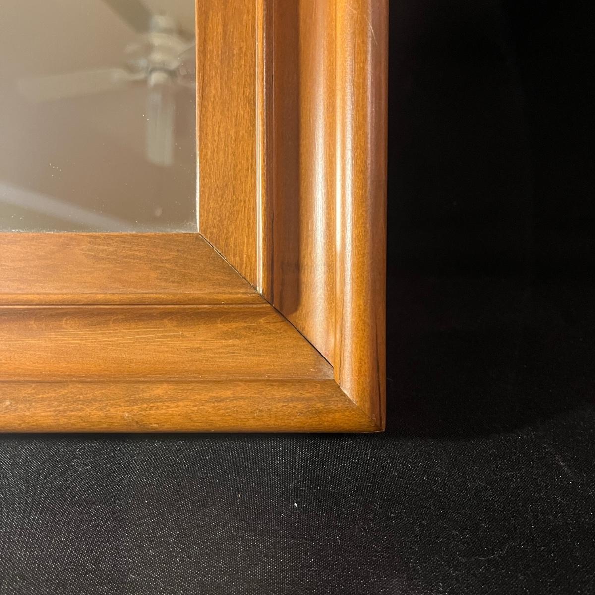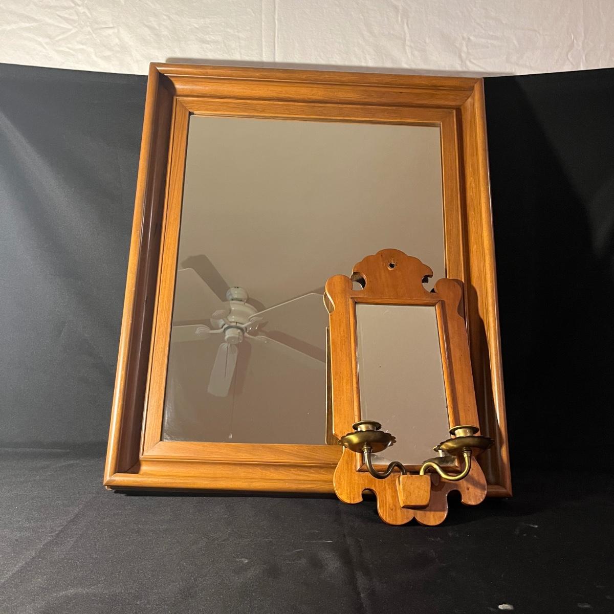 Lot includes a wood framed mirror with two metal candleholders and a wooden framed mirror that measures 23” x 2” x 28”H.
