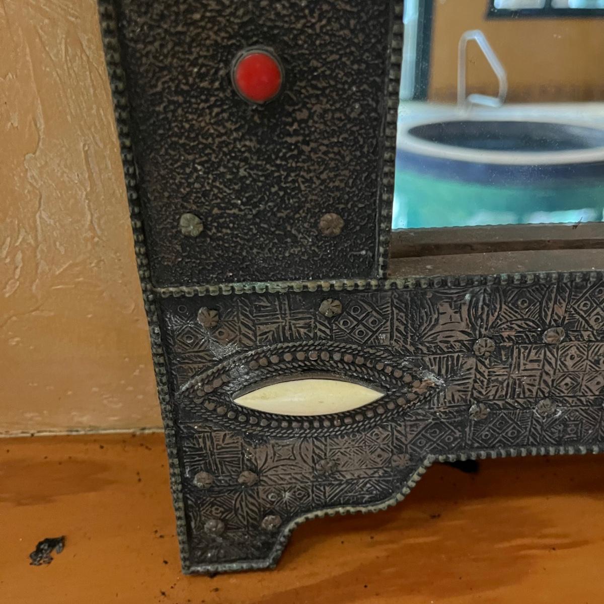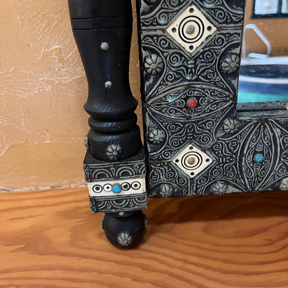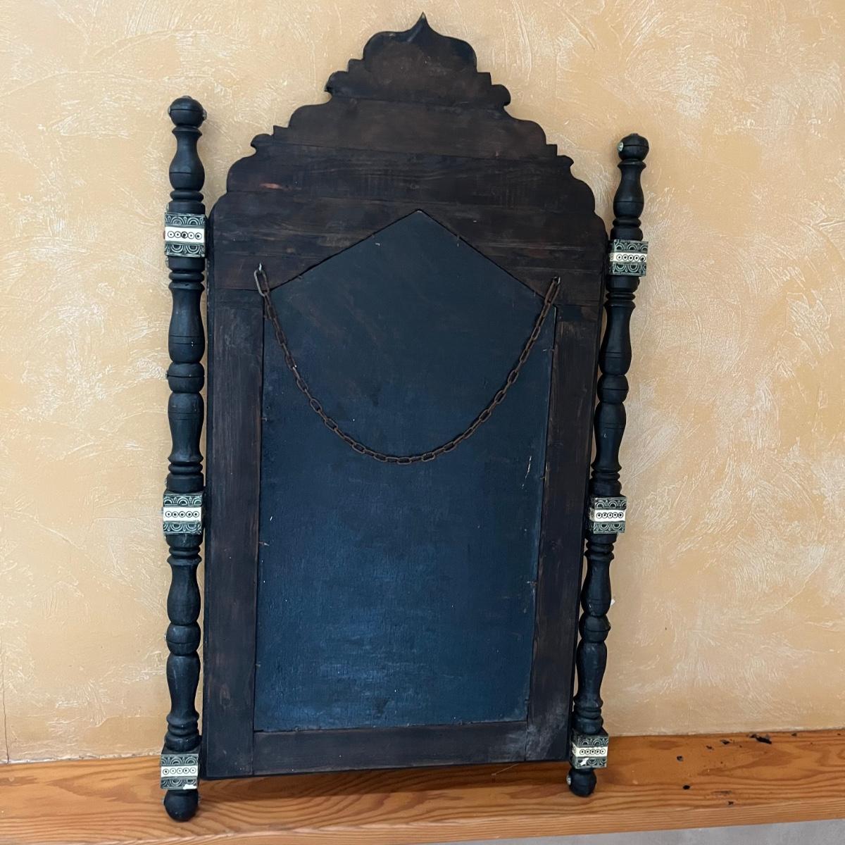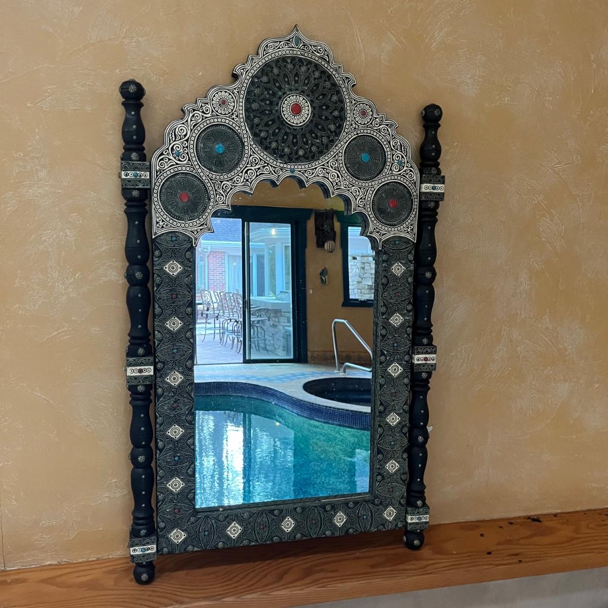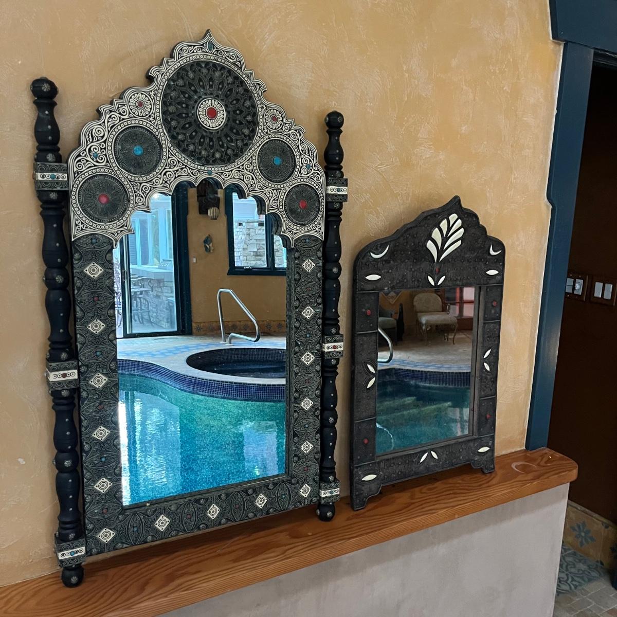 Lot includes two Moroccan style wooden mirrors with with a decorative painted and what appears to be carved design. The white looks like inlaid bone, but of course we cannot guarantee the materials which also included the blue and red stones. Larger mirror measures 25” x 2” x 42.5”H and smaller mirror measures 20” x .75” x 31”H. Smaller mirror has cloth on the back that is coming off and a few black spots on mirror, see pictures.