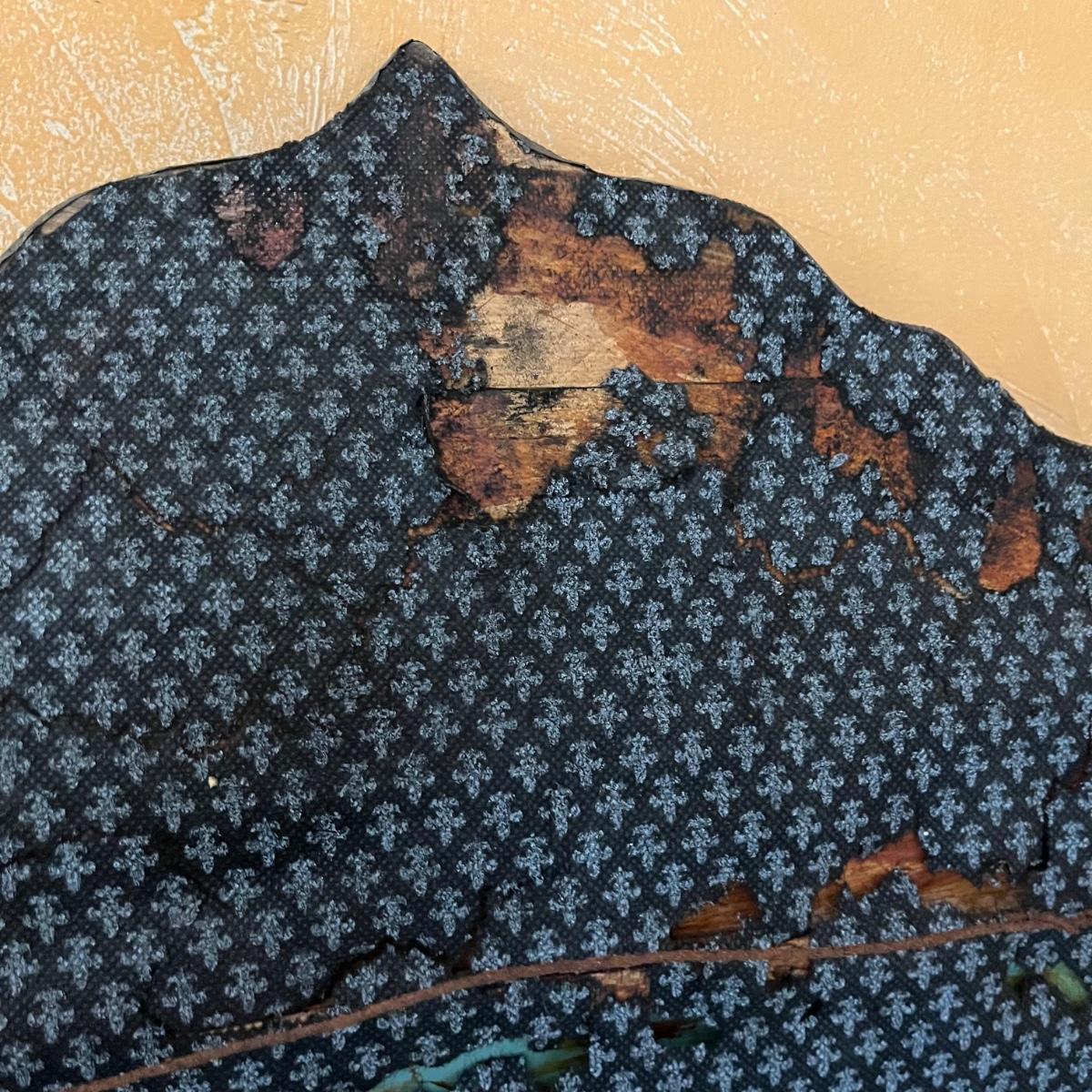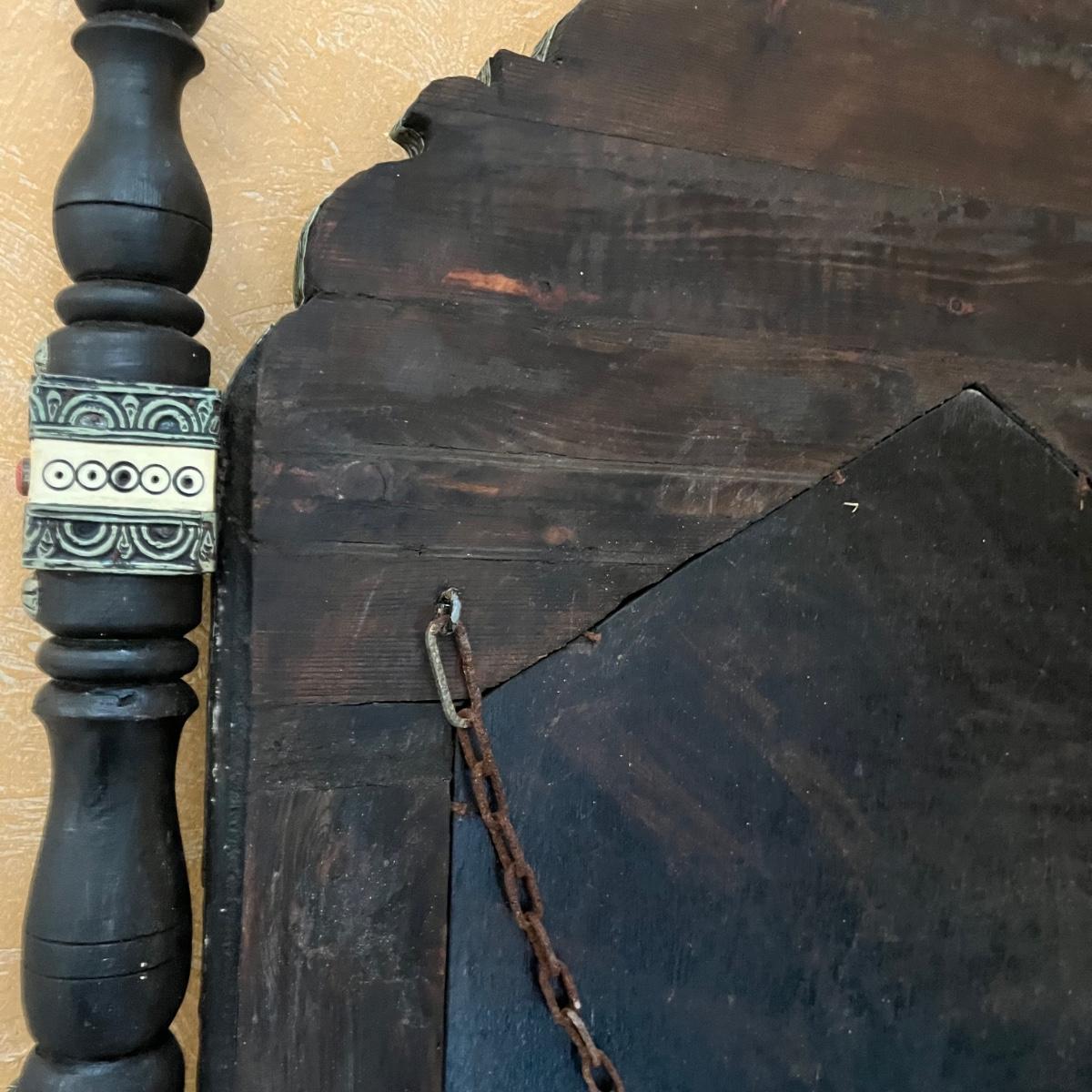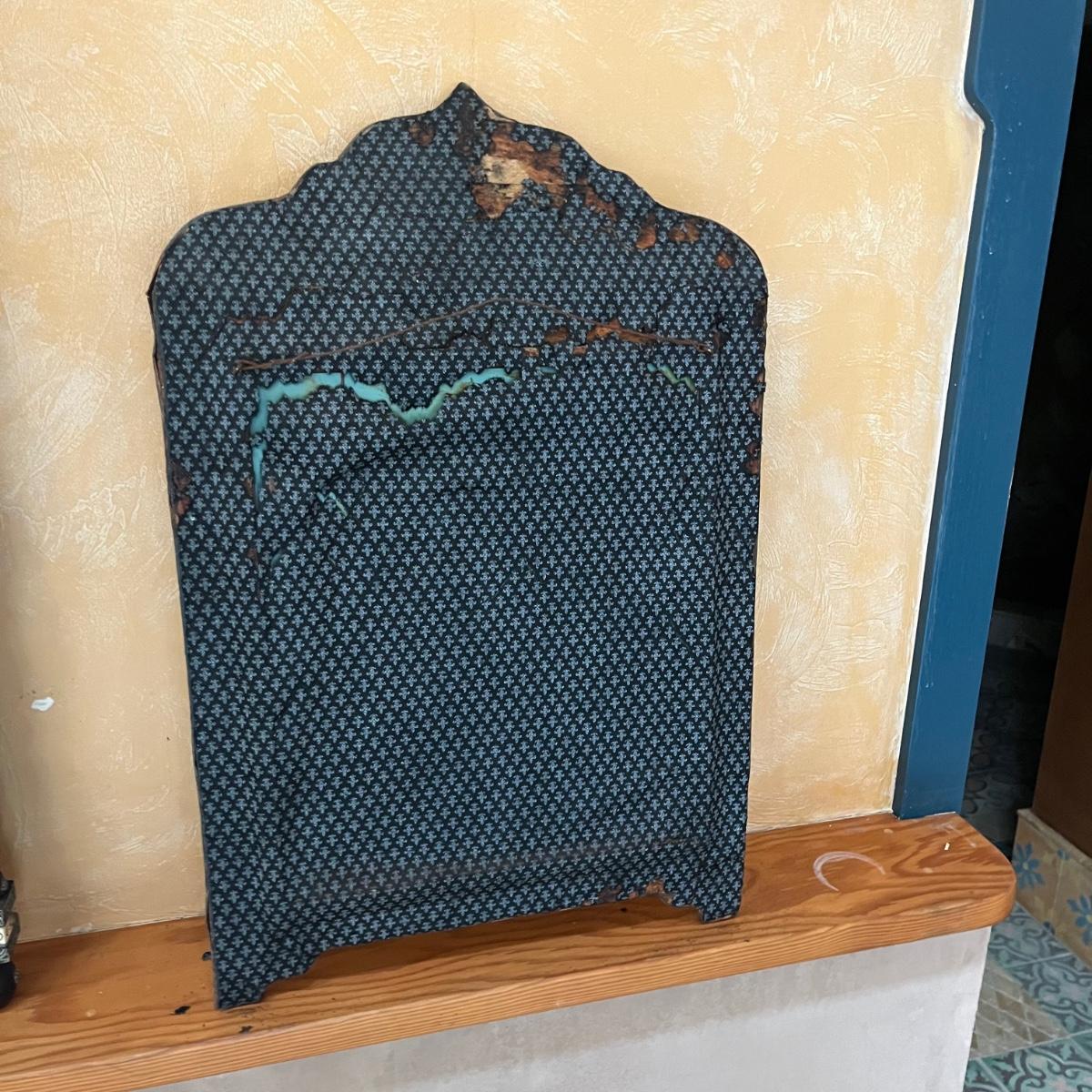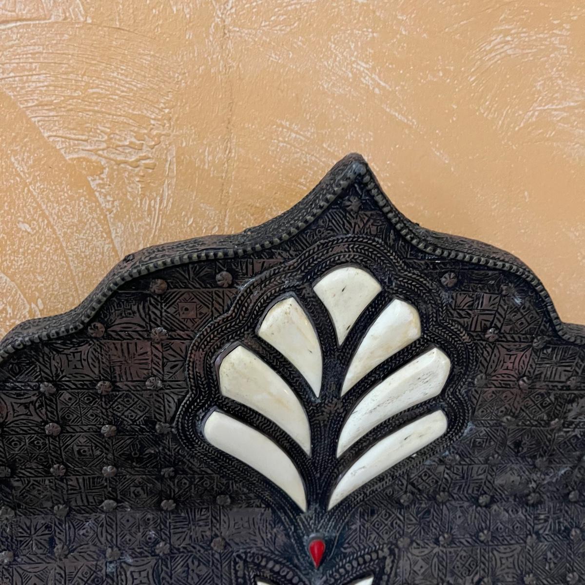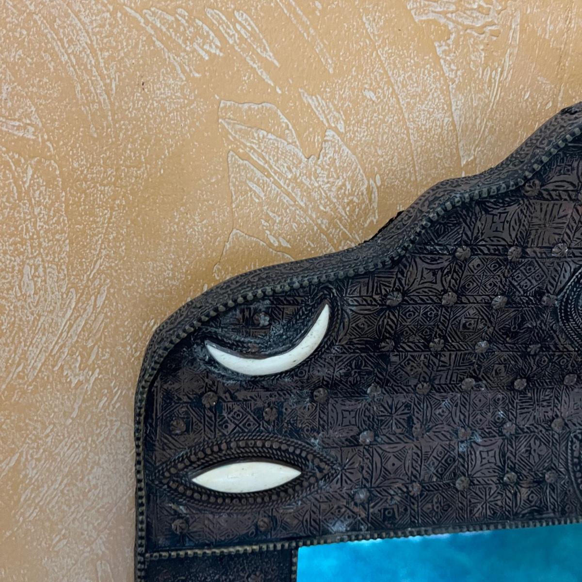 Lot includes two Moroccan style wooden mirrors with with a decorative painted and what appears to be carved design. The white looks like inlaid bone, but of course we cannot guarantee the materials which also included the blue and red stones. Larger mirror measures 25” x 2” x 42.5”H and smaller mirror measures 20” x .75” x 31”H. Smaller mirror has cloth on the back that is coming off and a few black spots on mirror, see pictures.