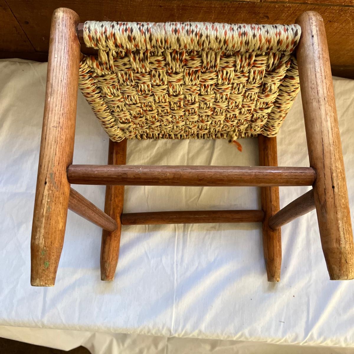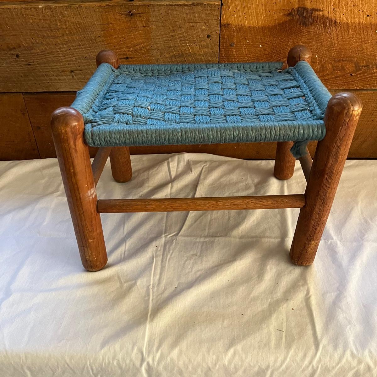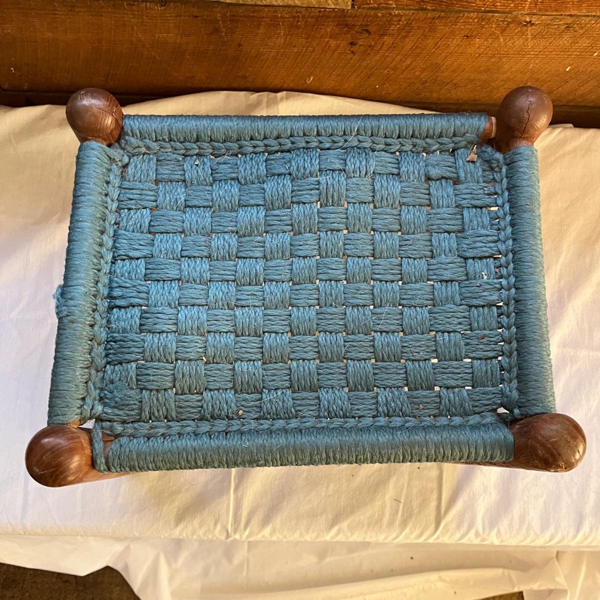 These two footrests both have wooden frames. One is blue and the other is a neutral tri-color. Blue piece measures 15” x 11” x 10.5”.