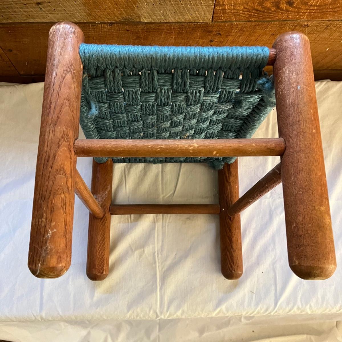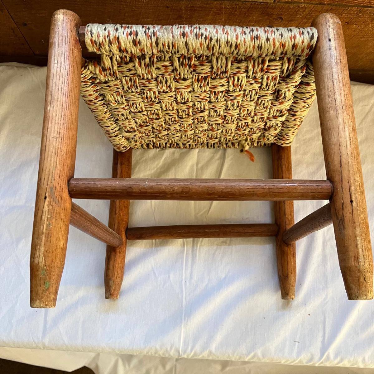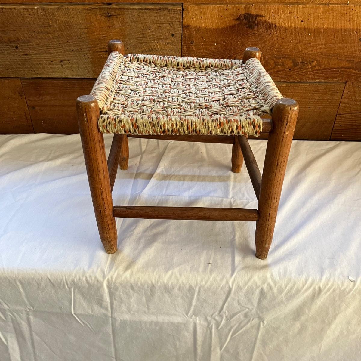 These two footrests both have wooden frames. One is blue and the other is a neutral tri-color. Blue piece measures 15” x 11” x 10.5”.
