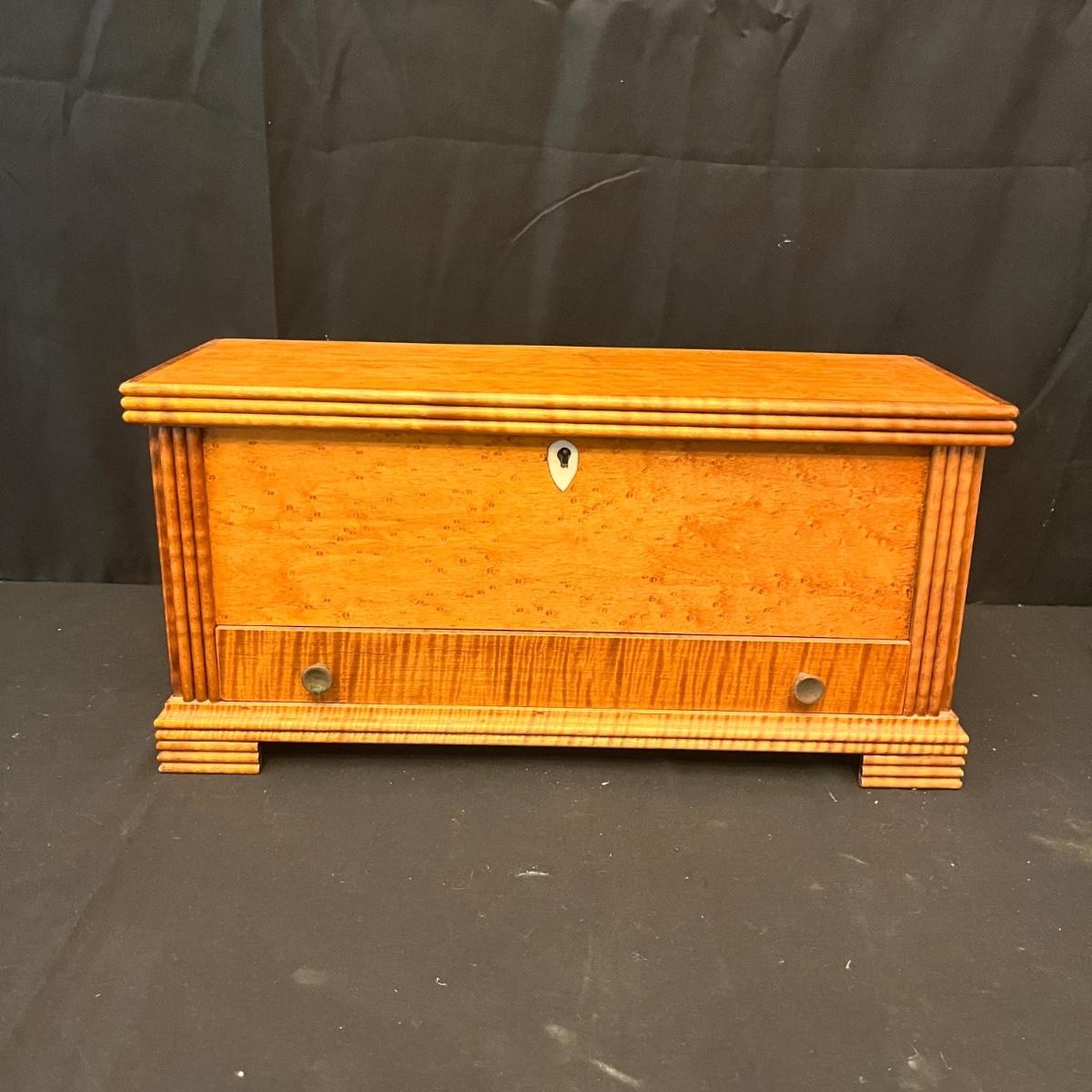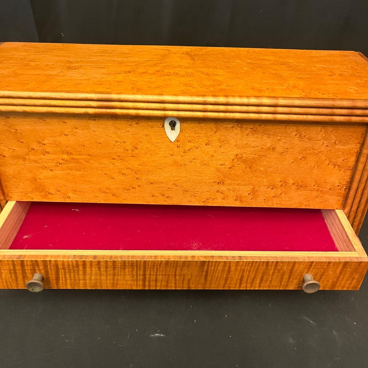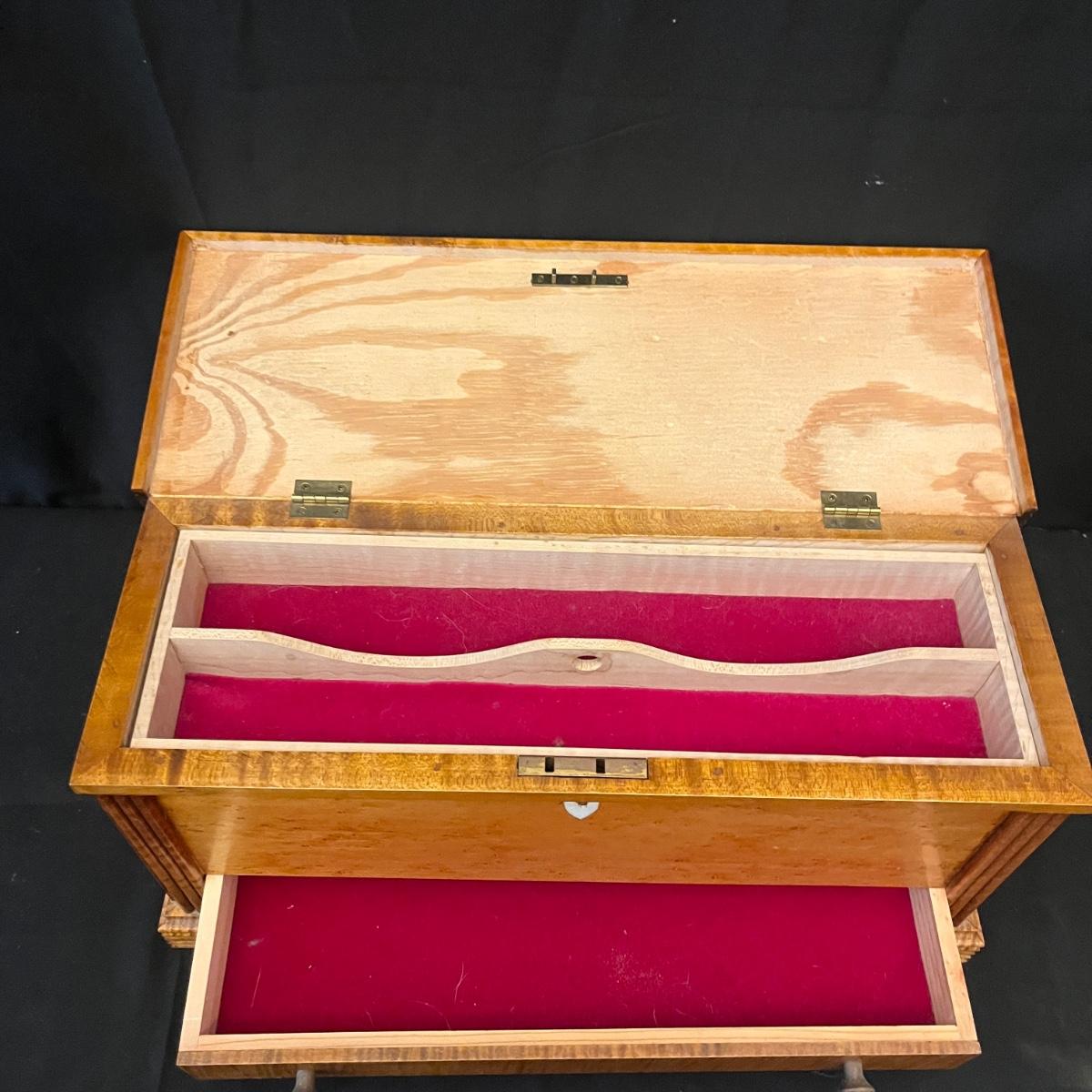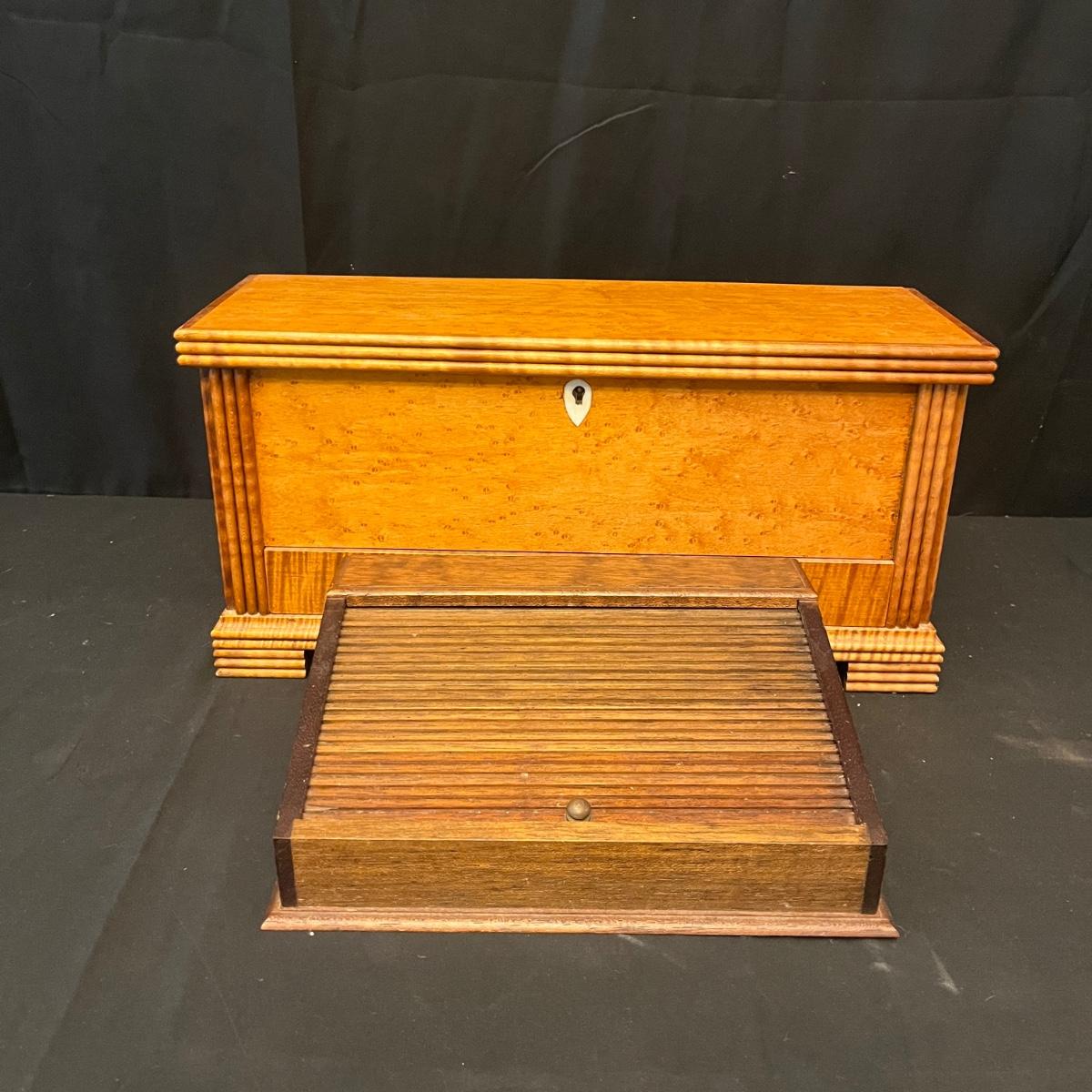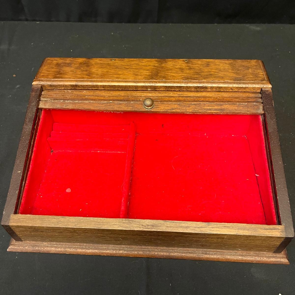 Lot includes a locking wooden jewelry box with drawer on bottom. Also includes a wooden jewelry box with roll top style top. Includes key. Largest box measures 16” x 6” x 8”H.