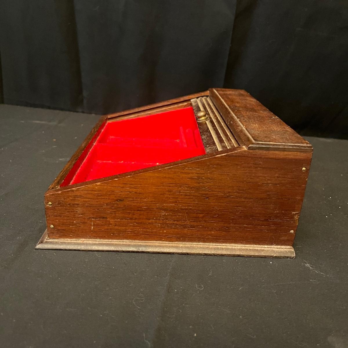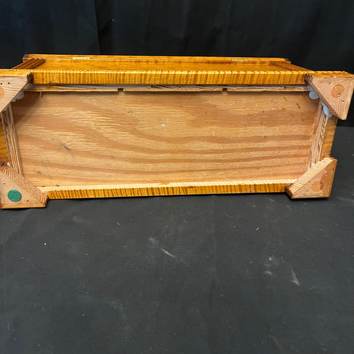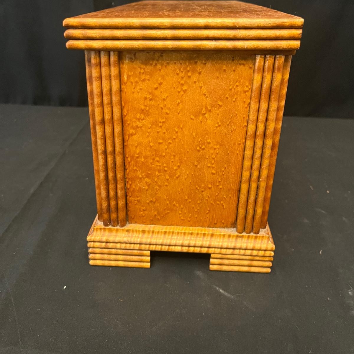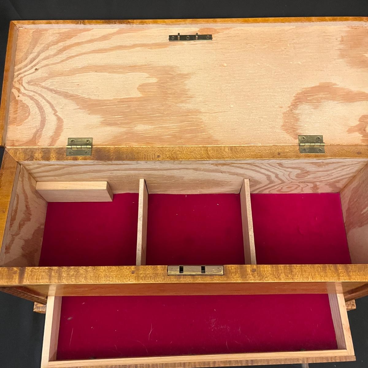 Lot includes a locking wooden jewelry box with drawer on bottom. Also includes a wooden jewelry box with roll top style top. Includes key. Largest box measures 16” x 6” x 8”H.