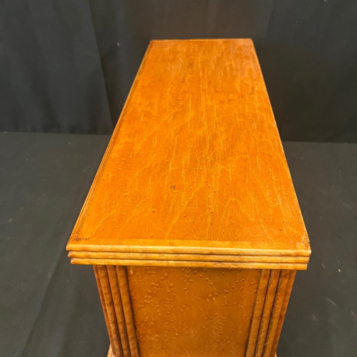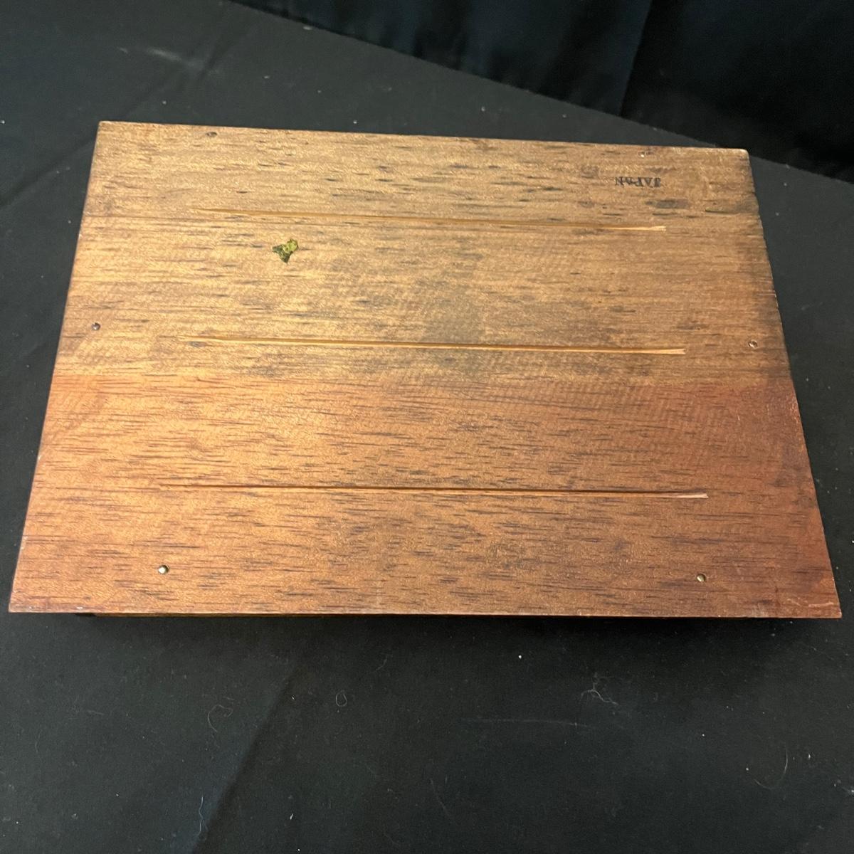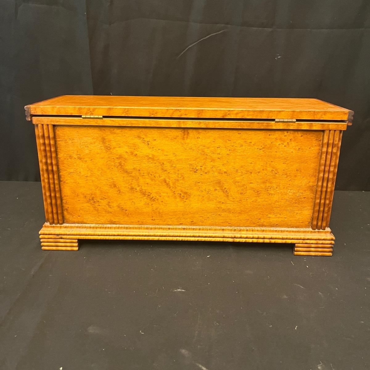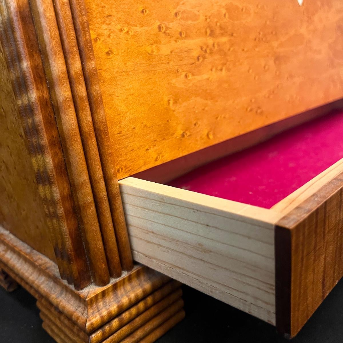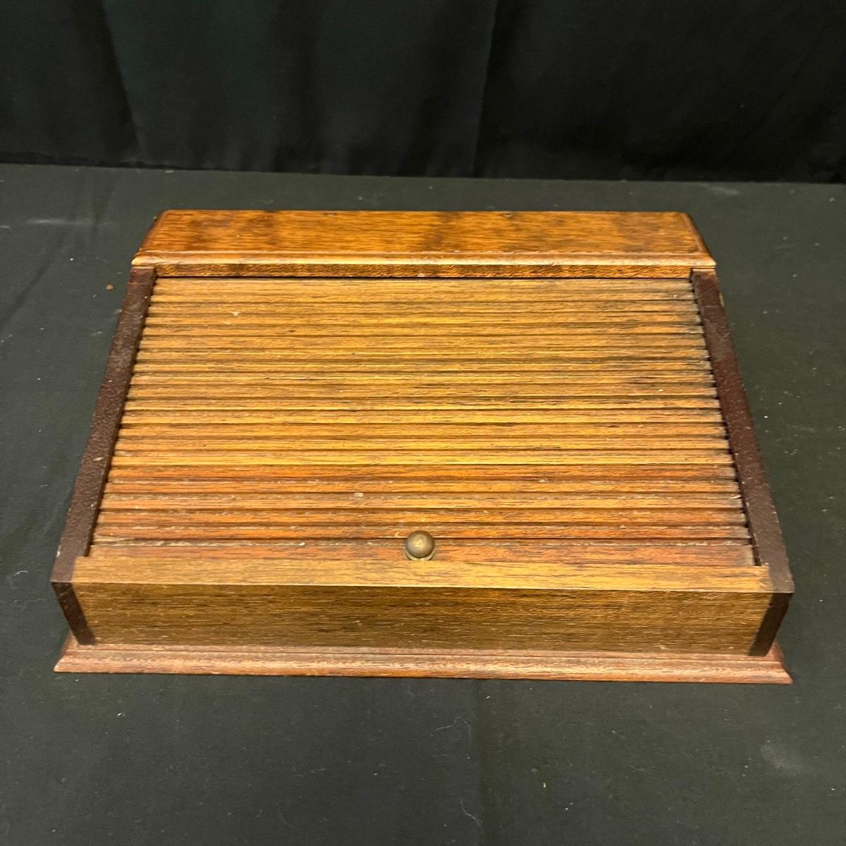 Lot includes a locking wooden jewelry box with drawer on bottom. Also includes a wooden jewelry box with roll top style top. Includes key. Largest box measures 16” x 6” x 8”H.