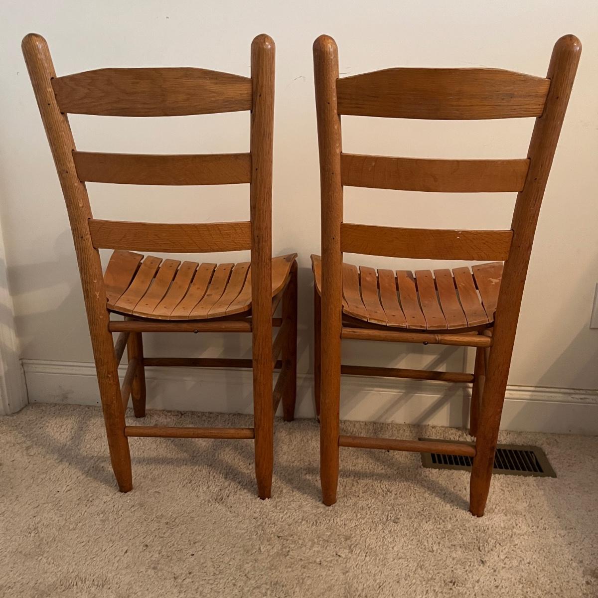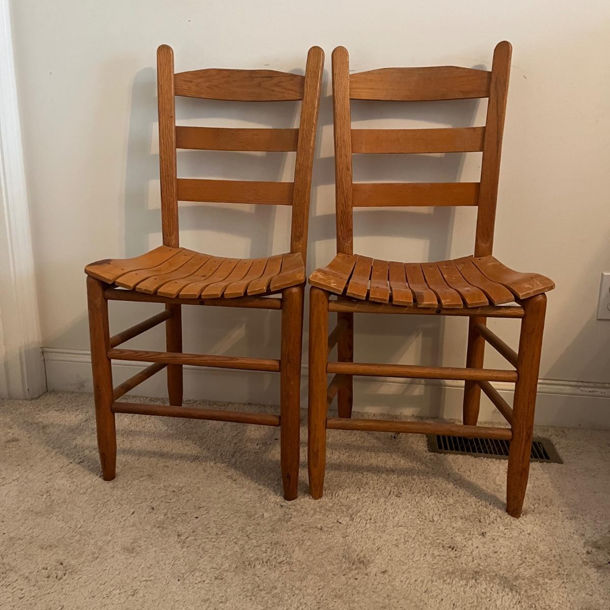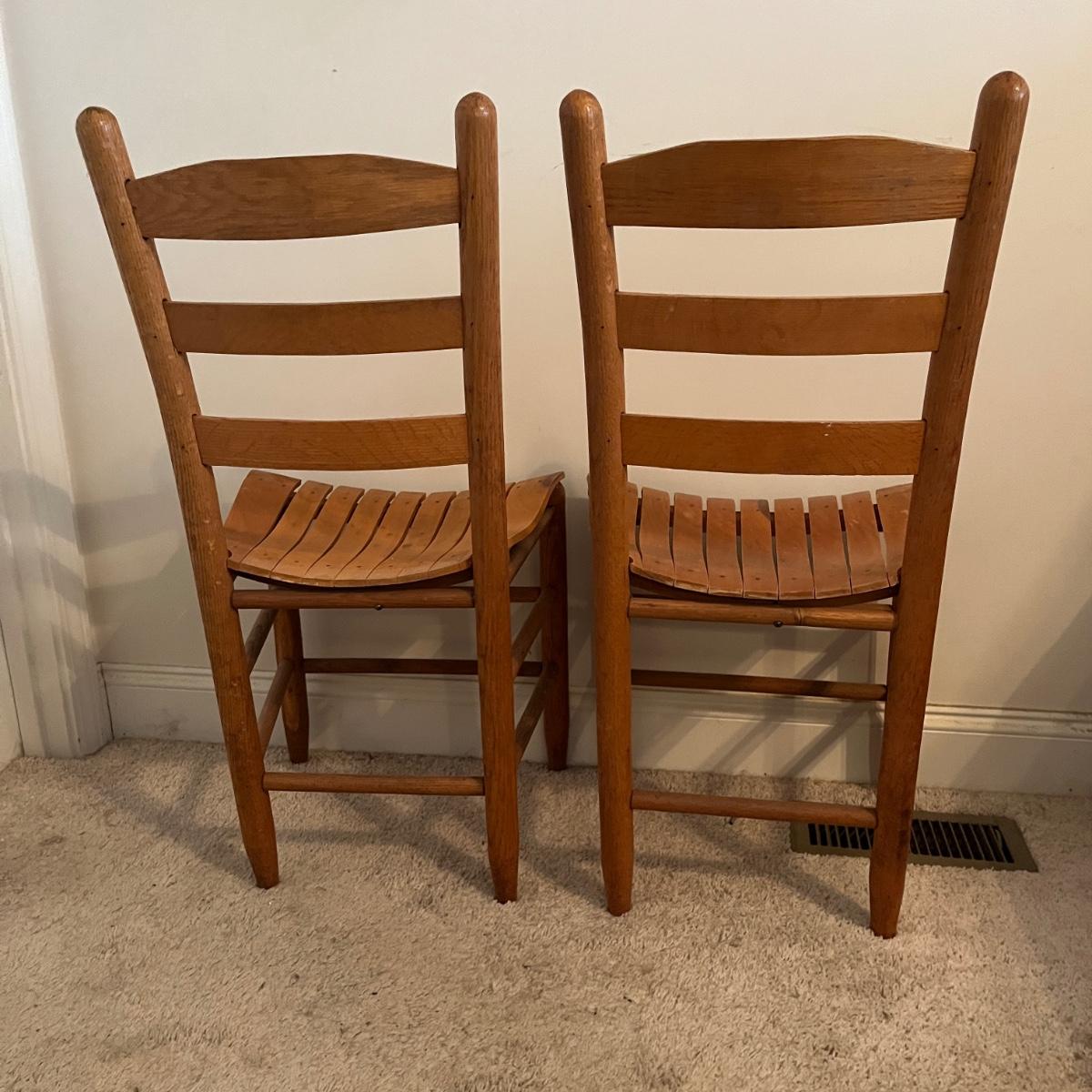 Lot includes two matching wooden ladder back chairs that measure 16” x 16” x 36”H with a 16.5”seat height.