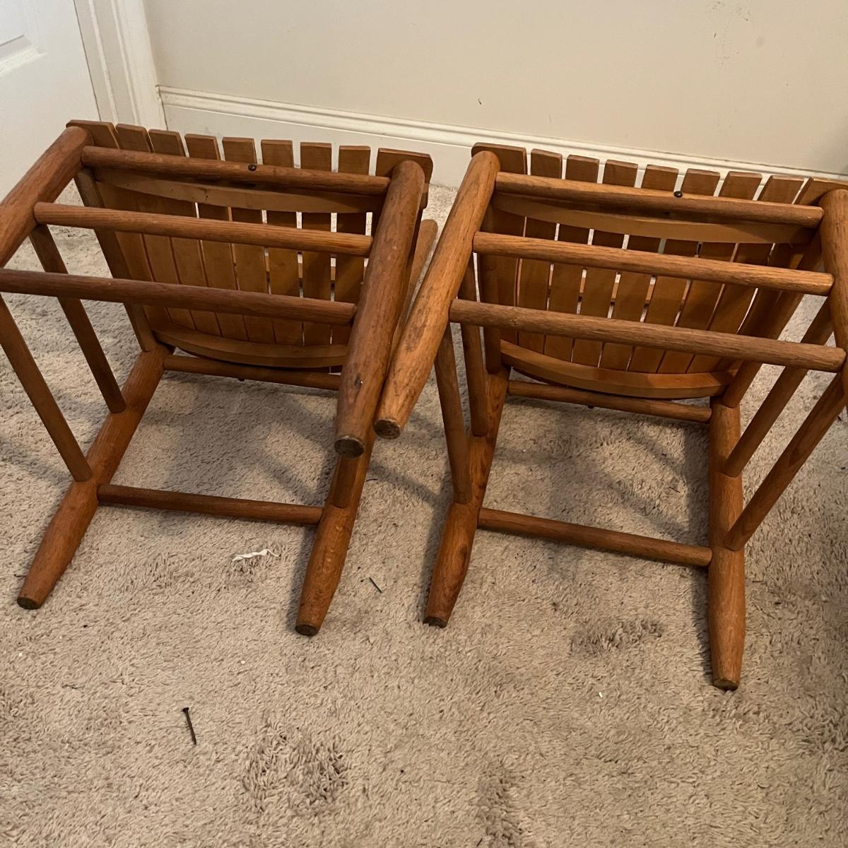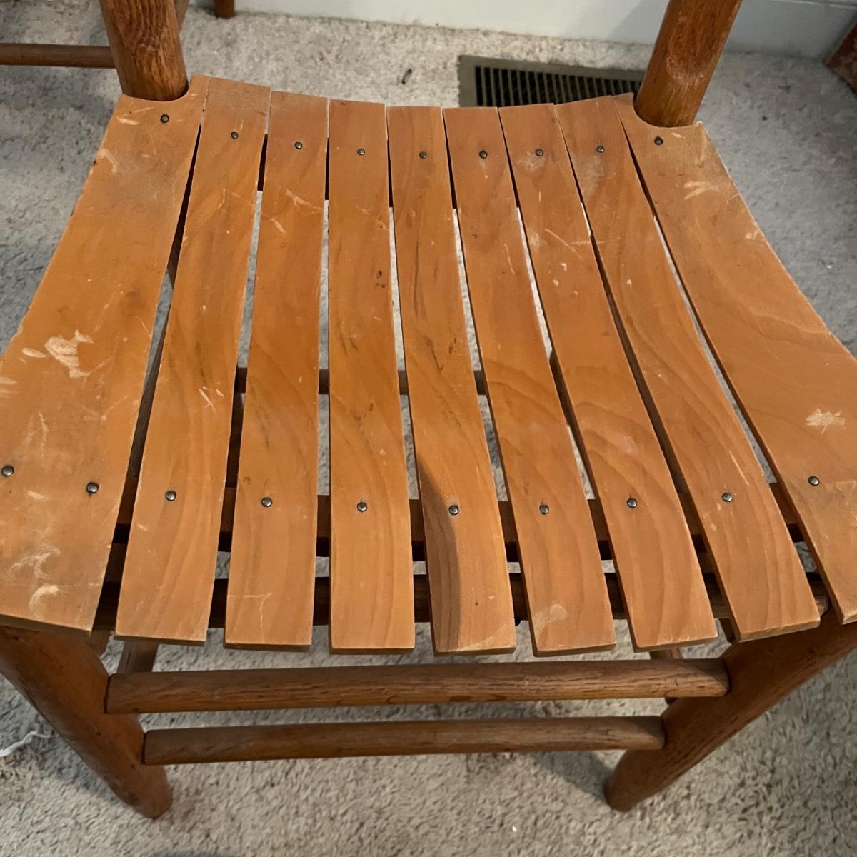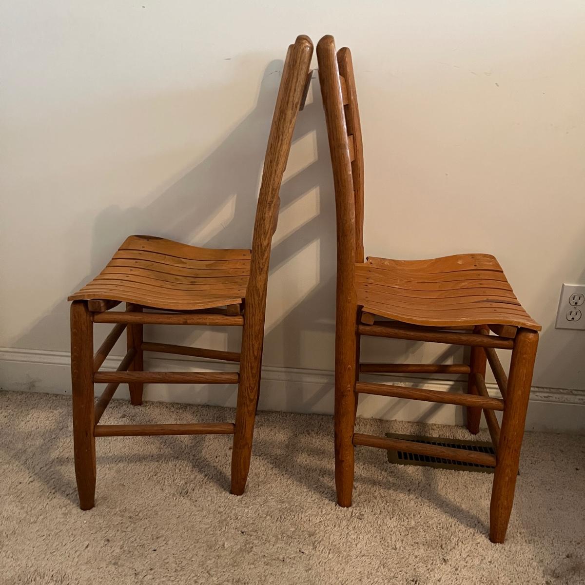 Lot includes two matching wooden ladder back chairs that measure 16” x 16” x 36”H with a 16.5”seat height.