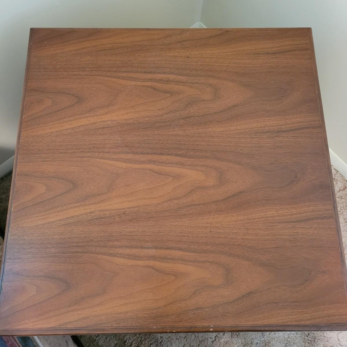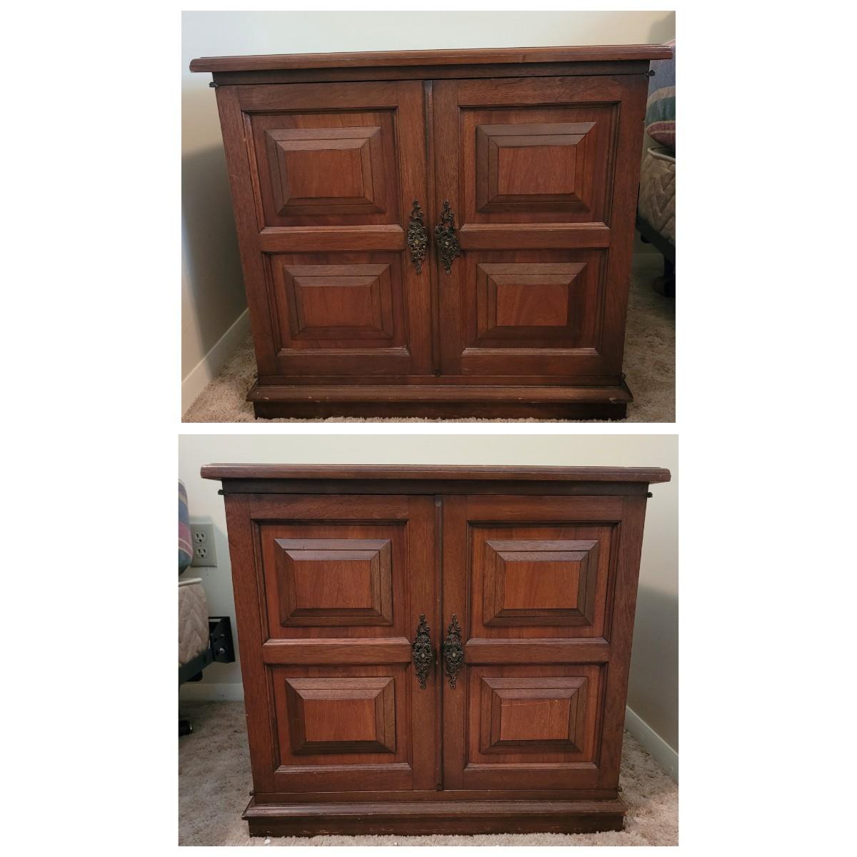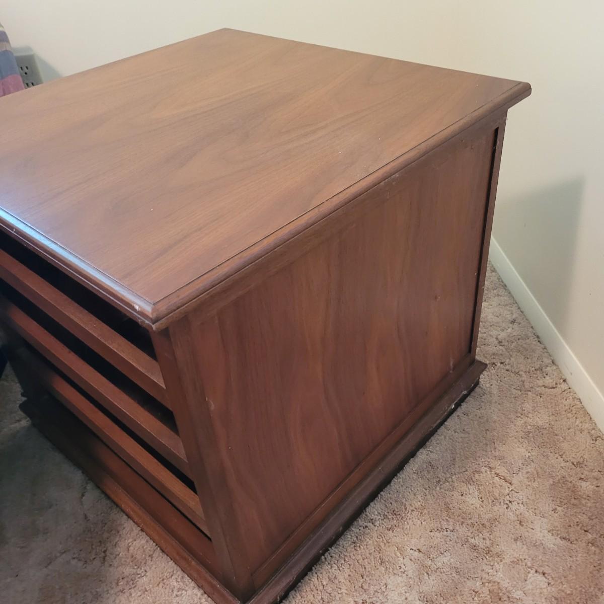 This lot includes two solid wood end tables or nightstands. On the outside, these tables are matching. On the interior however, the feature different styles of storage. One is open, and the other is slotted with dividers for records, books or magazines. Both tables have magnetic cabinet doors and metal hardware. The sides of both pieces are slotted to allow views of the interior from outside. Individually, the tables measure 25" x 25" x 20"H.