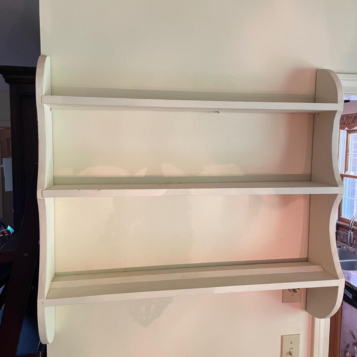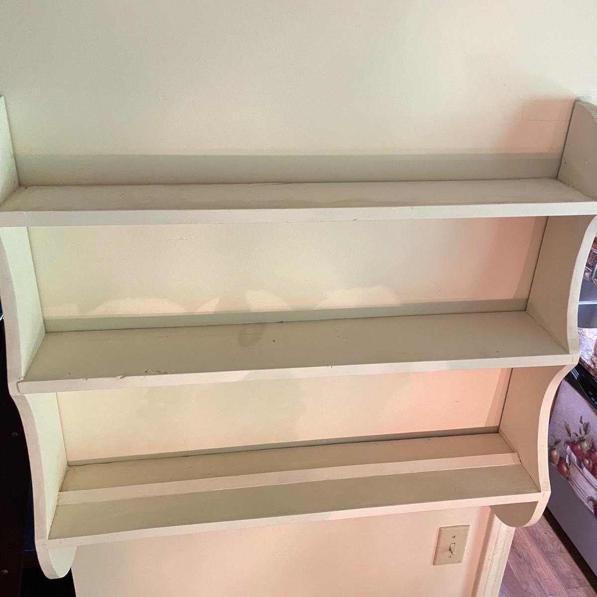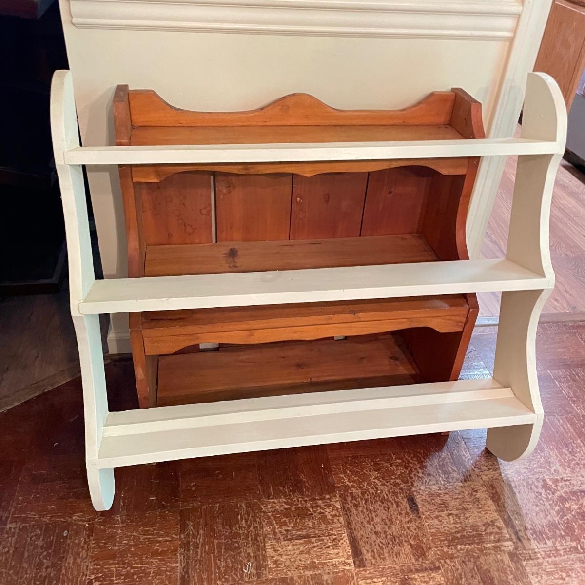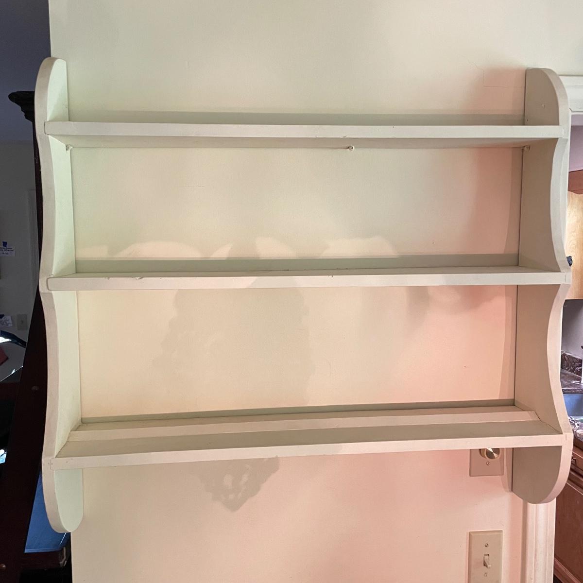 One white, one natural color wooden shelf units for display or storage. White piece has stylized curved sides, three shelves and cup hooks under bottom shelf (the bottom shelf also has a plate ledge). A few chips were inevitably made while removing from the wall. Measures 34" x 7" x 32"H. Colonial style wood piece has two shelves and small top display area, measures 27.5" x 12.5" x 28"H. Some wear and tear on both items. See photos for details. Local pickup only.