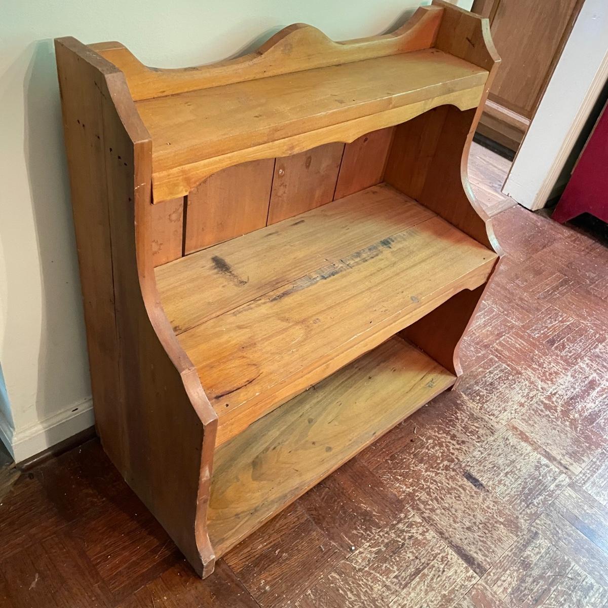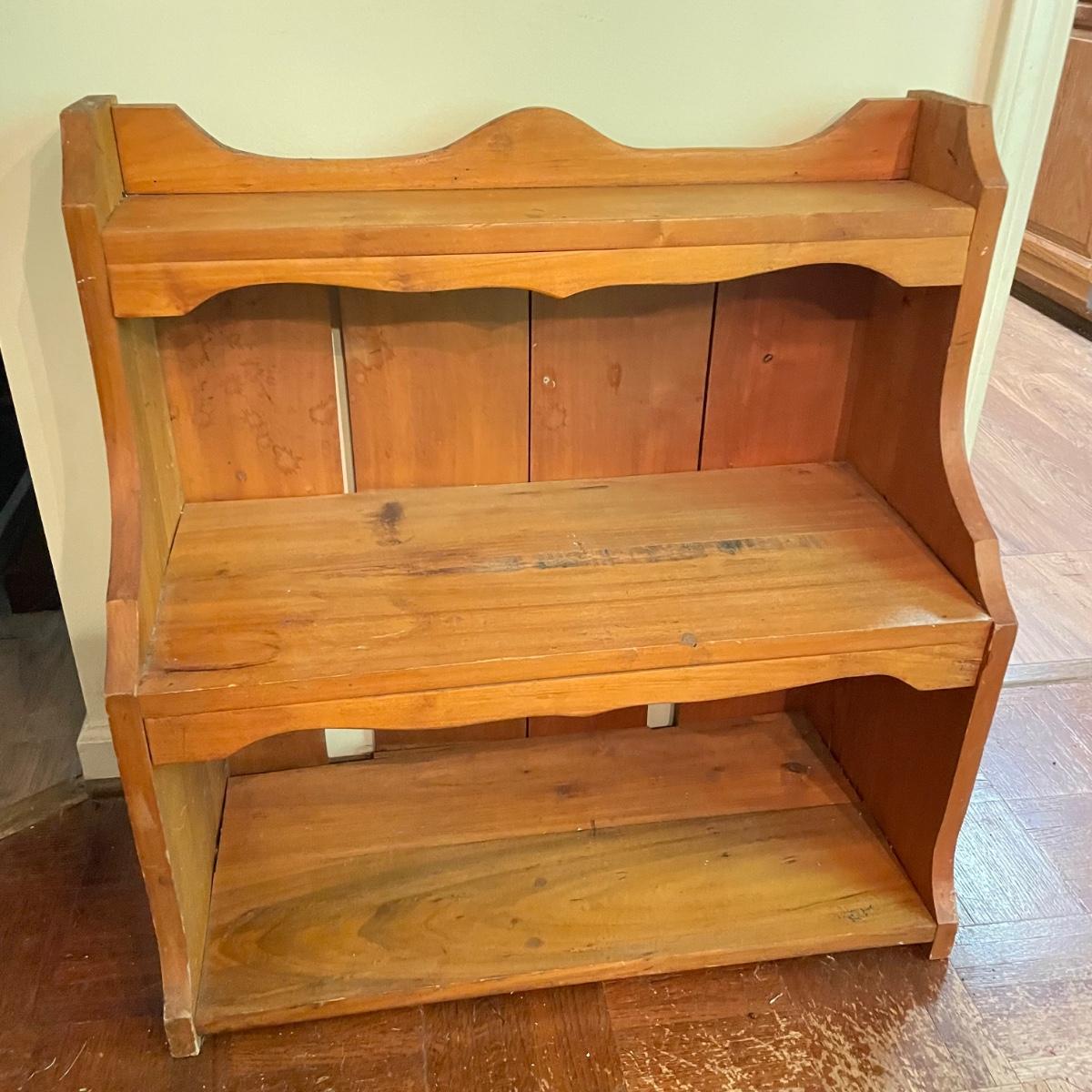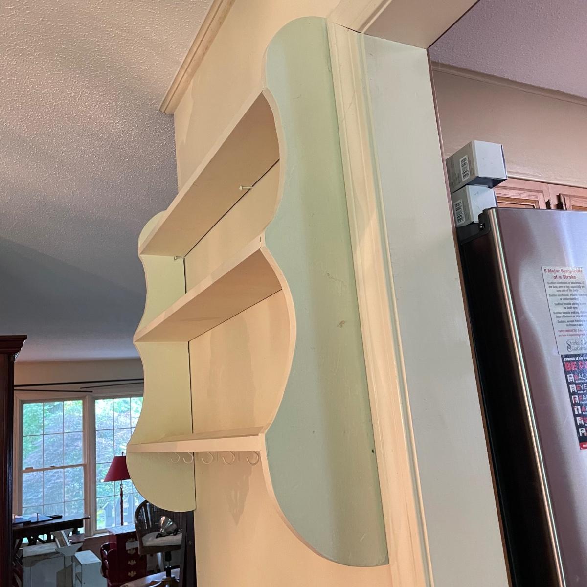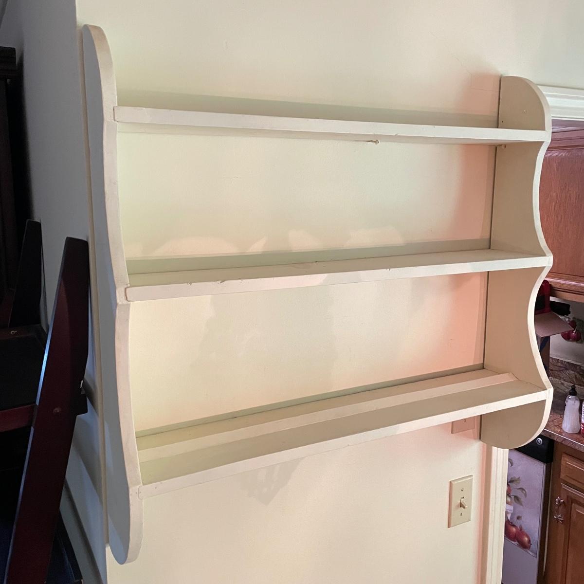 One white, one natural color wooden shelf units for display or storage. White piece has stylized curved sides, three shelves and cup hooks under bottom shelf (the bottom shelf also has a plate ledge). A few chips were inevitably made while removing from the wall. Measures 34" x 7" x 32"H. Colonial style wood piece has two shelves and small top display area, measures 27.5" x 12.5" x 28"H. Some wear and tear on both items. See photos for details. Local pickup only.