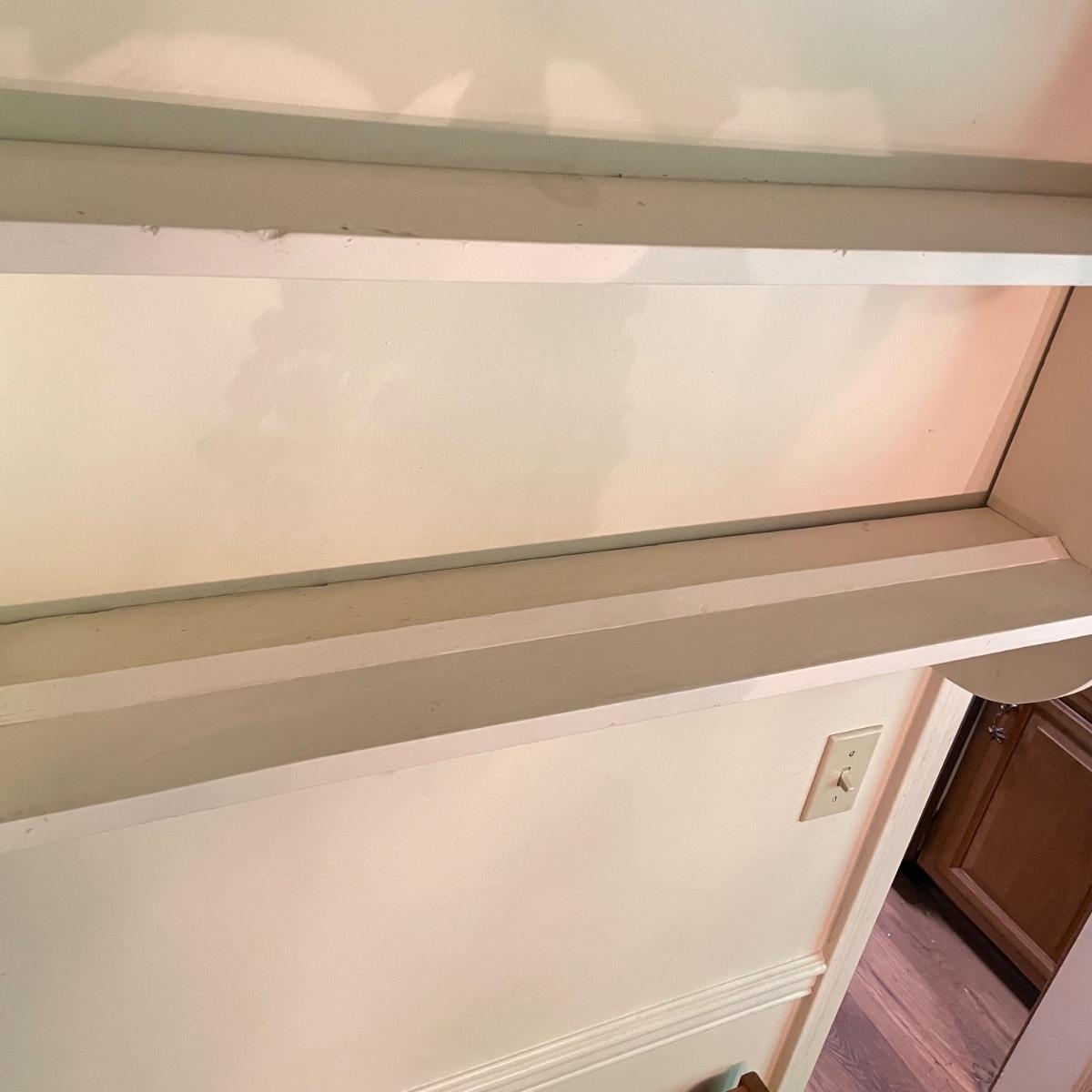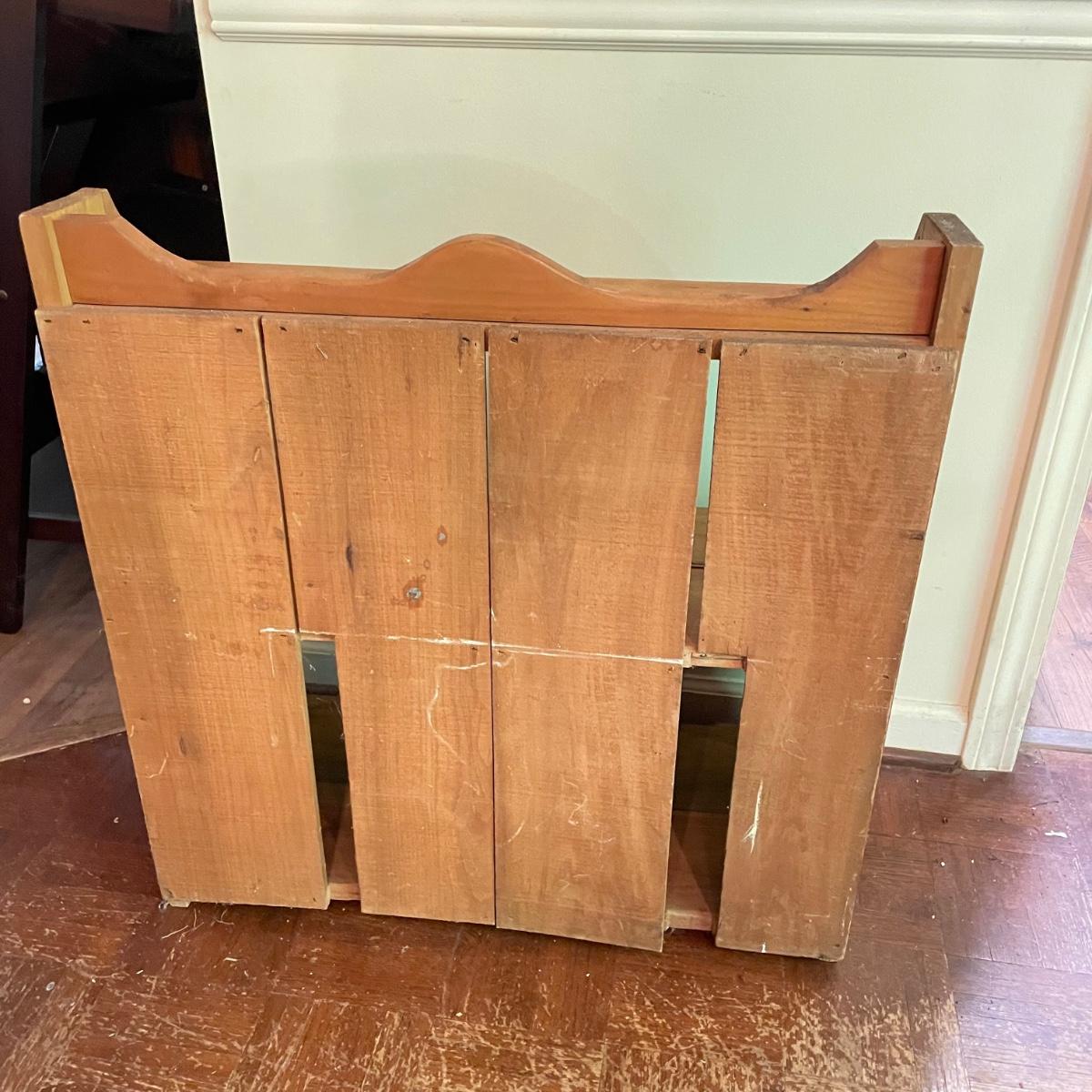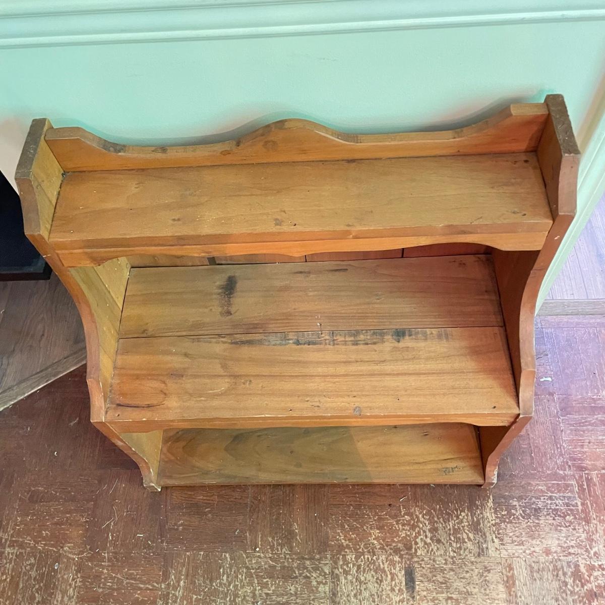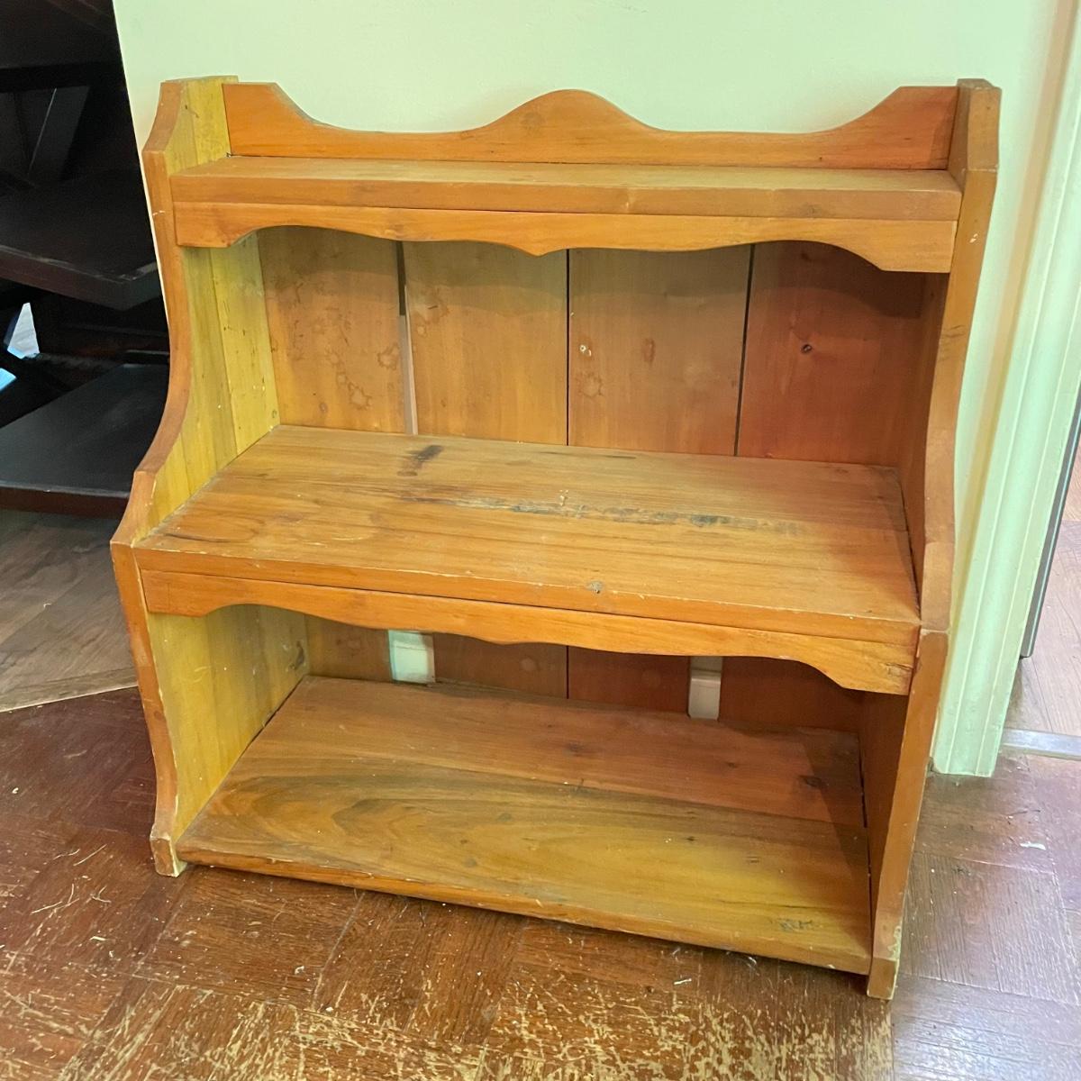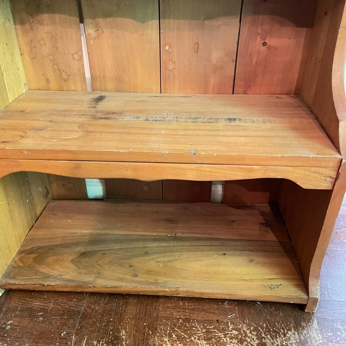 One white, one natural color wooden shelf units for display or storage. White piece has stylized curved sides, three shelves and cup hooks under bottom shelf (the bottom shelf also has a plate ledge). A few chips were inevitably made while removing from the wall. Measures 34" x 7" x 32"H. Colonial style wood piece has two shelves and small top display area, measures 27.5" x 12.5" x 28"H. Some wear and tear on both items. See photos for details. Local pickup only.
