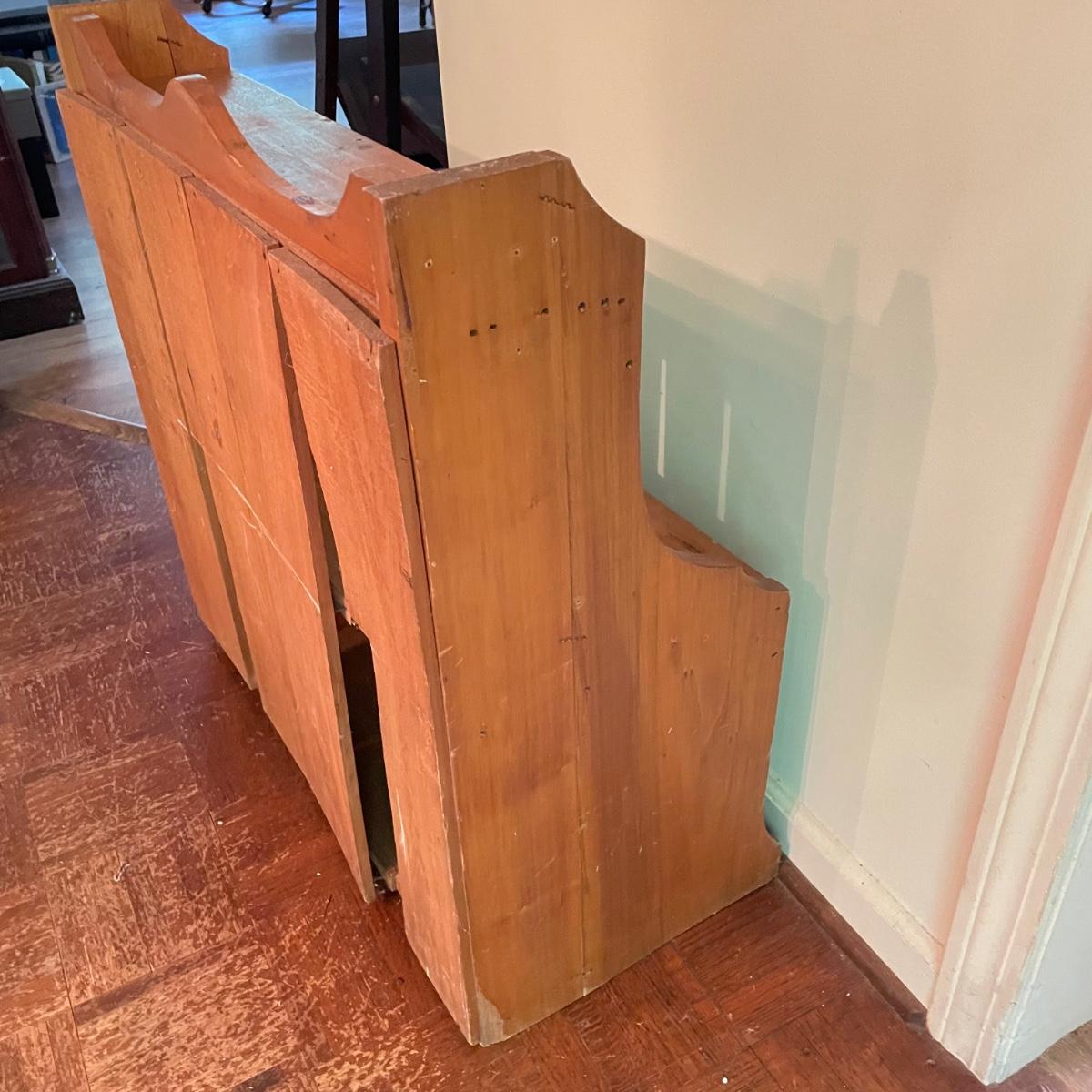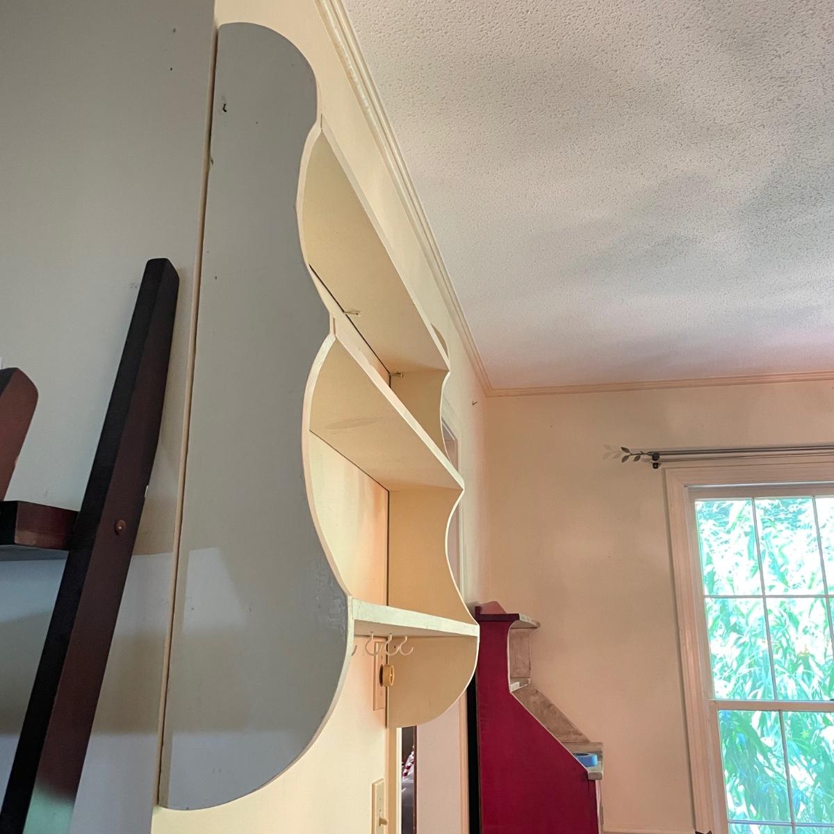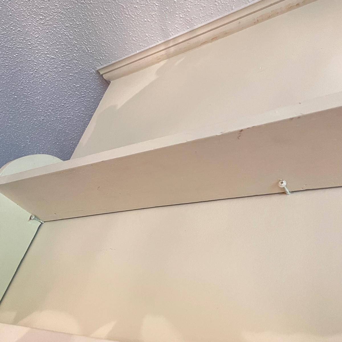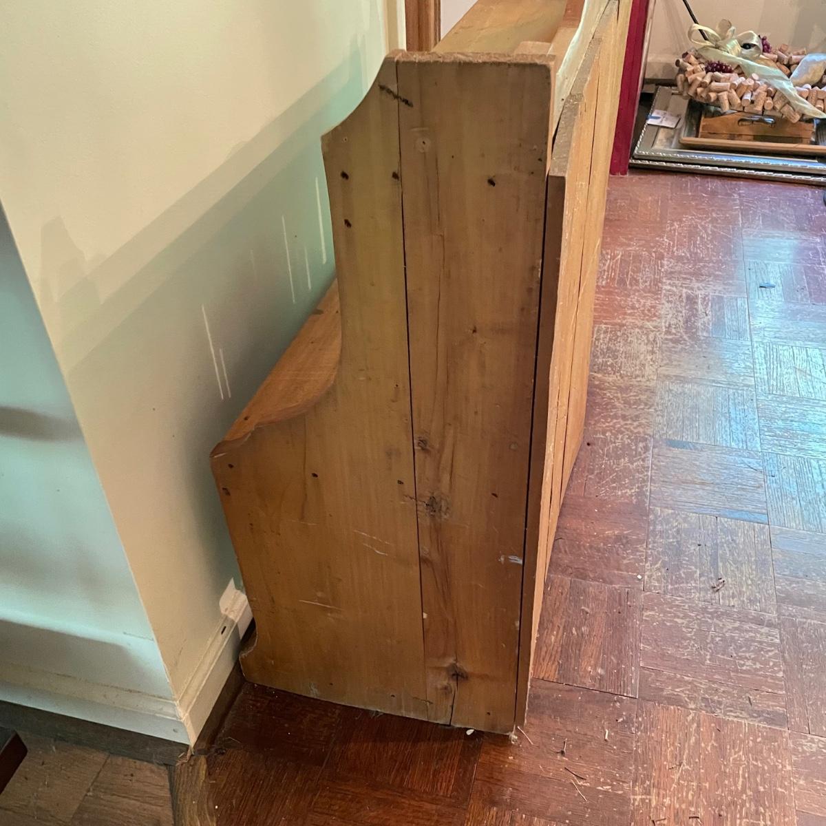 One white, one natural color wooden shelf units for display or storage. White piece has stylized curved sides, three shelves and cup hooks under bottom shelf (the bottom shelf also has a plate ledge). A few chips were inevitably made while removing from the wall. Measures 34" x 7" x 32"H. Colonial style wood piece has two shelves and small top display area, measures 27.5" x 12.5" x 28"H. Some wear and tear on both items. See photos for details. Local pickup only.