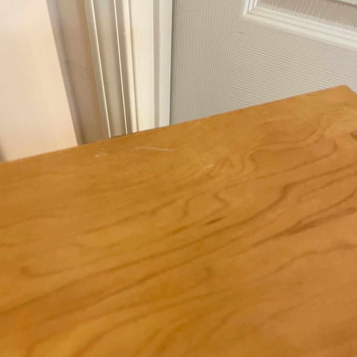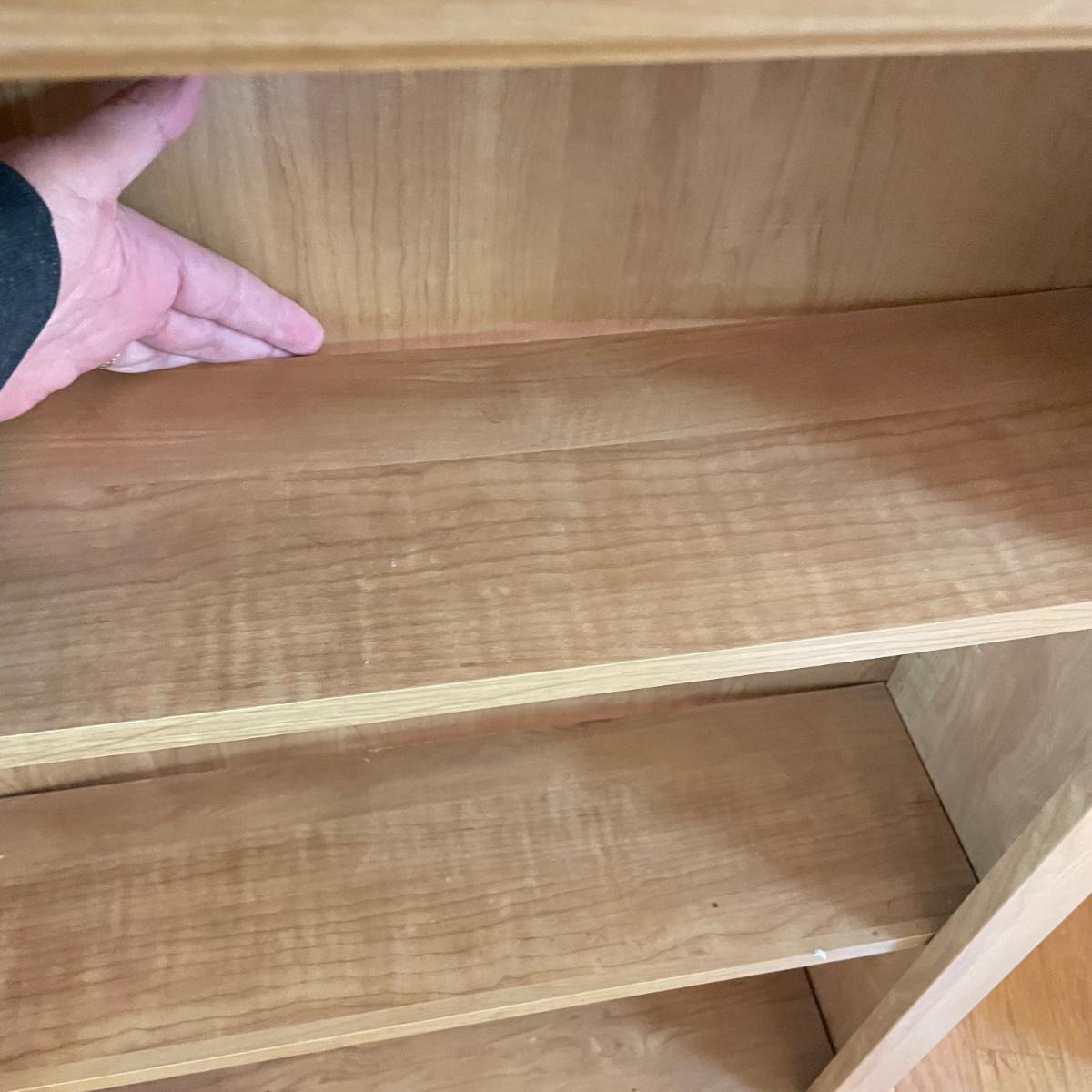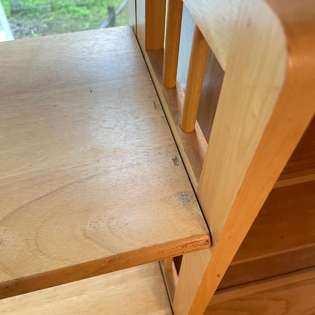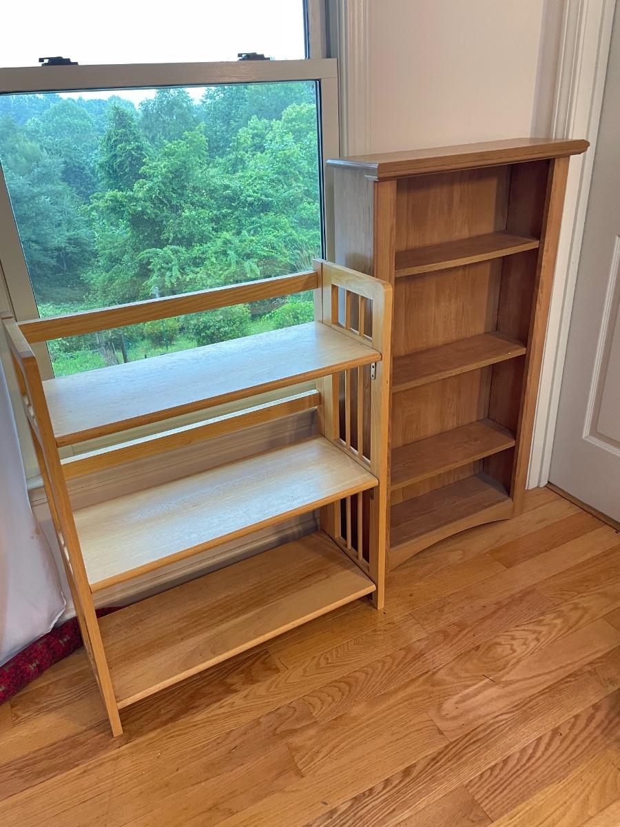 Two small shelf units. The collapsing shelf appears to be solid wood and is heavier than it looks. The taller unit appears to be pressed wood, it measures 24” x 8” x 42.5”H. The back on that piece is heavy duty cardboard and has bowed out. All three middle shelves are height adjustable. See images. Local pick up only. Items are located on the main floor with just one step down to access the driveway.