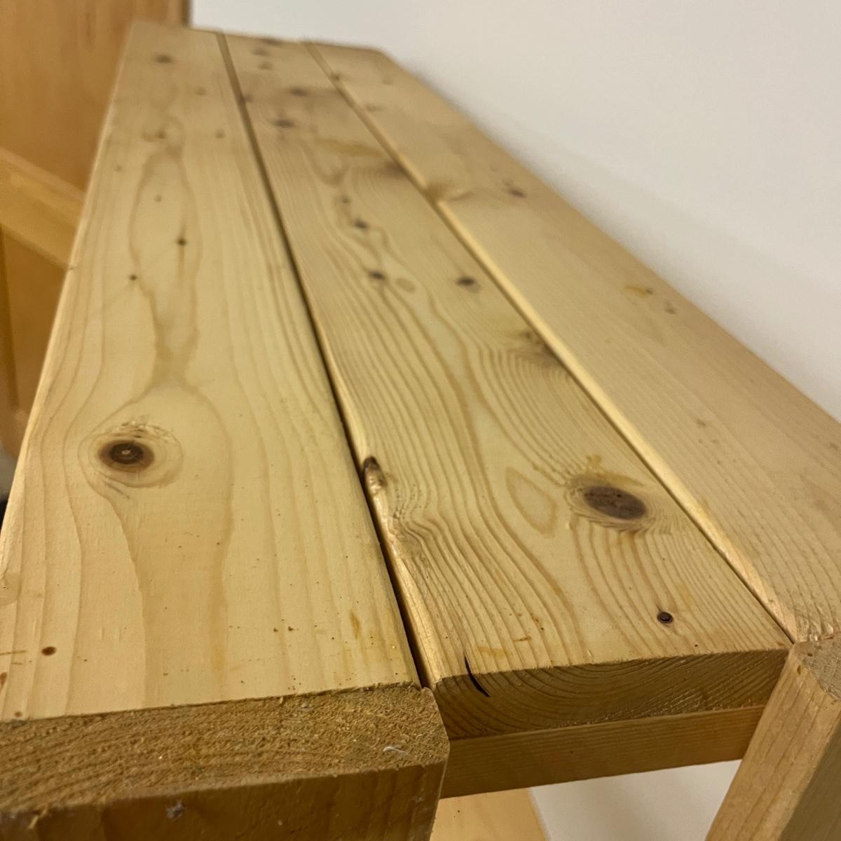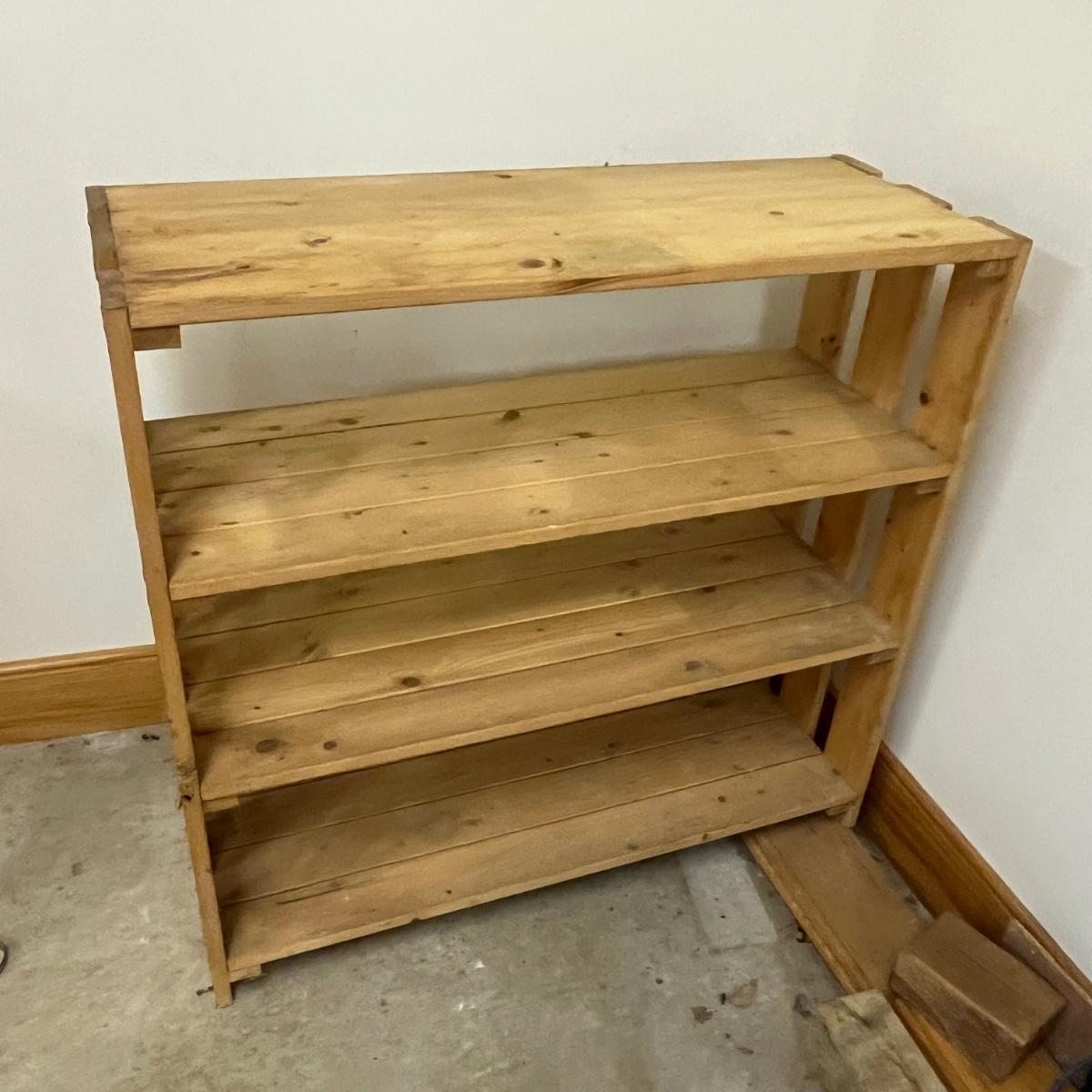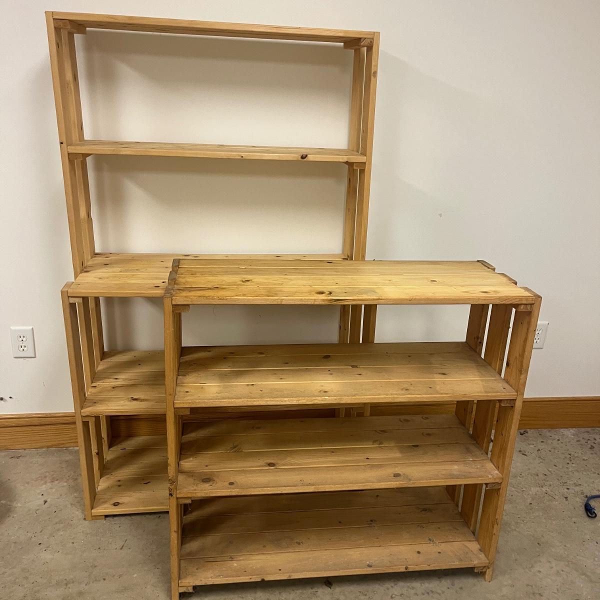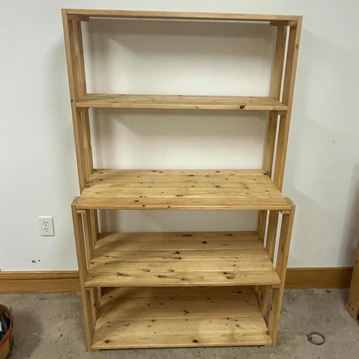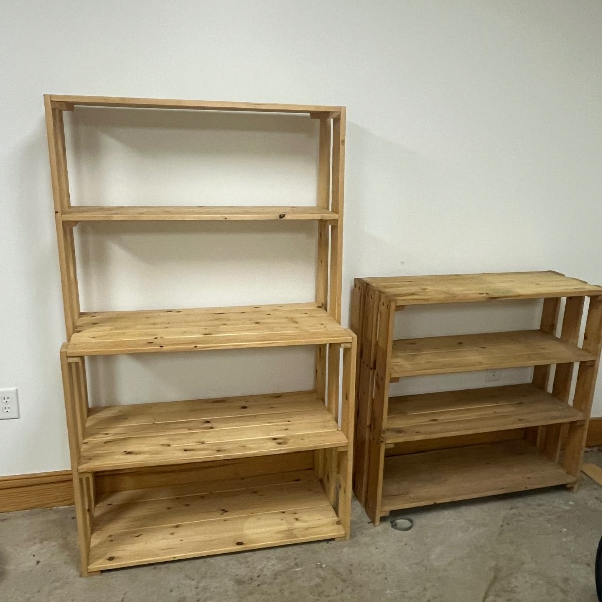 Lot includes a two tiered wooden shelving unit that measures 36.5” x 18” x 60”H and a smaller shelving unit that measures 36.5” x 14” x 35”H.