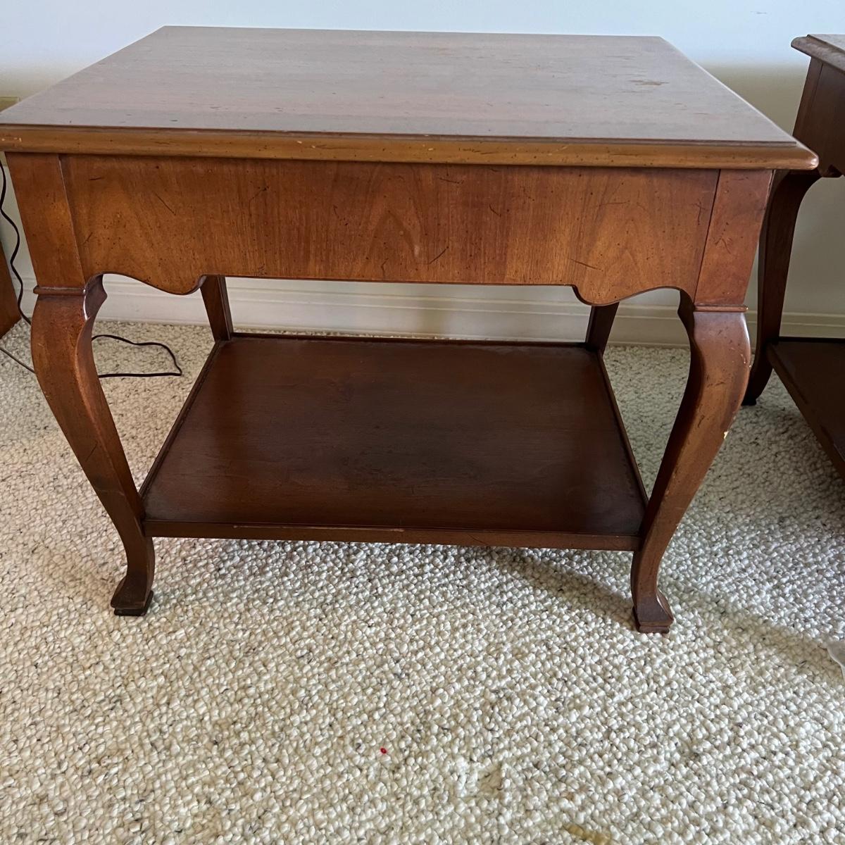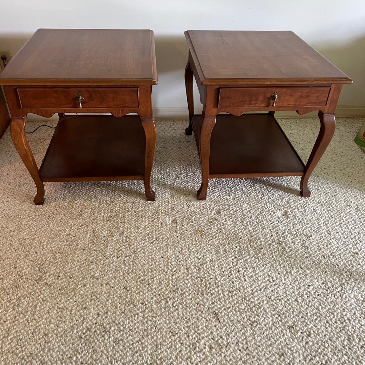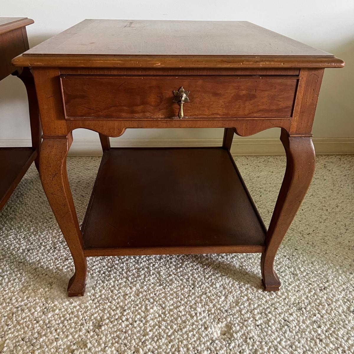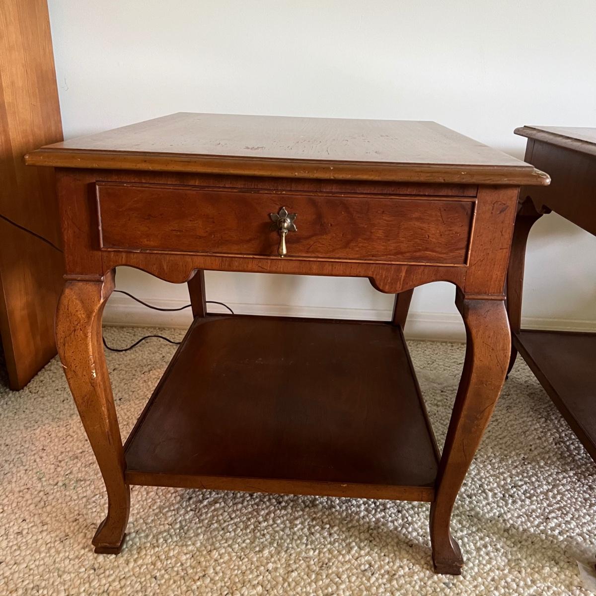 Two wooden side tables. Each table has a drawer, shelf and what appears to be brass hardware. Each table measures 22” x 27” x 22”H. Note chipped overlay on one side of one of the tables.