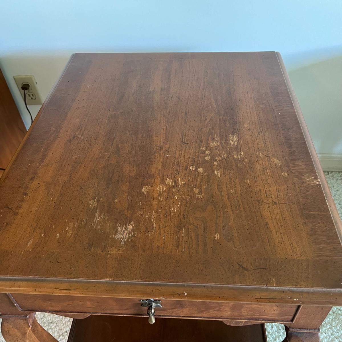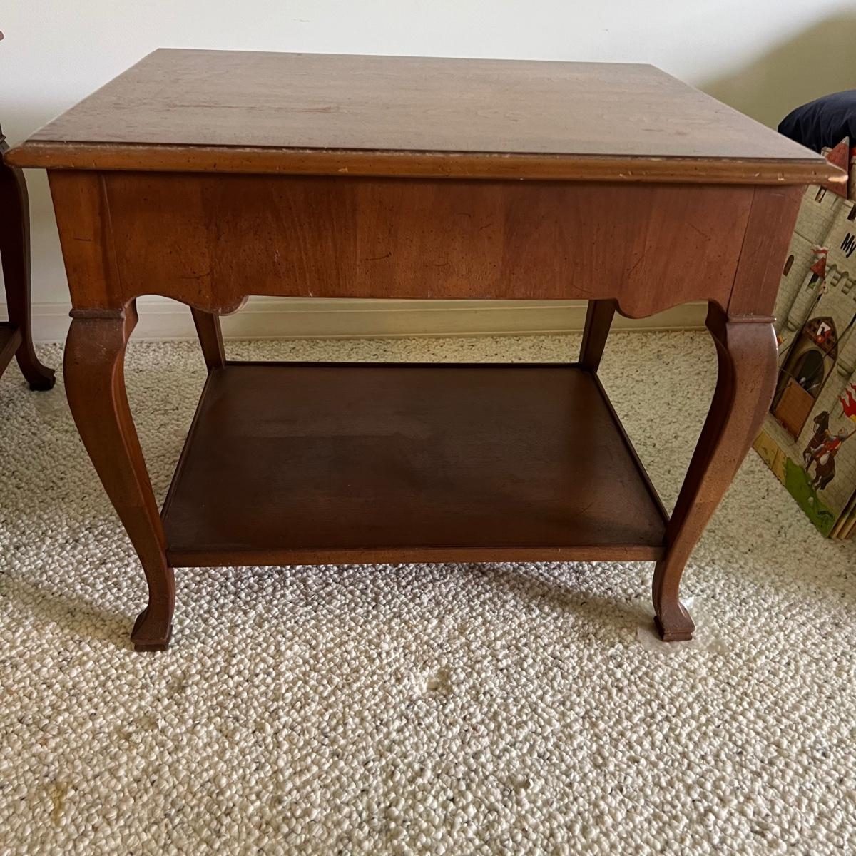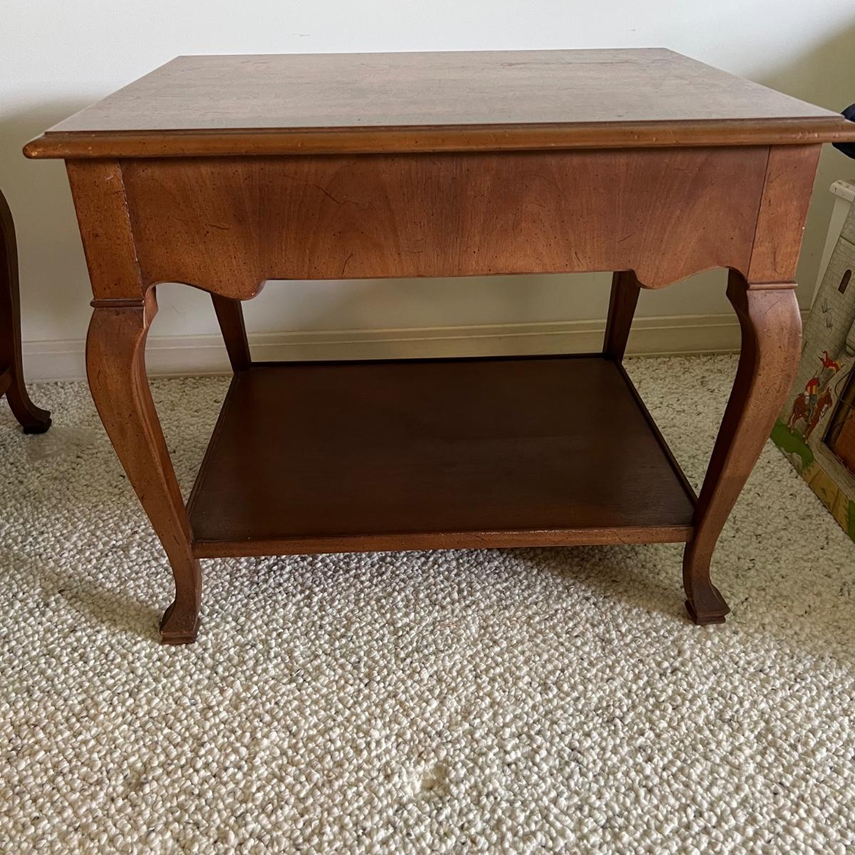Two wooden side tables. Each table has a drawer, shelf and what appears to be brass hardware. Each table measures 22” x 27” x 22”H. Note chipped overlay on one side of one of the tables.