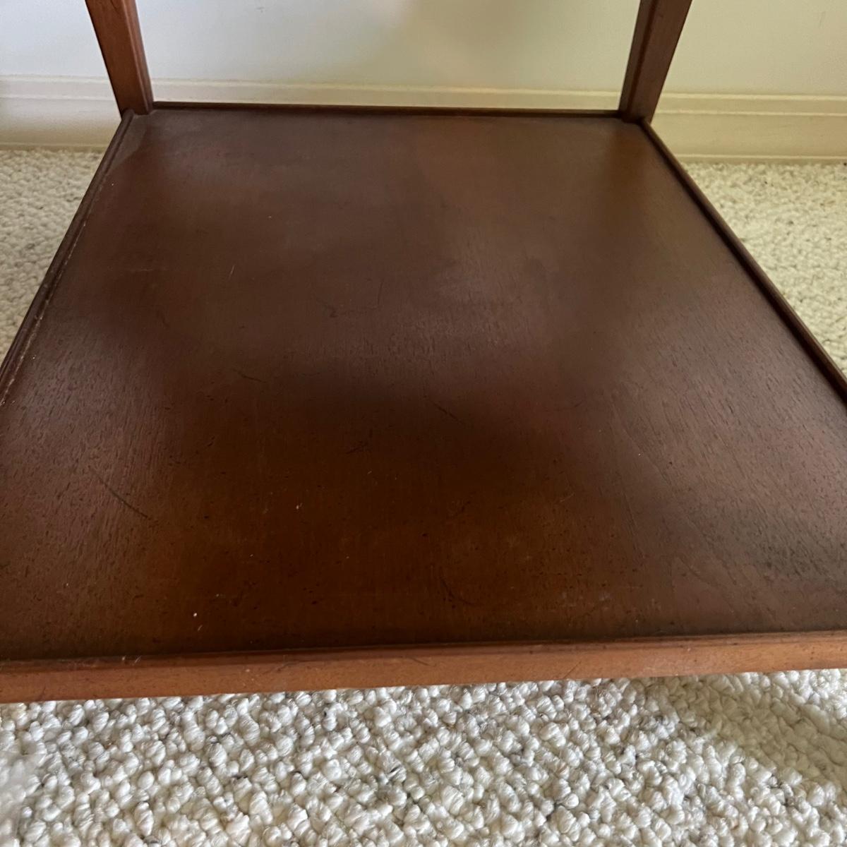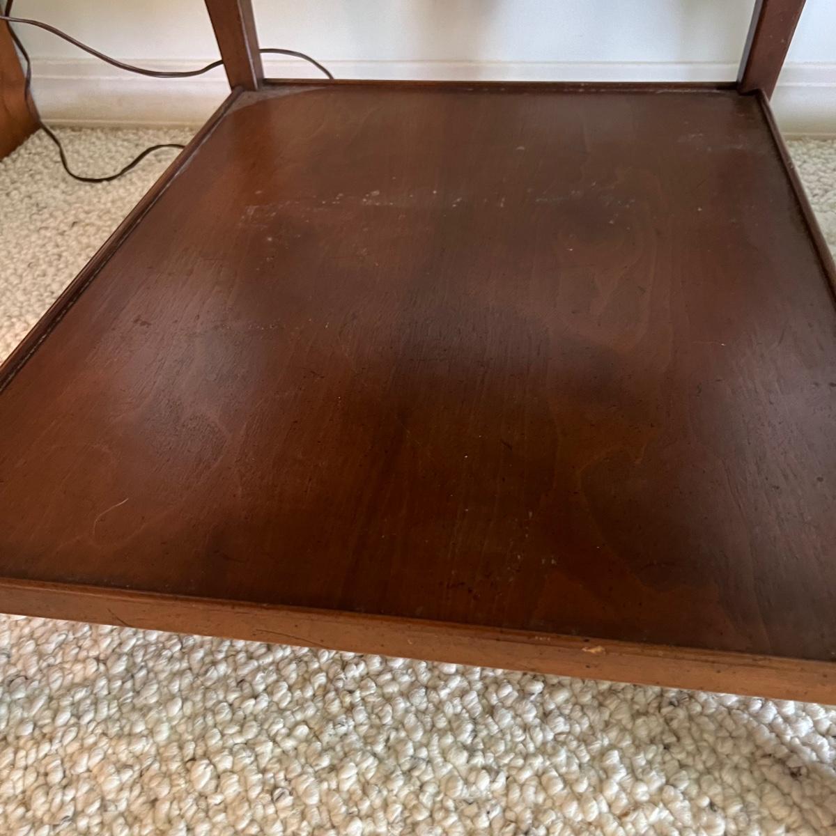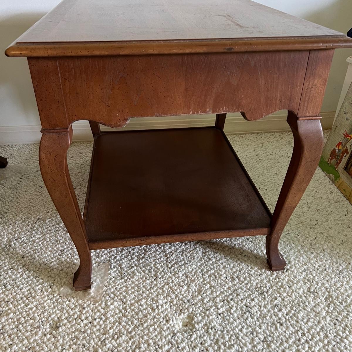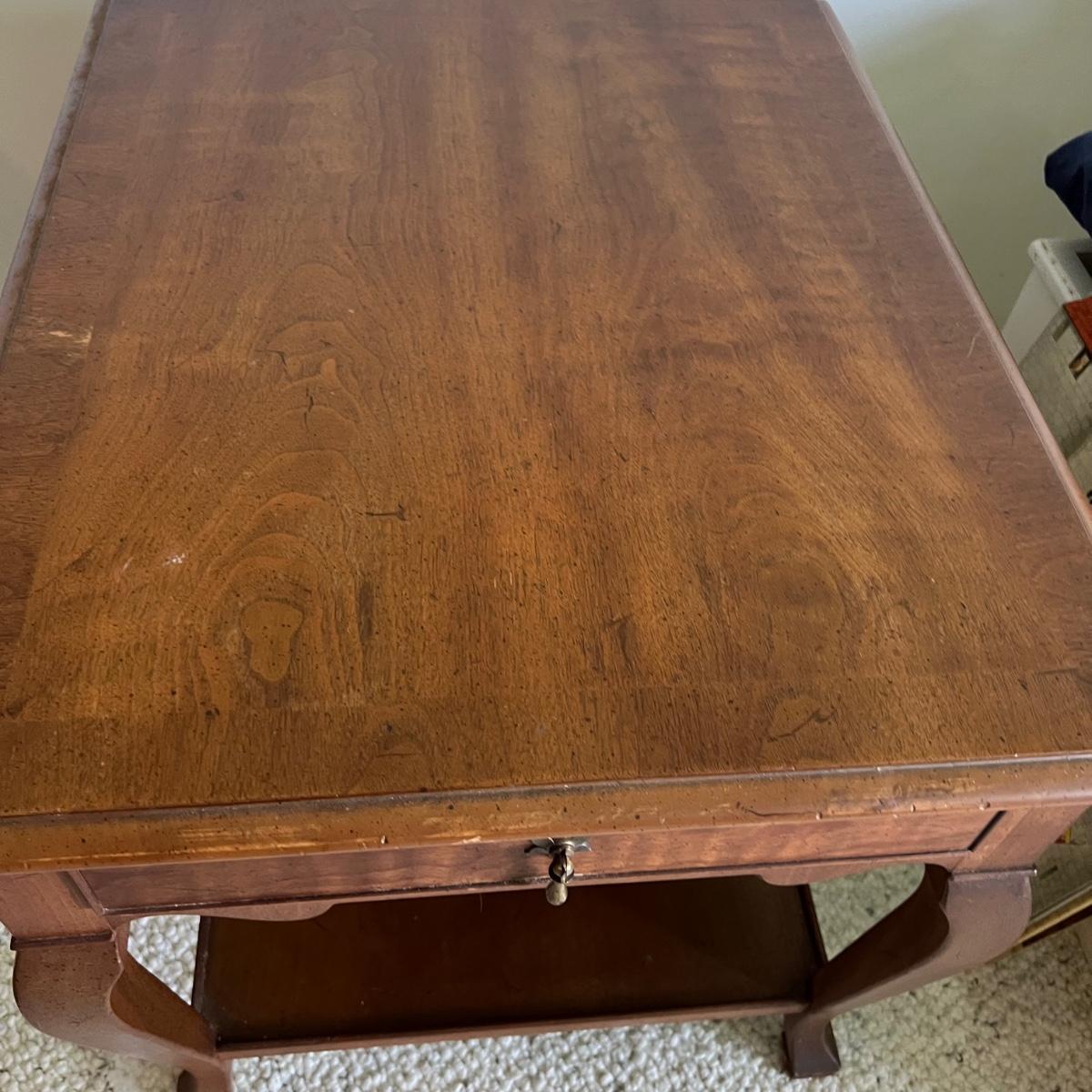 Two wooden side tables. Each table has a drawer, shelf and what appears to be brass hardware. Each table measures 22” x 27” x 22”H. Note chipped overlay on one side of one of the tables.