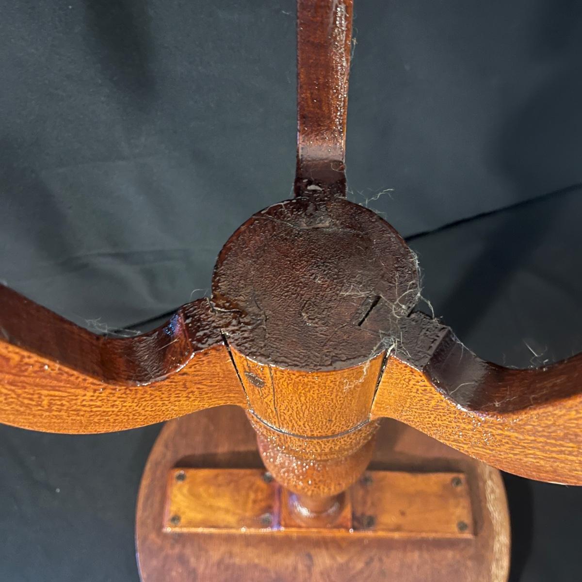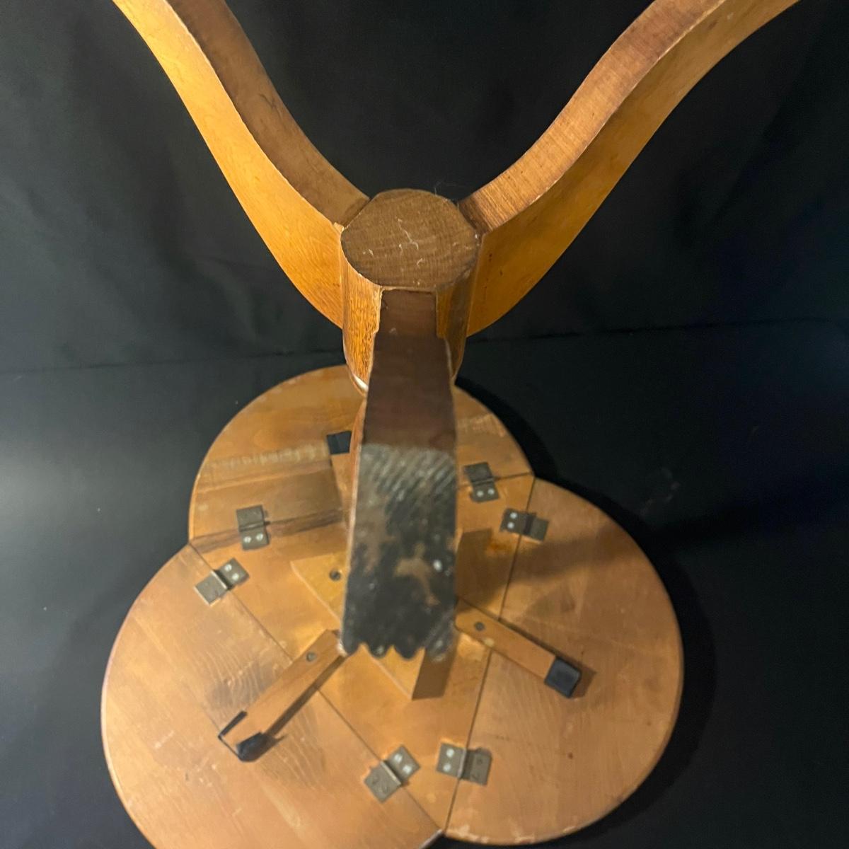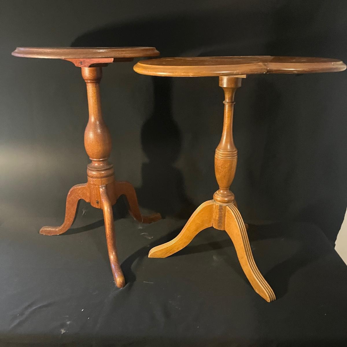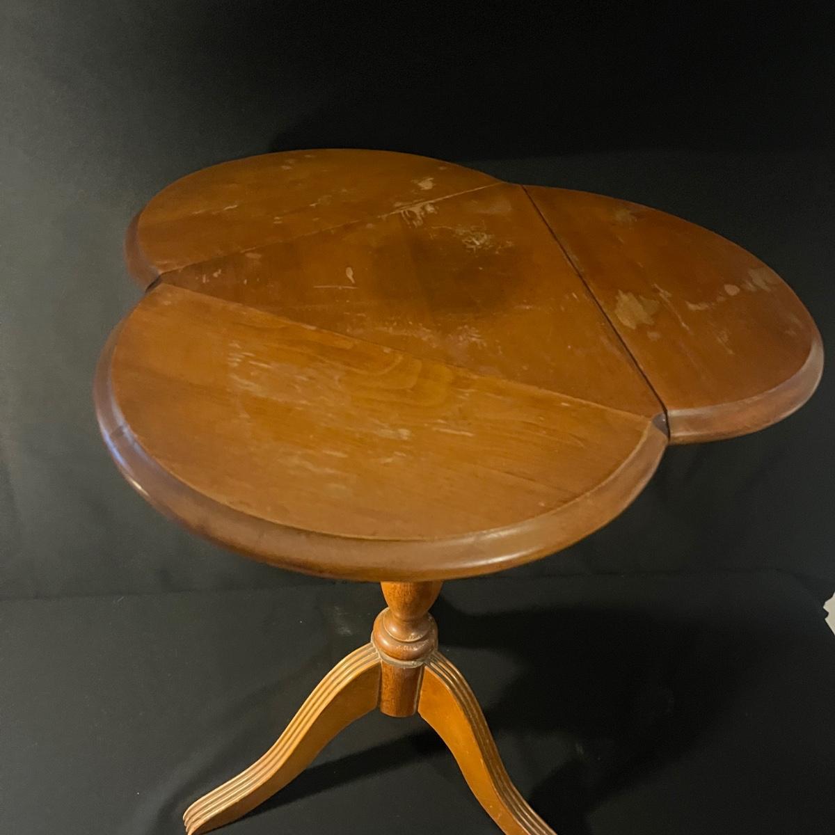 Lot includes two wooden side tables. One has three small drop leaves to expand the top and one has a solid top. Both tables have wear on the top and the solid top one has bubbling of the finish. Drop leaf table measures 21”D x 25”H when leaves are folded out. It’s top is a little wobbly, it is possible the screws just need to be tightened.