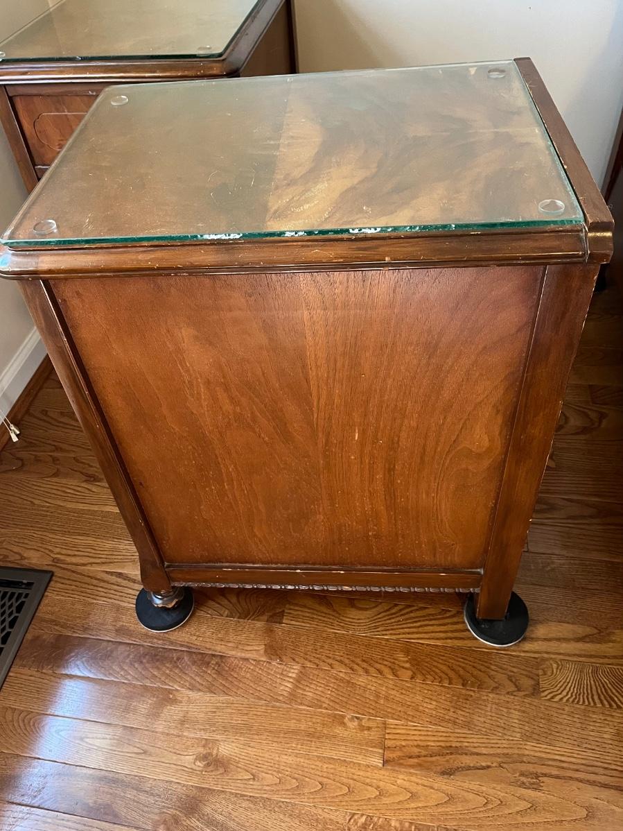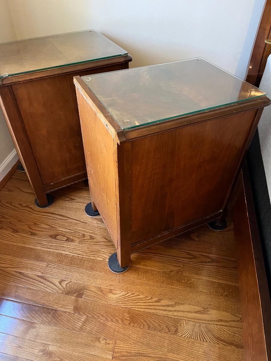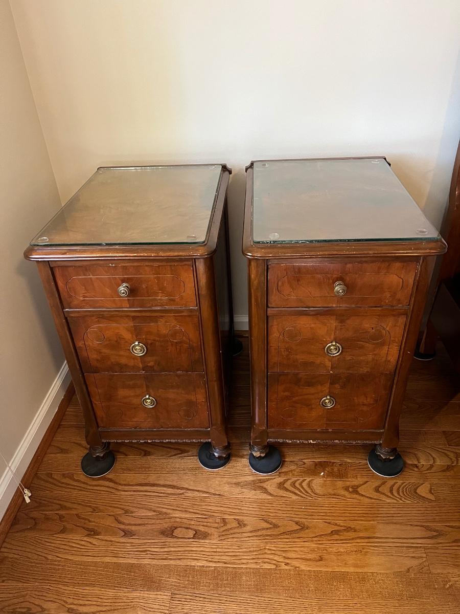 15.5” x 21” x 16”H. They each have three drawers that are dovetailed. The tables have some etched trim detail and brass colored hardware. Includes glass protective tops.