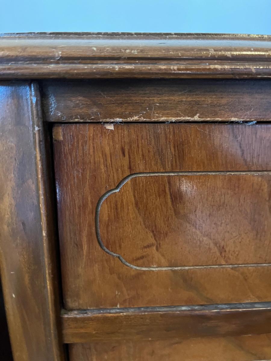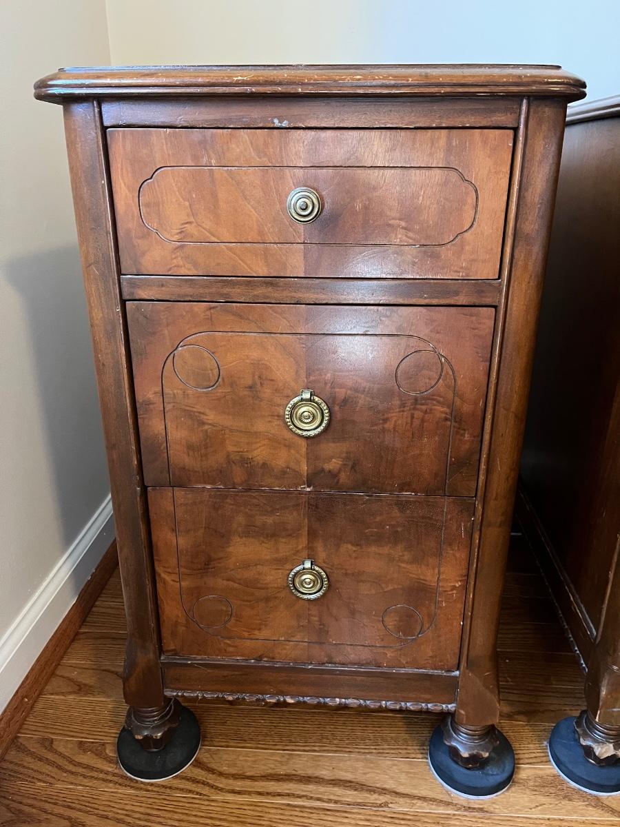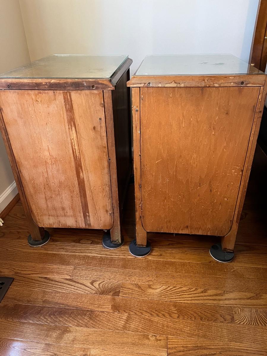 15.5” x 21” x 16”H. They each have three drawers that are dovetailed. The tables have some etched trim detail and brass colored hardware. Includes glass protective tops.