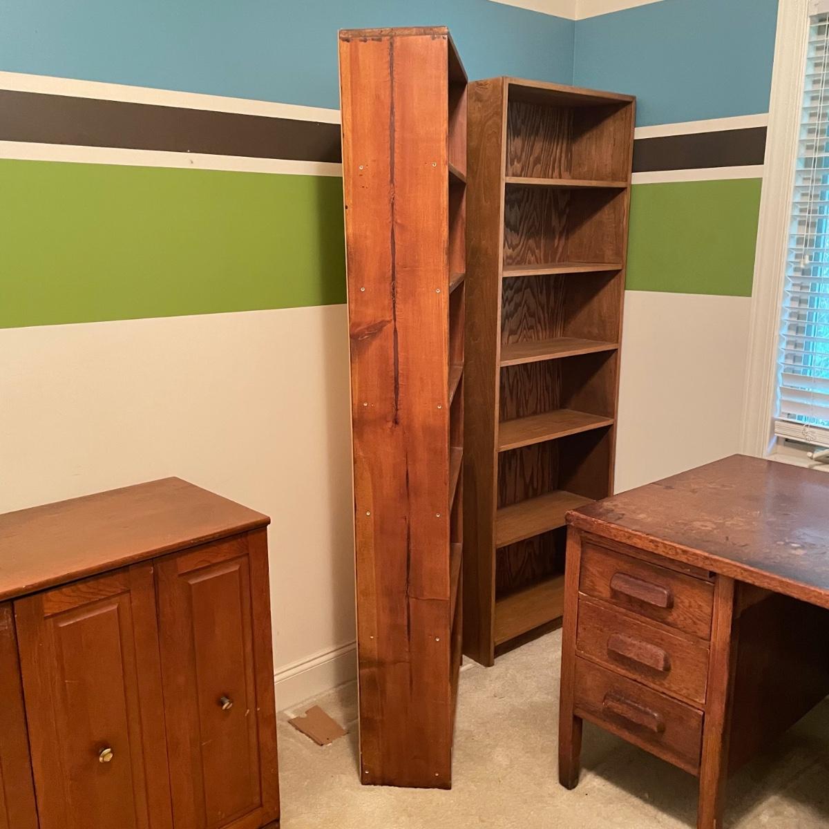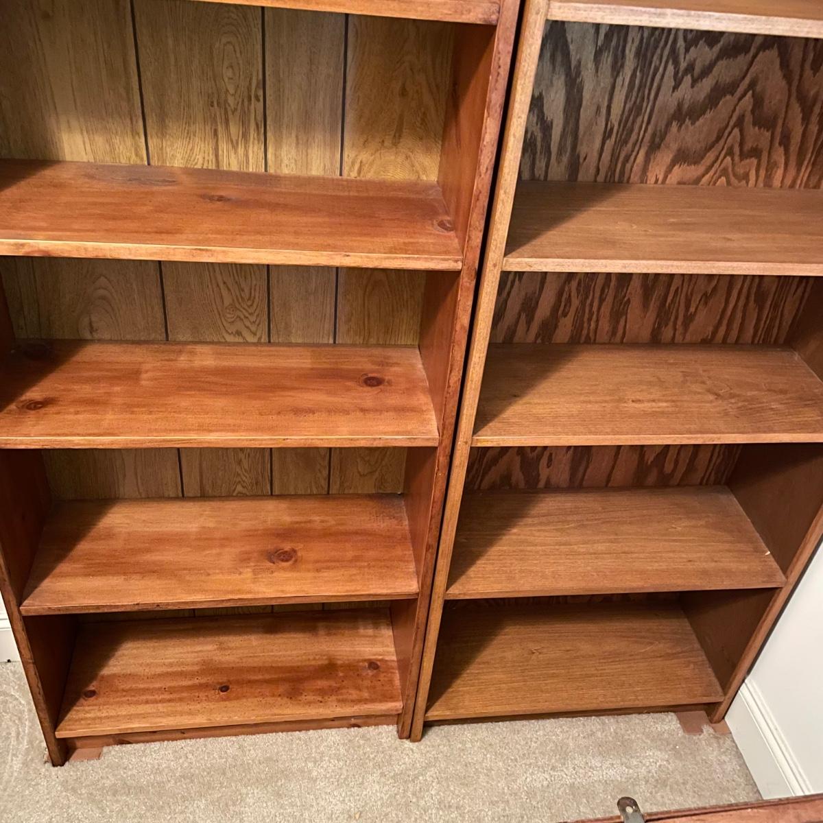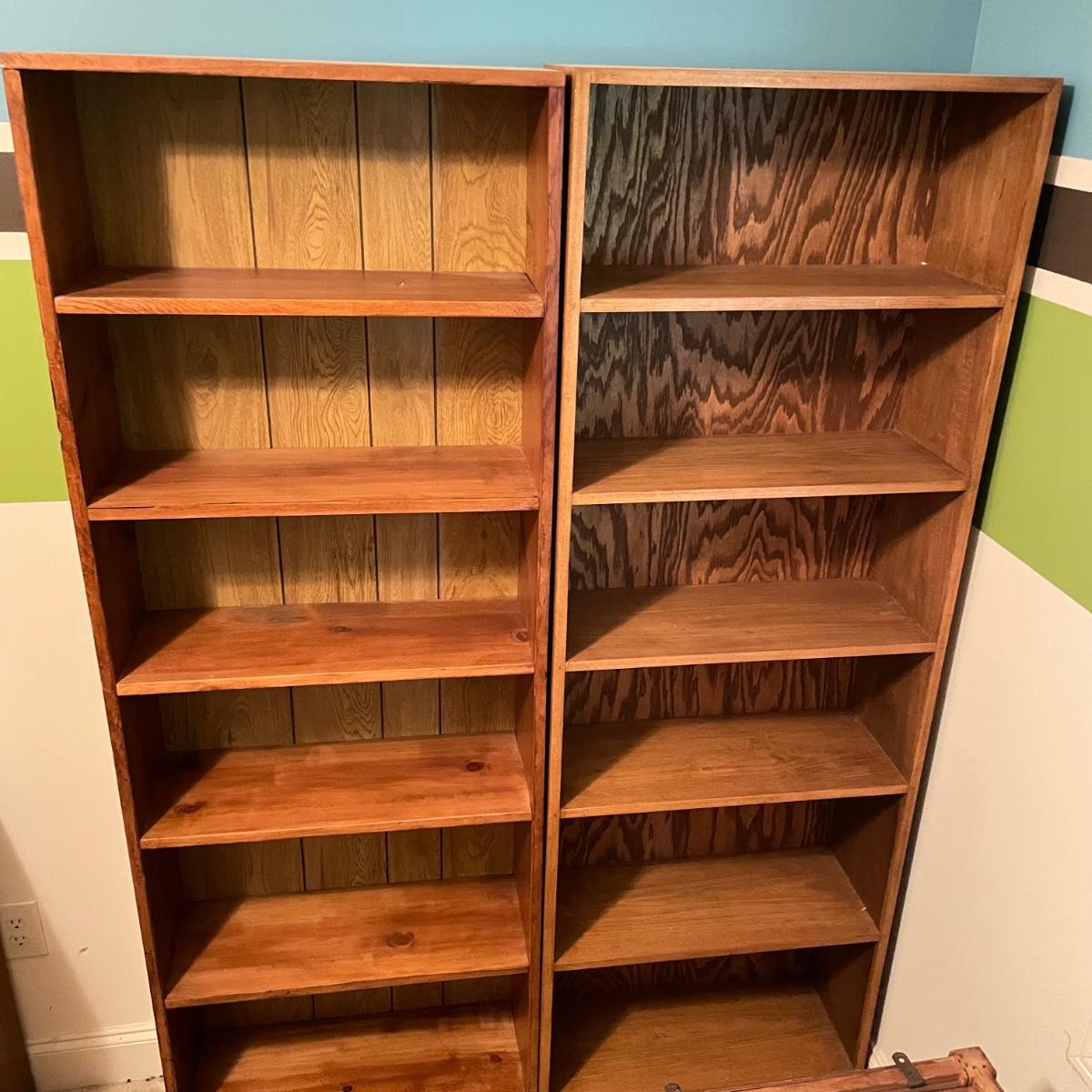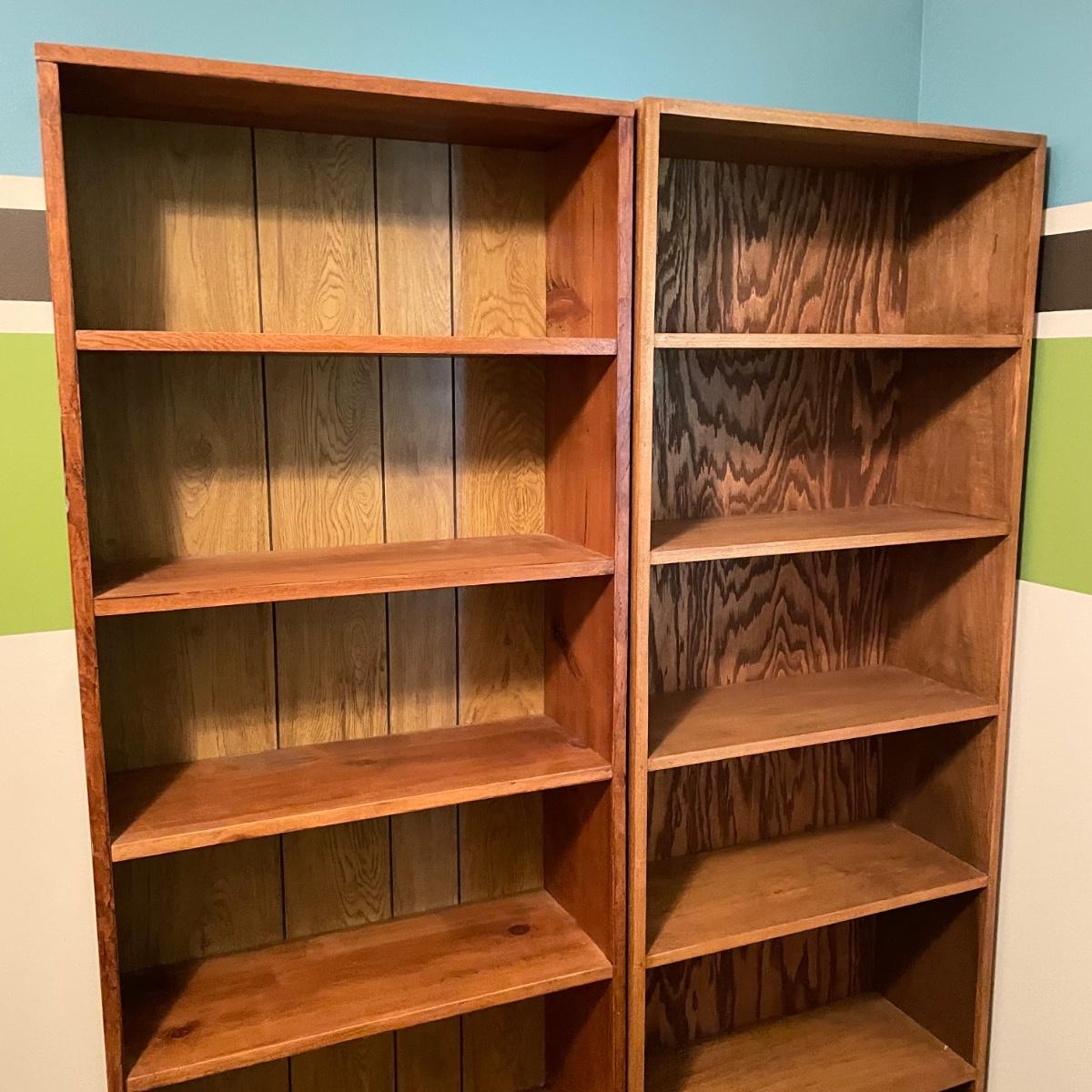 Two similar bookshelves with six fixed shelves each. The warmer-brown unit on the left appears to be solid wood. It has its shelf hardware showing on the outside. The right set of shelves appears to be pressed wood. Its hardware is mostly hidden, nail heads can be seen when looking closely. Right shelf measures 25” x 10” x 73”H. Left shelf measures 25.5” x 9.5” x 72.75”H. Local pick up only. There are just three steps off the porch to the driveway. Winning bidder must bring assistance to help move and load this item due to its weight and/or size.