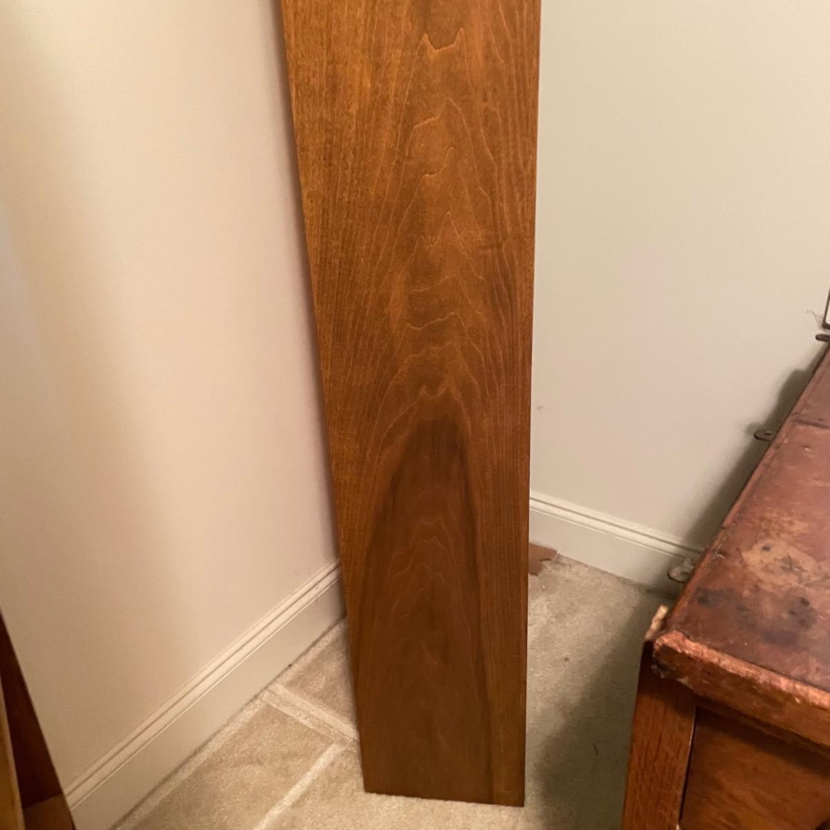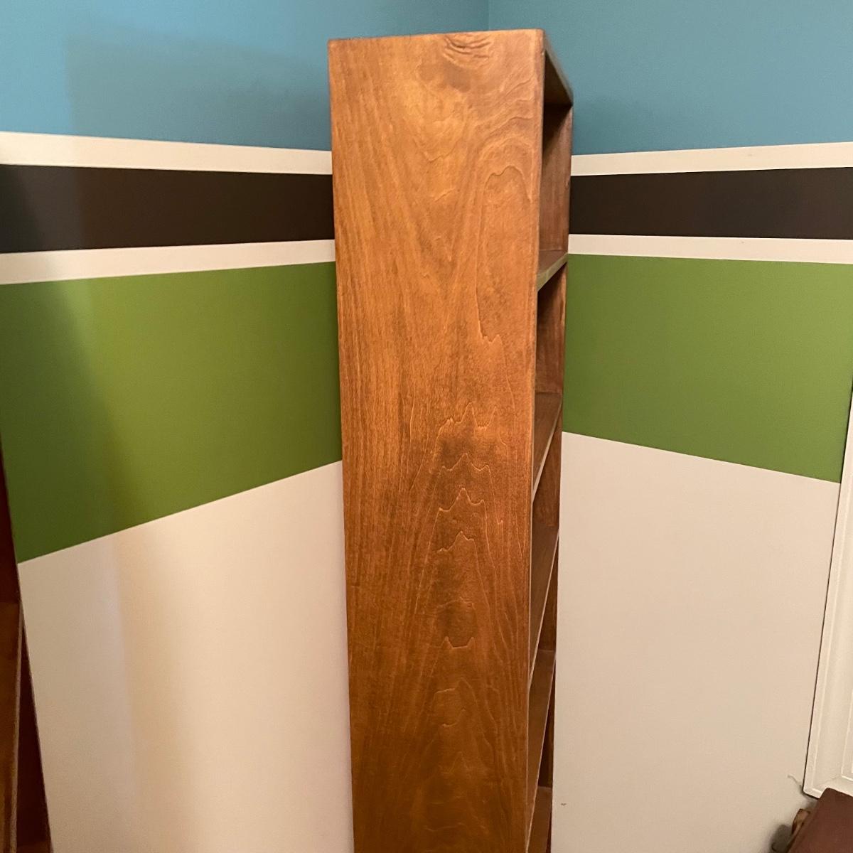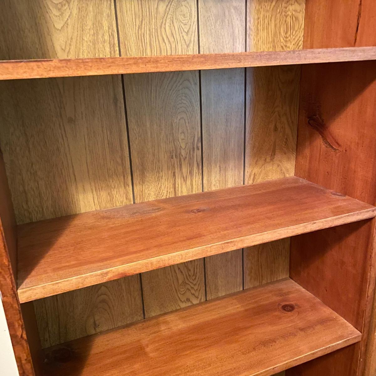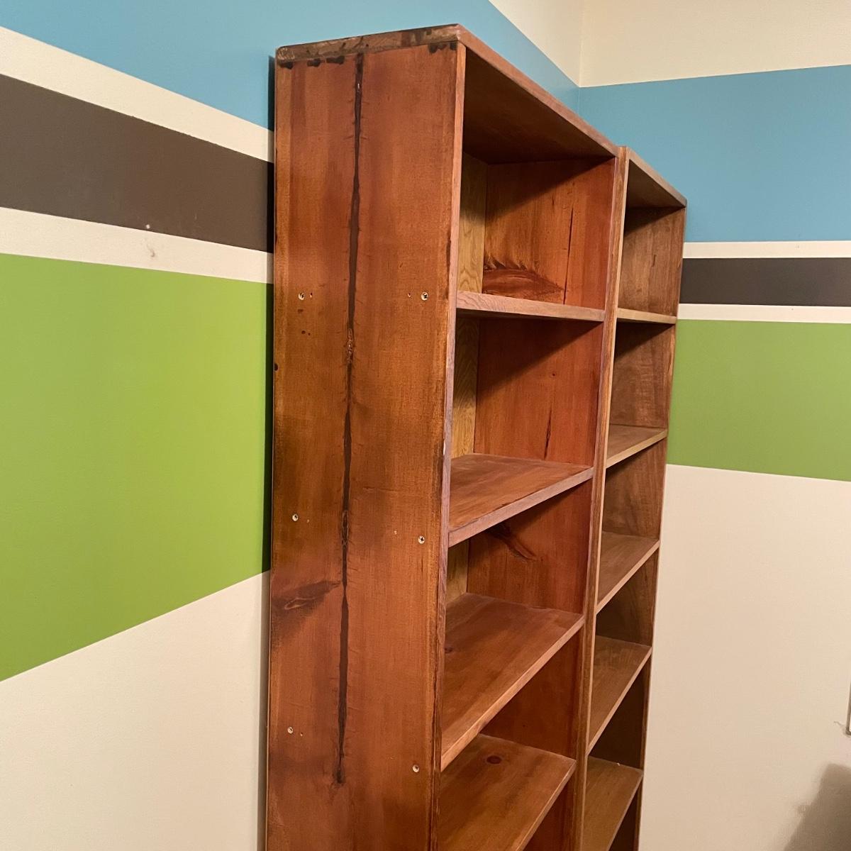 Two similar bookshelves with six fixed shelves each. The warmer-brown unit on the left appears to be solid wood. It has its shelf hardware showing on the outside. The right set of shelves appears to be pressed wood. Its hardware is mostly hidden, nail heads can be seen when looking closely. Right shelf measures 25” x 10” x 73”H. Left shelf measures 25.5” x 9.5” x 72.75”H. Local pick up only. There are just three steps off the porch to the driveway. Winning bidder must bring assistance to help move and load this item due to its weight and/or size.