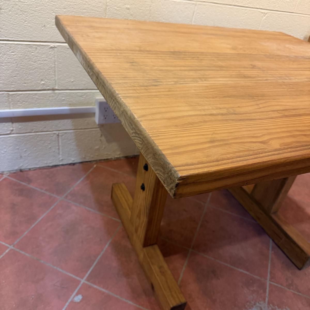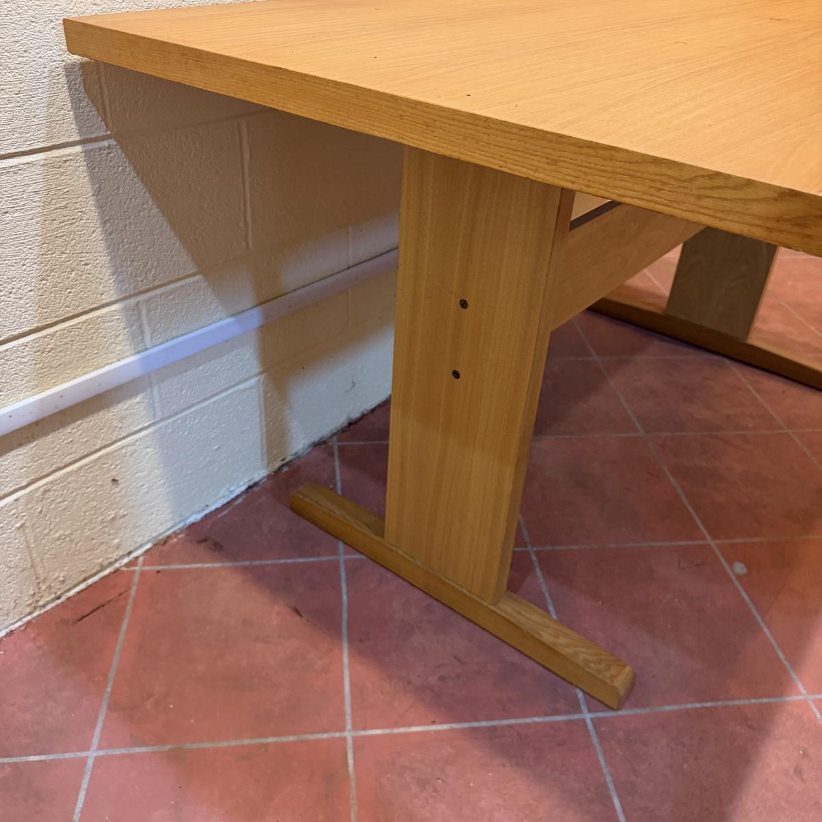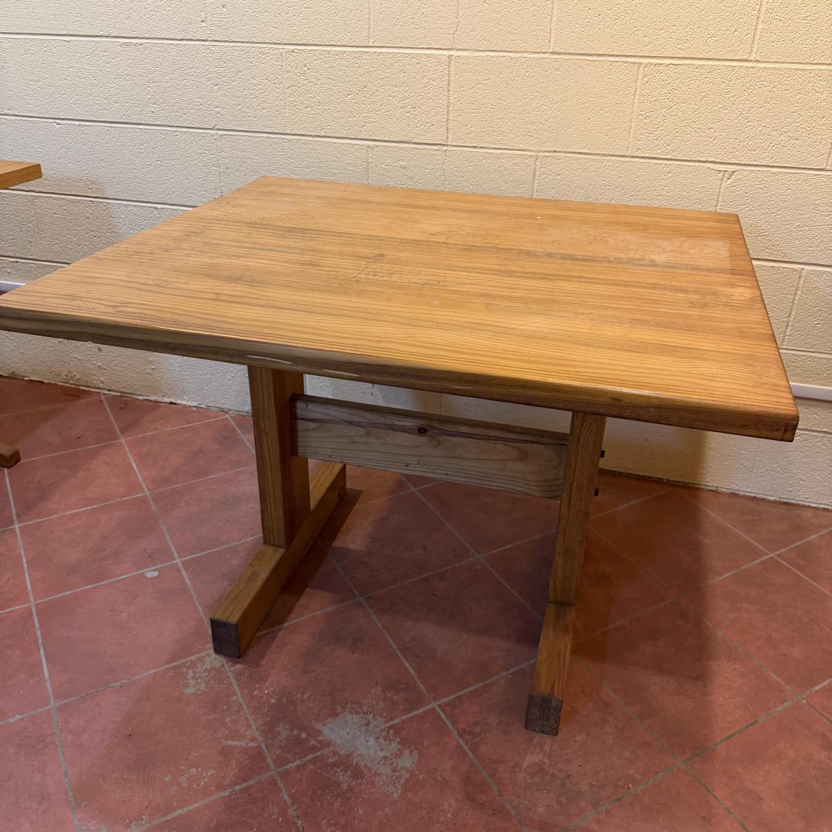 Lot includes two wooden tables. Tables appear to be solid wood and measure 60” x 30” x 29.5”H and 42” x 36” x 29.5”H. Tables have nicks and scratches, see pictures.