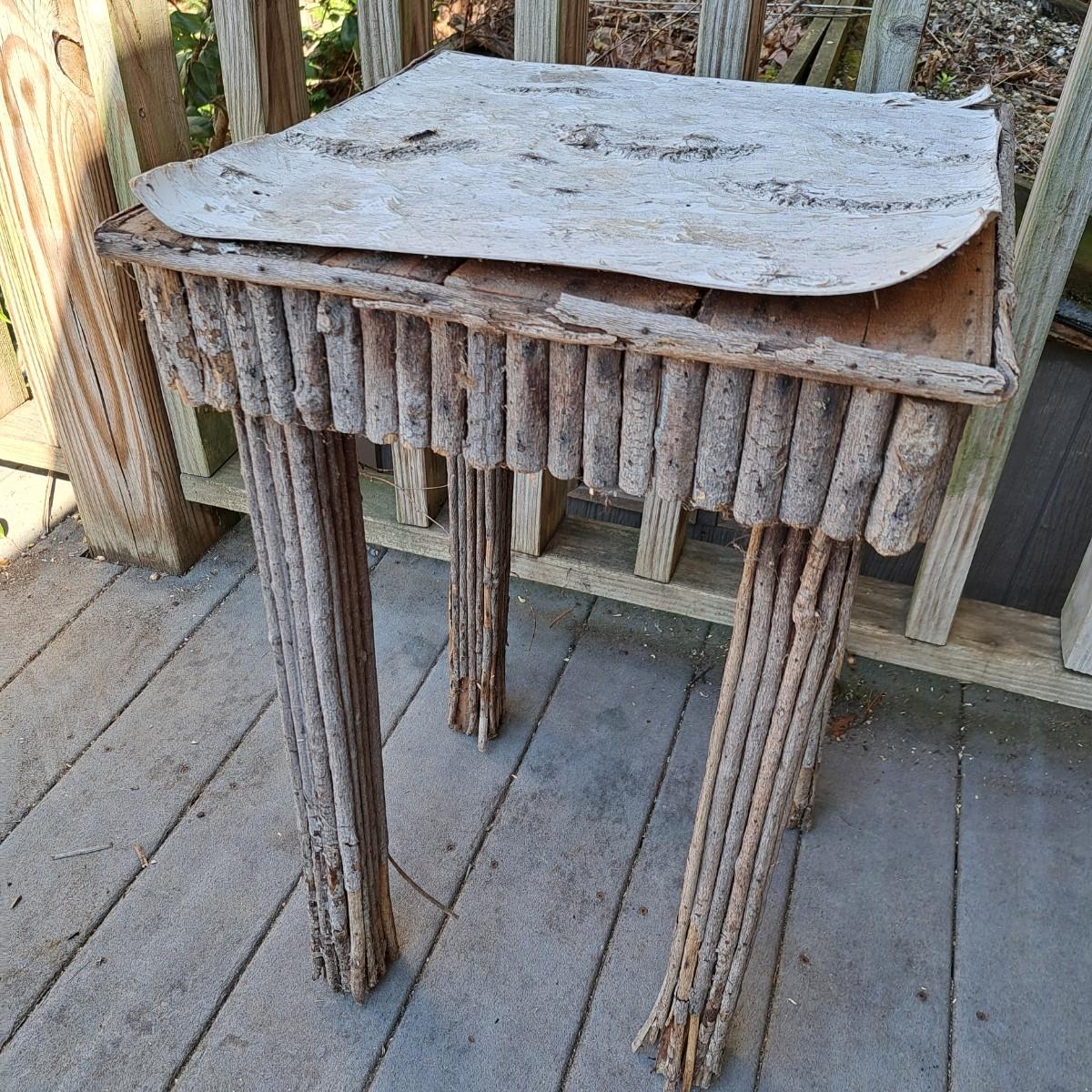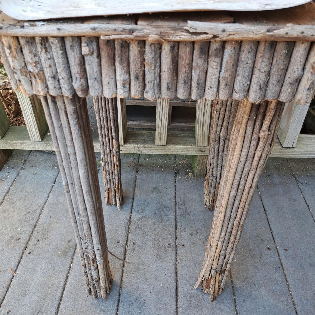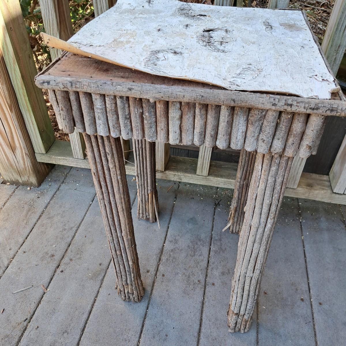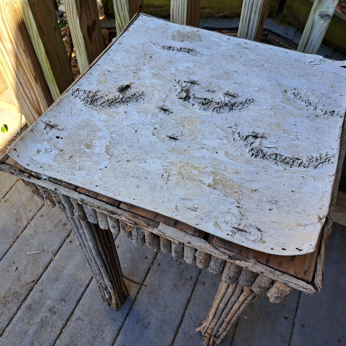 folk-style table of stick construction with a birch bark top that has taken to peeling off; however, a few small nails would put it back in place. The legs have some damage as shown. Local pickup only.
