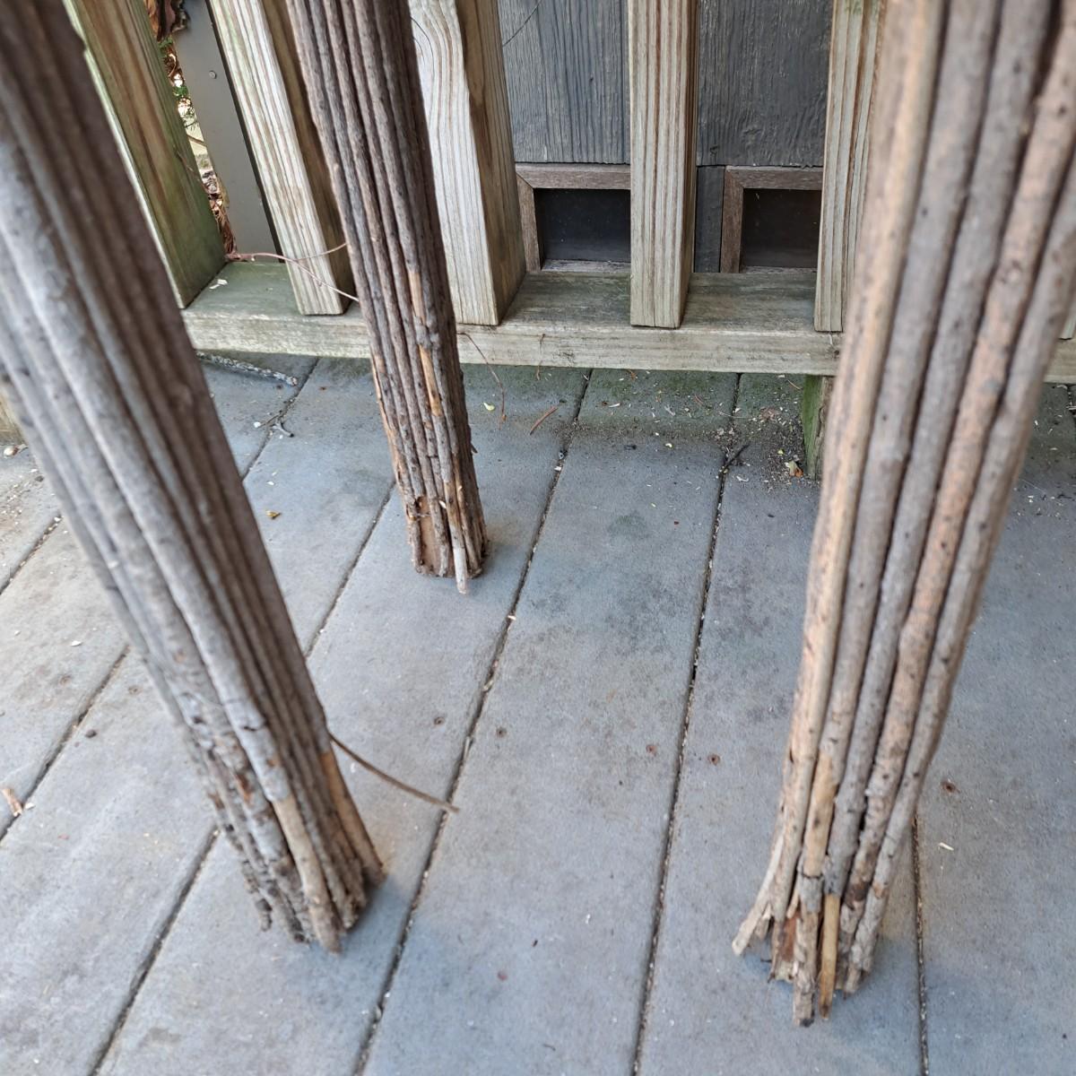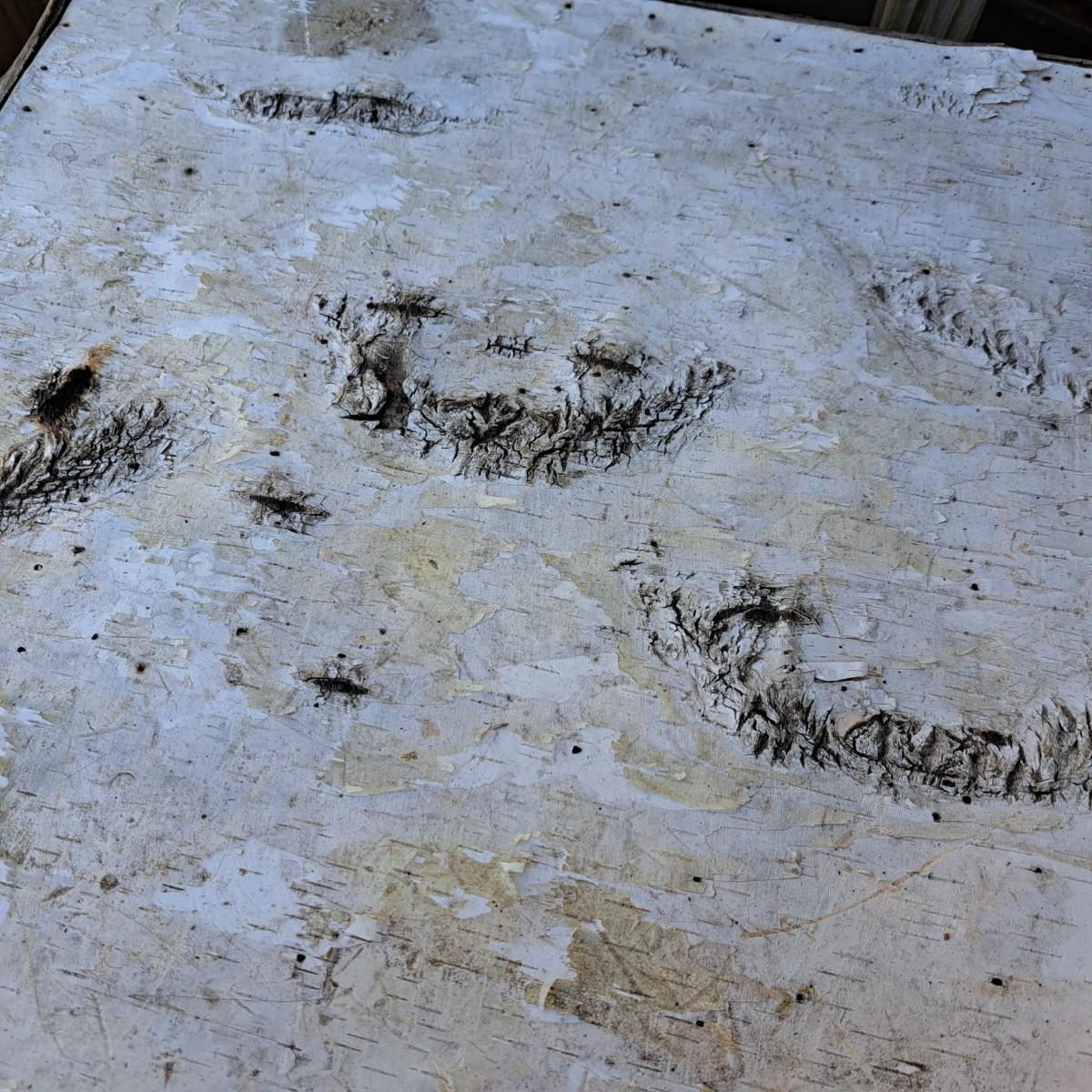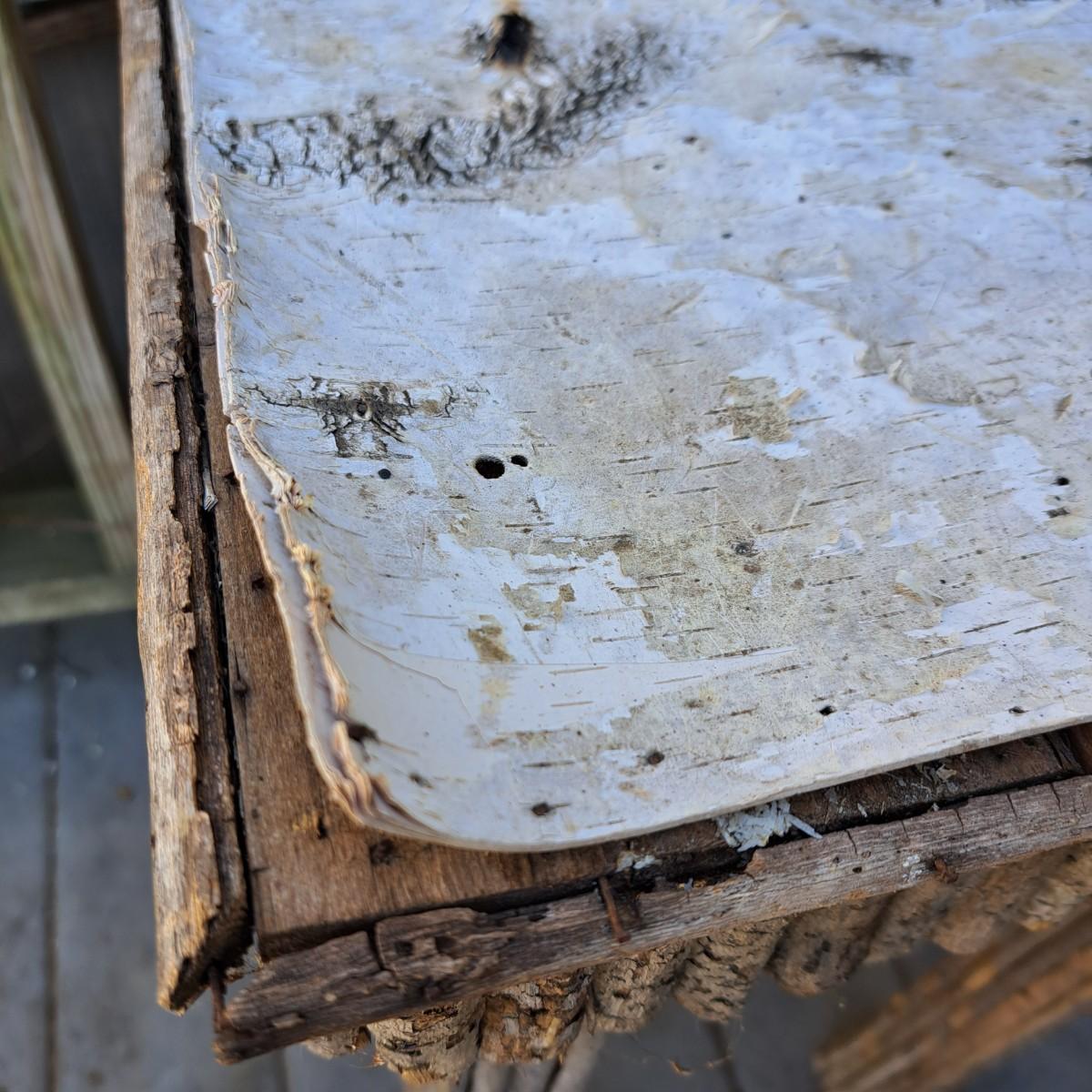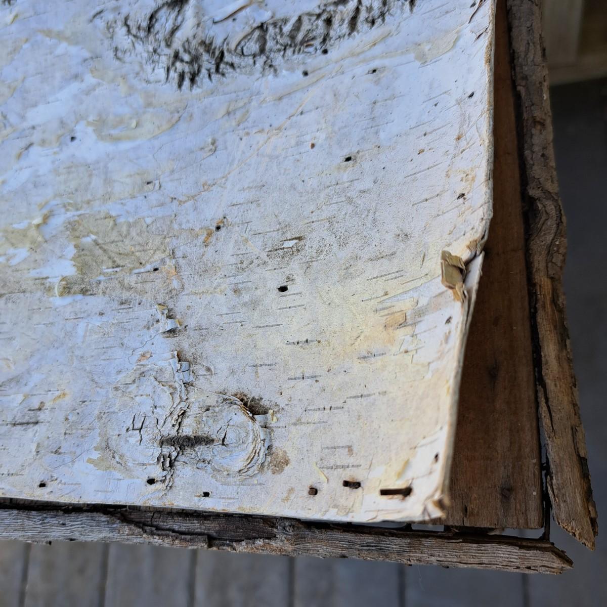 folk-style table of stick construction with a birch bark top that has taken to peeling off; however, a few small nails would put it back in place. The legs have some damage as shown. Local pickup only.