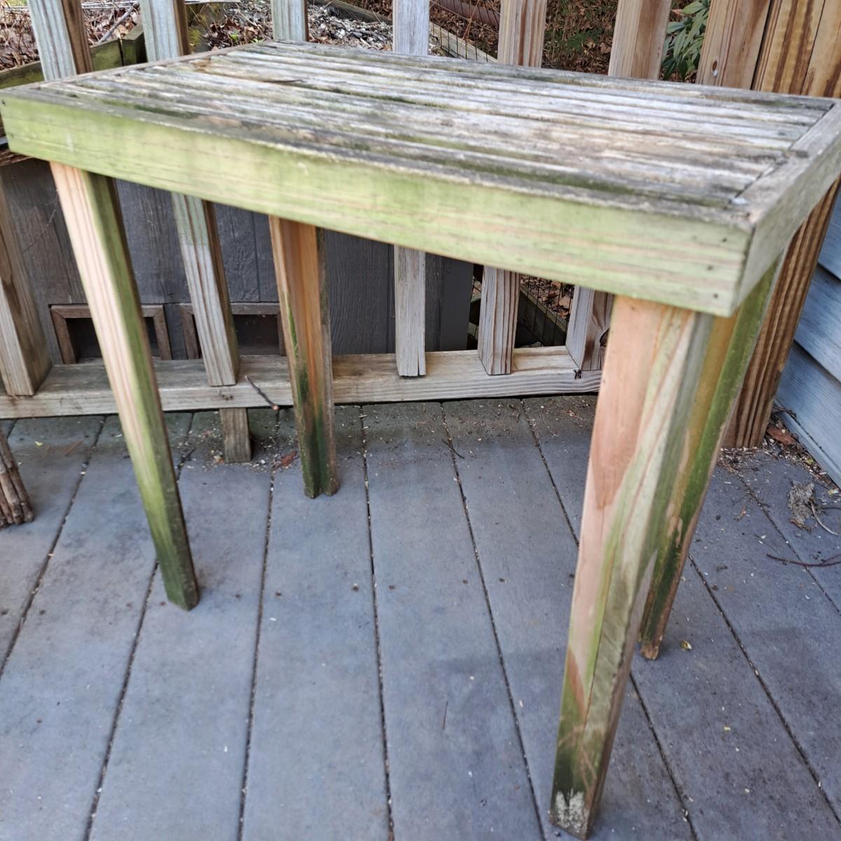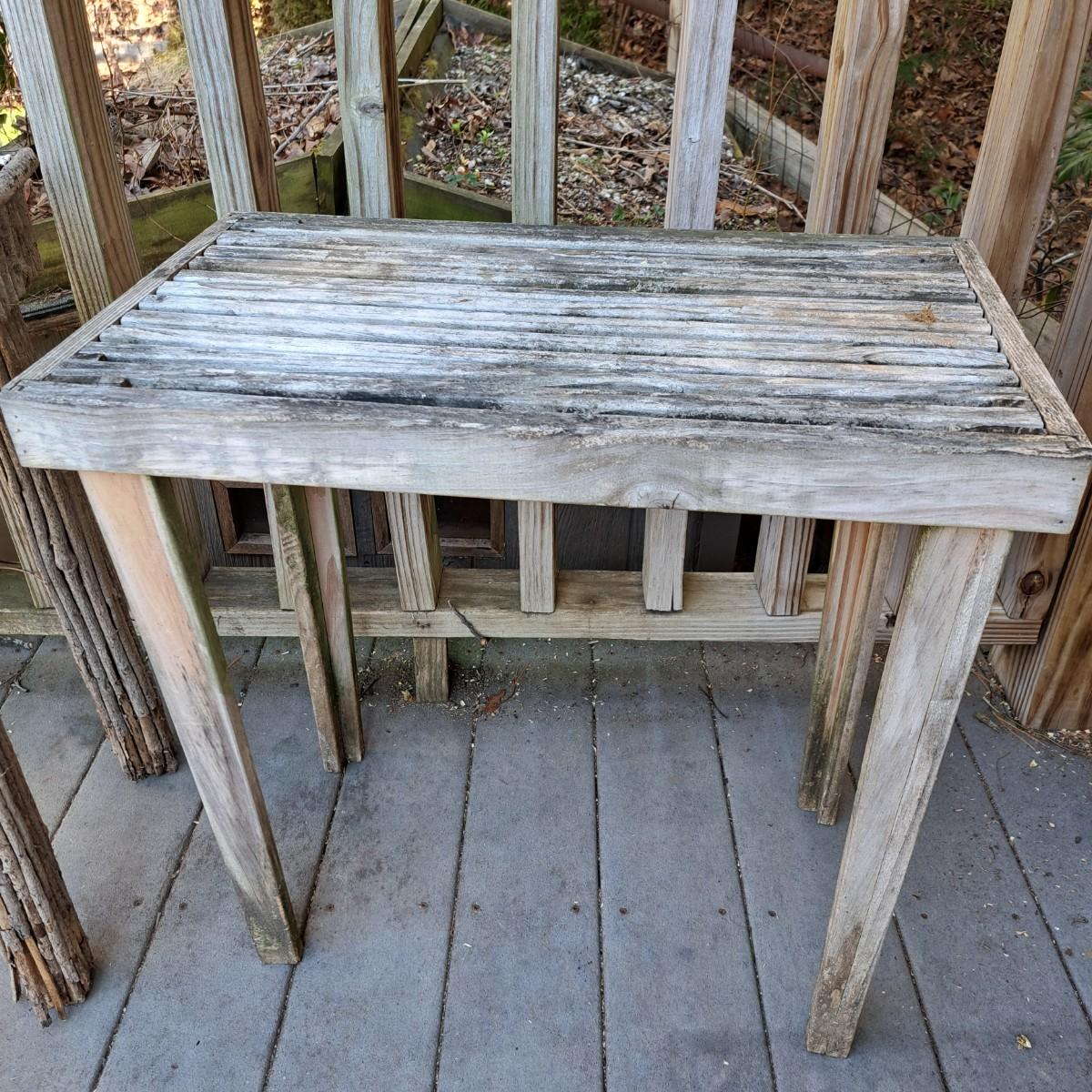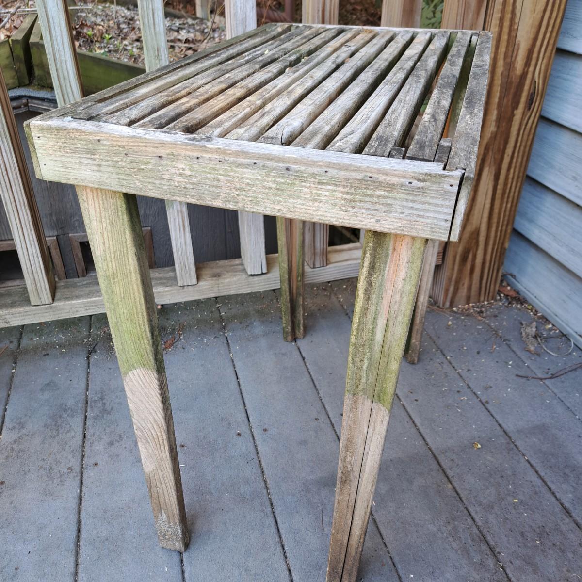 Two charming wooden weathered tables. The first is a slat top table, 24" x 14" x 24"H, with mortise and tenon joints, albeit a bit wobbly. The second table, 26" x 26" x 26"H, also a bit wobbly, appears to be a hand-built