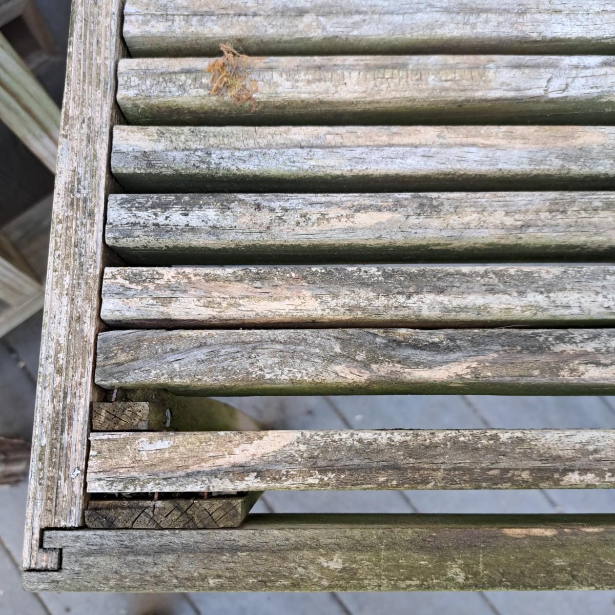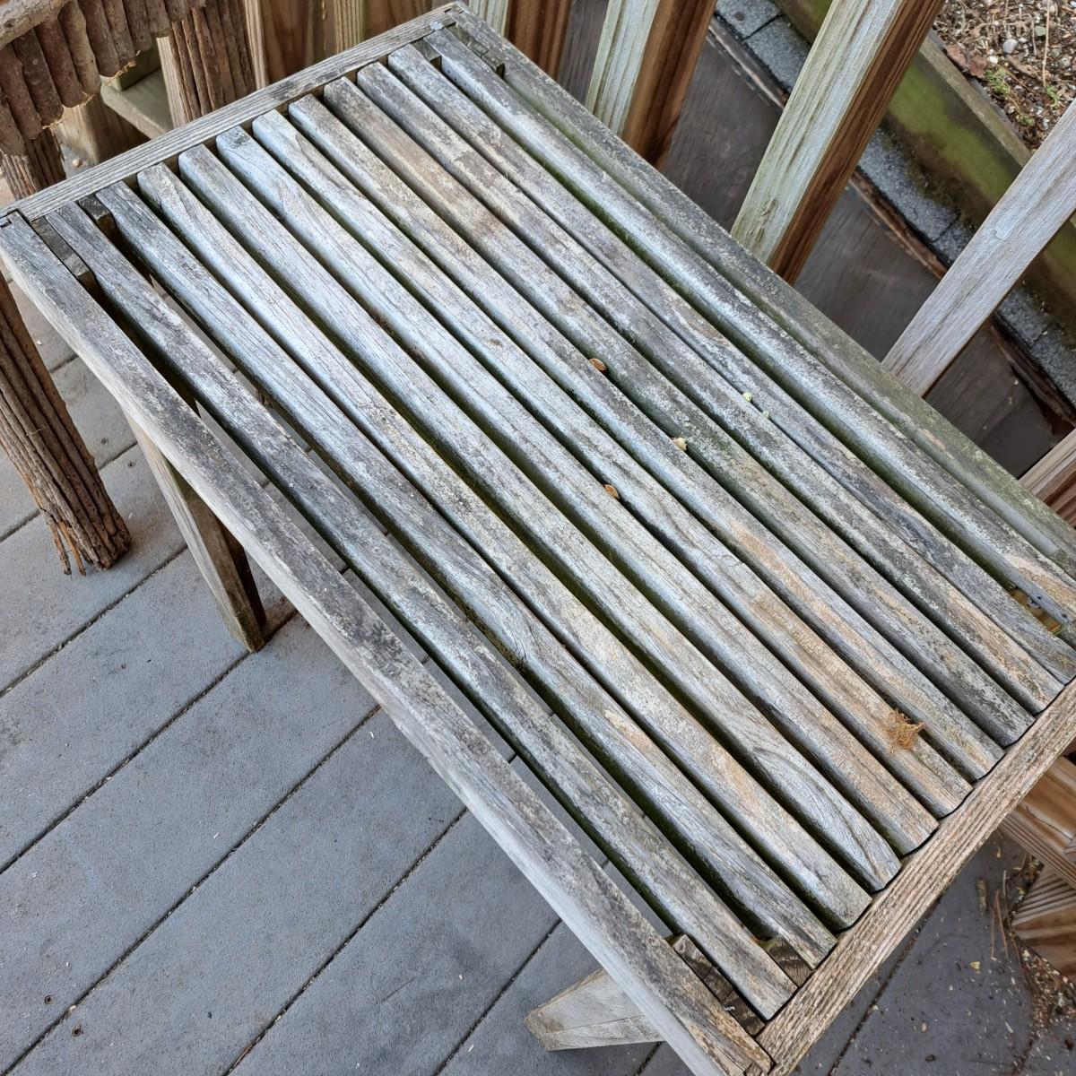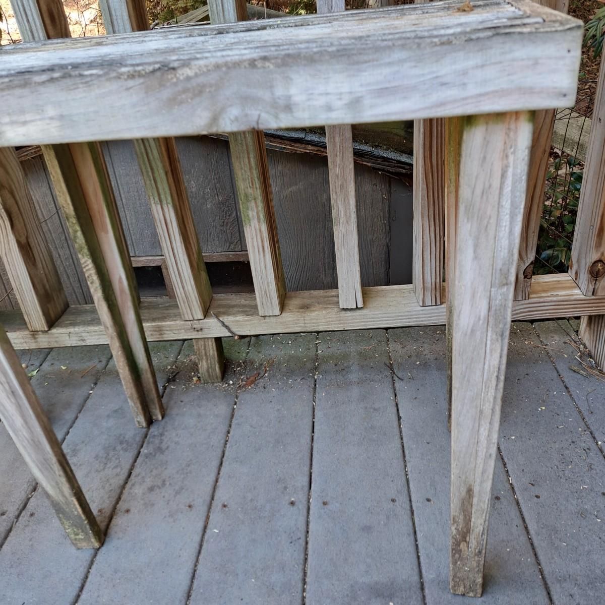 Two charming wooden weathered tables. The first is a slat top table, 24" x 14" x 24"H, with mortise and tenon joints, albeit a bit wobbly. The second table, 26" x 26" x 26"H, also a bit wobbly, appears to be a hand-built