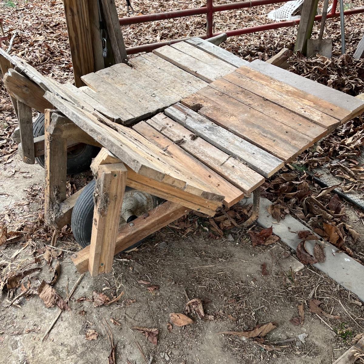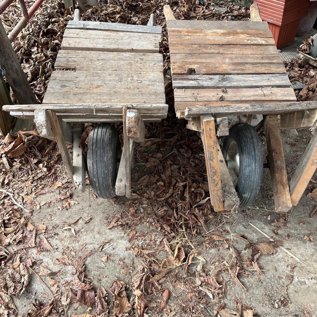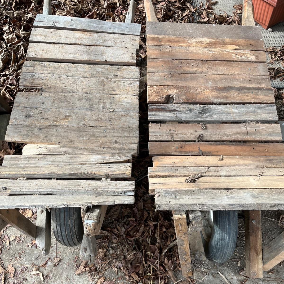Lot includes two wooden home made wheelbarrows that were used for moving firewood. Wheelbarrows measure 24” x 55” x 24”.