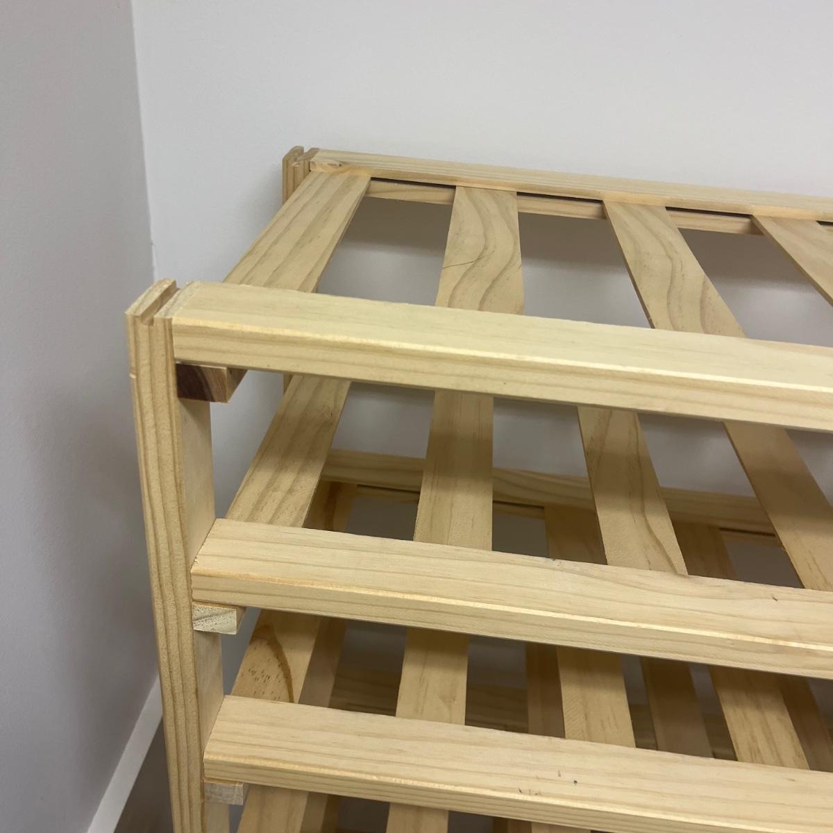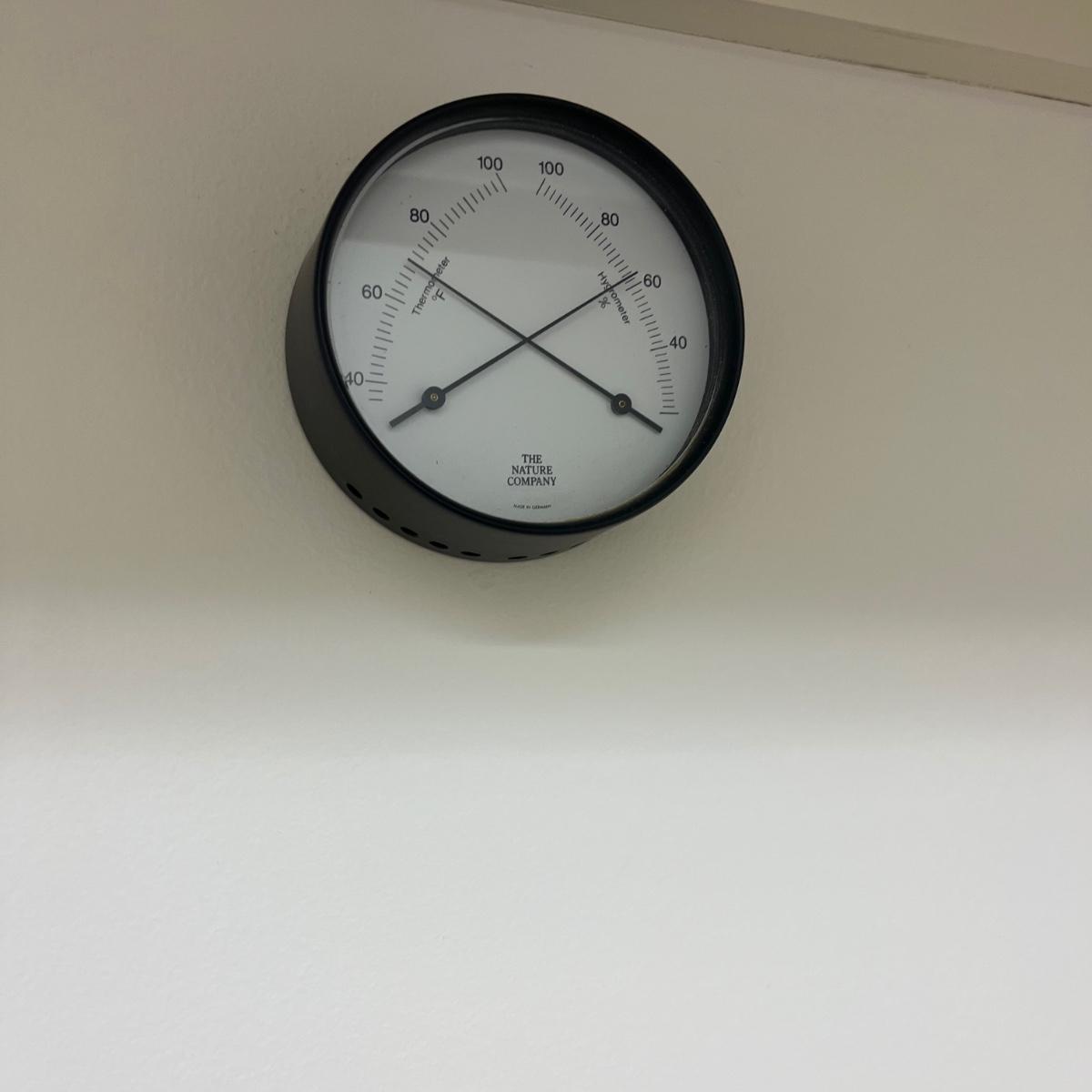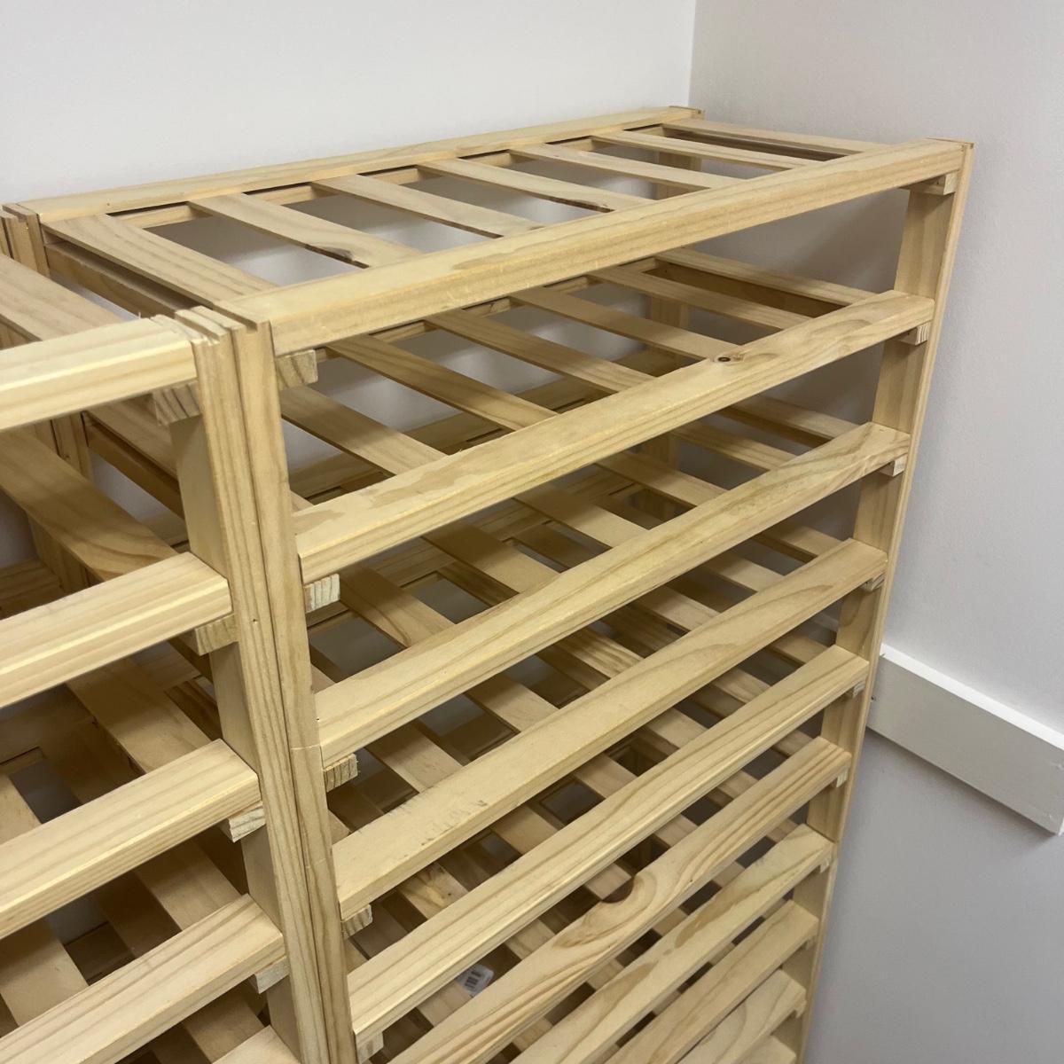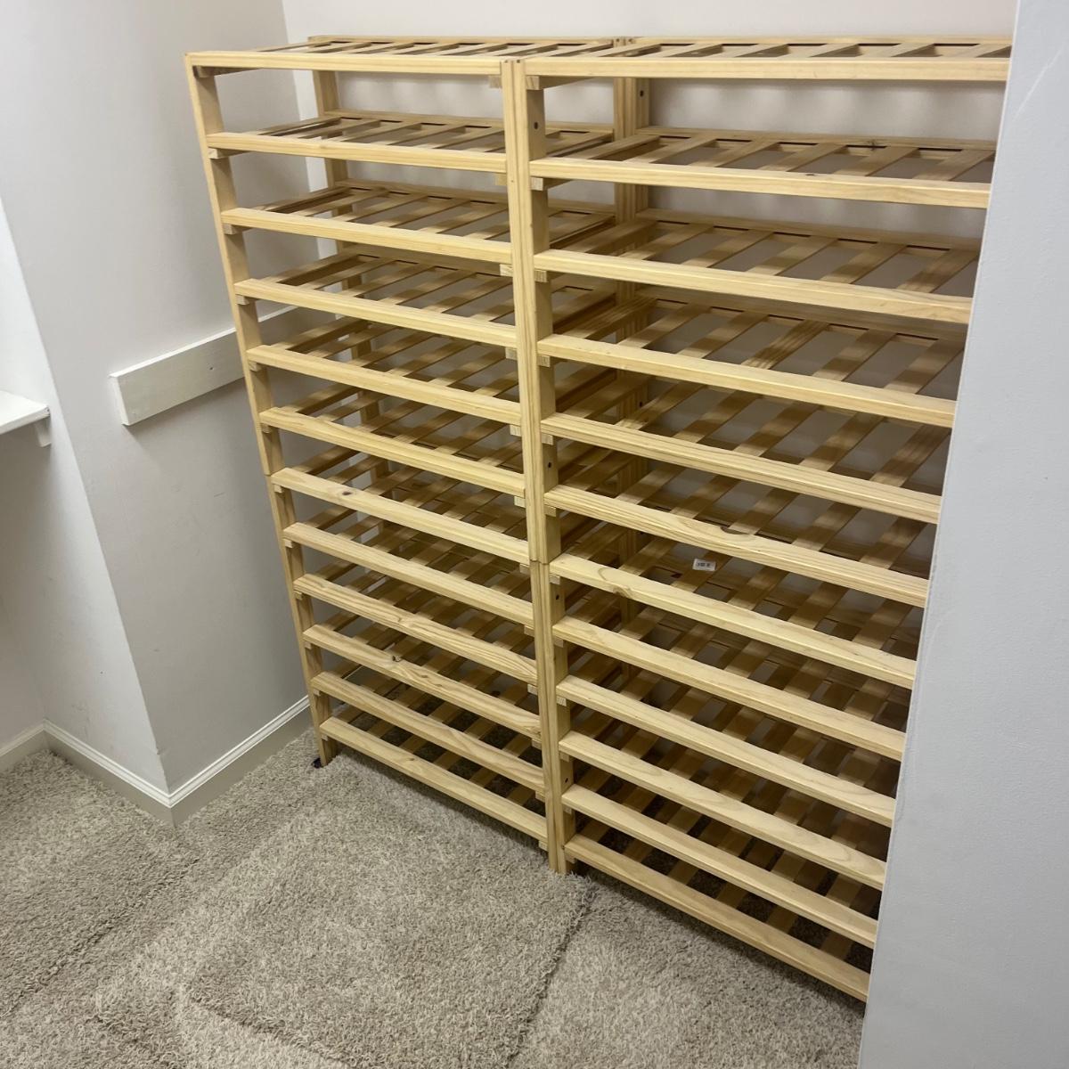 Lot includes two wooden wine racks that measure 12” x 25” x 56”H. Racks are screwed together and can be taken apart with Phillips screwdriver. Also includes a Thermometer/Humidity gauge.