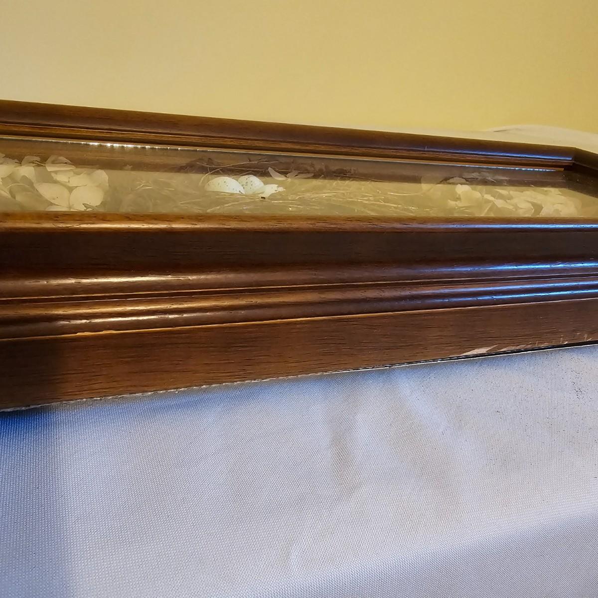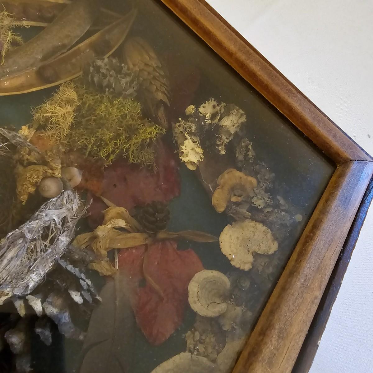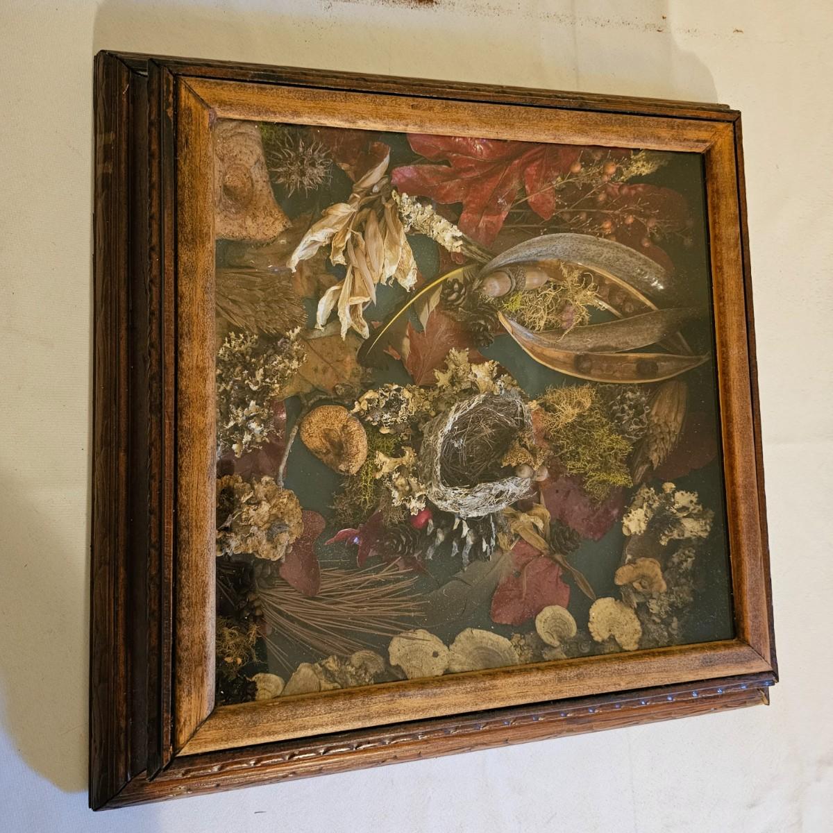 A pair of decorative framed shadow boxes with woodland elements contained inside. Leaves, pinecones, moss, fungi, seed pods, bird nests and more between the two pieces. The wider/smaller frame has glass, the larger square frame is likely plexiglass, but we cannot say for sure. Large item measures 16" x 2.5" x 16"H. Long piece is 21.5" x 2"x 7.5"H. Some minor blemishes on framework. See photos for details. Shipping available. Shipping can be costly. We suggest contacting our preferred local shipping provider, Postage Express, with dimensions and getting an estimate before bidding: (828) 255-9250 or shipping@postageexpressnc.com.