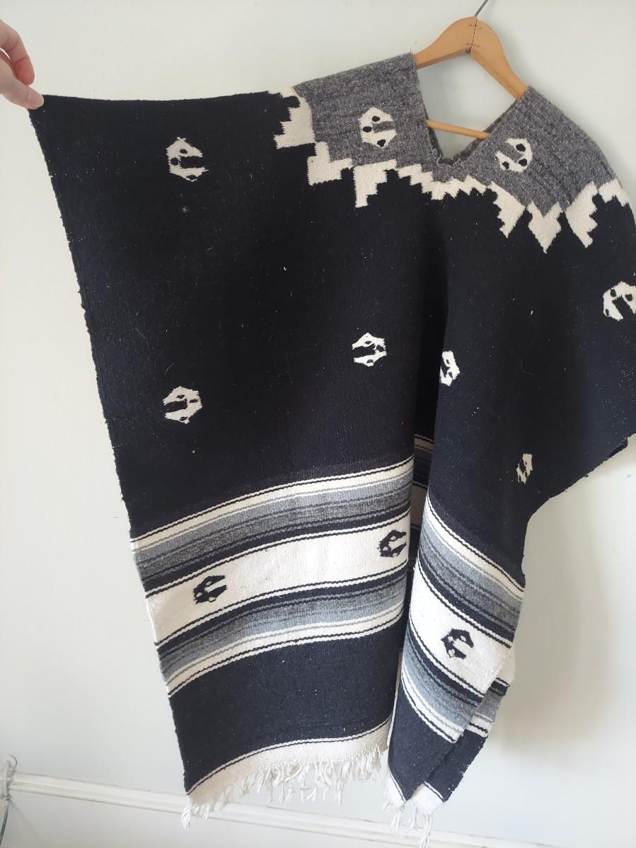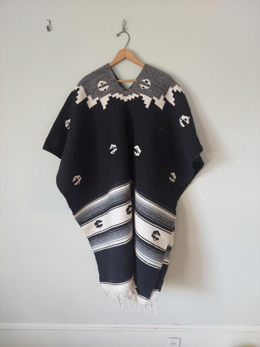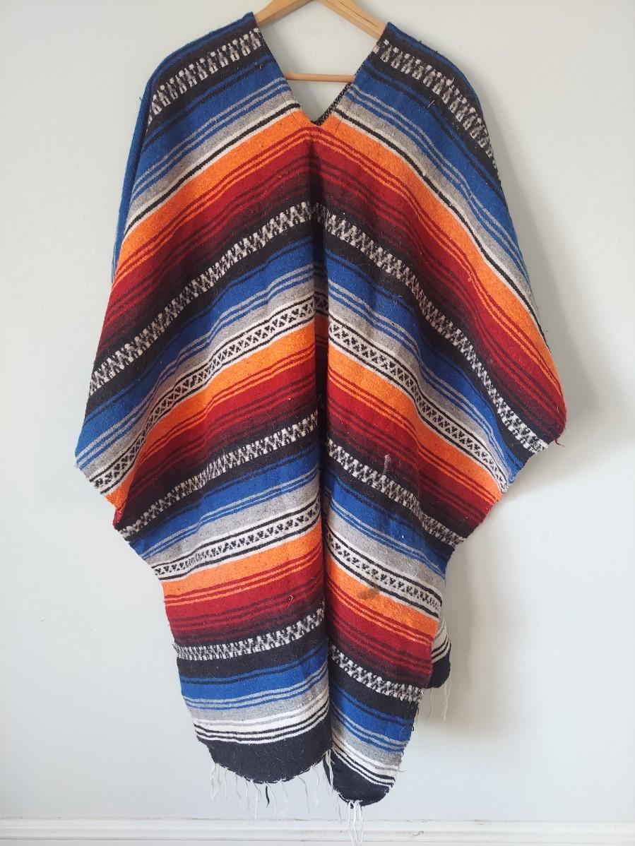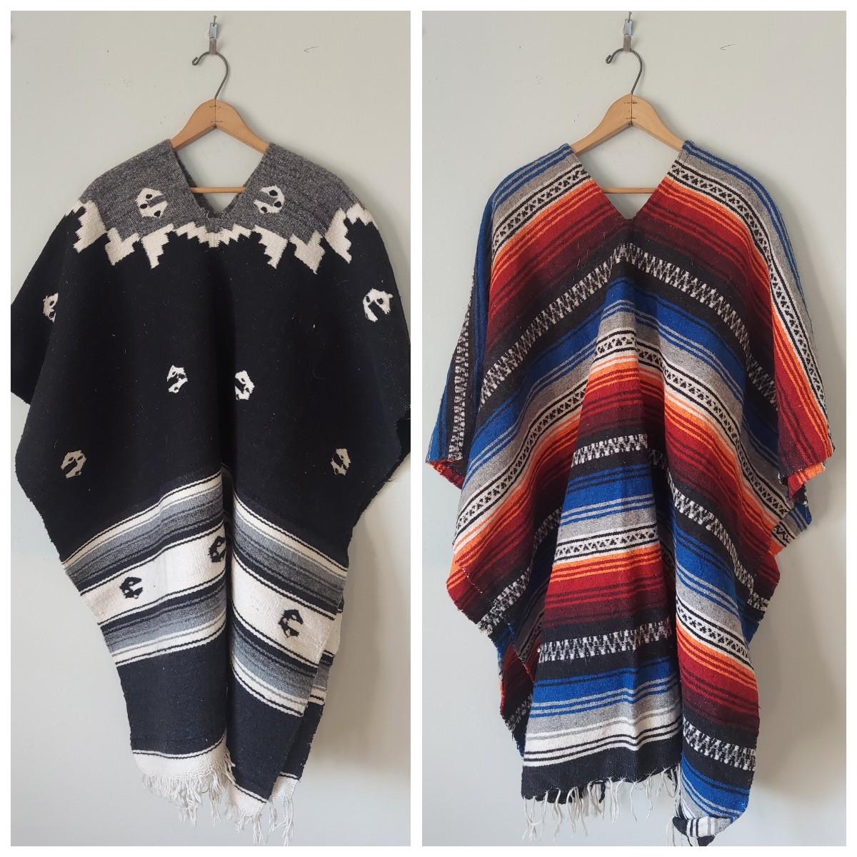 Two serape style poncho that appear to be wool. Neither has tags. They are one size fits “most.” They could each use a good cleaning after neing store a long time. Please see photos for details. Shipping available