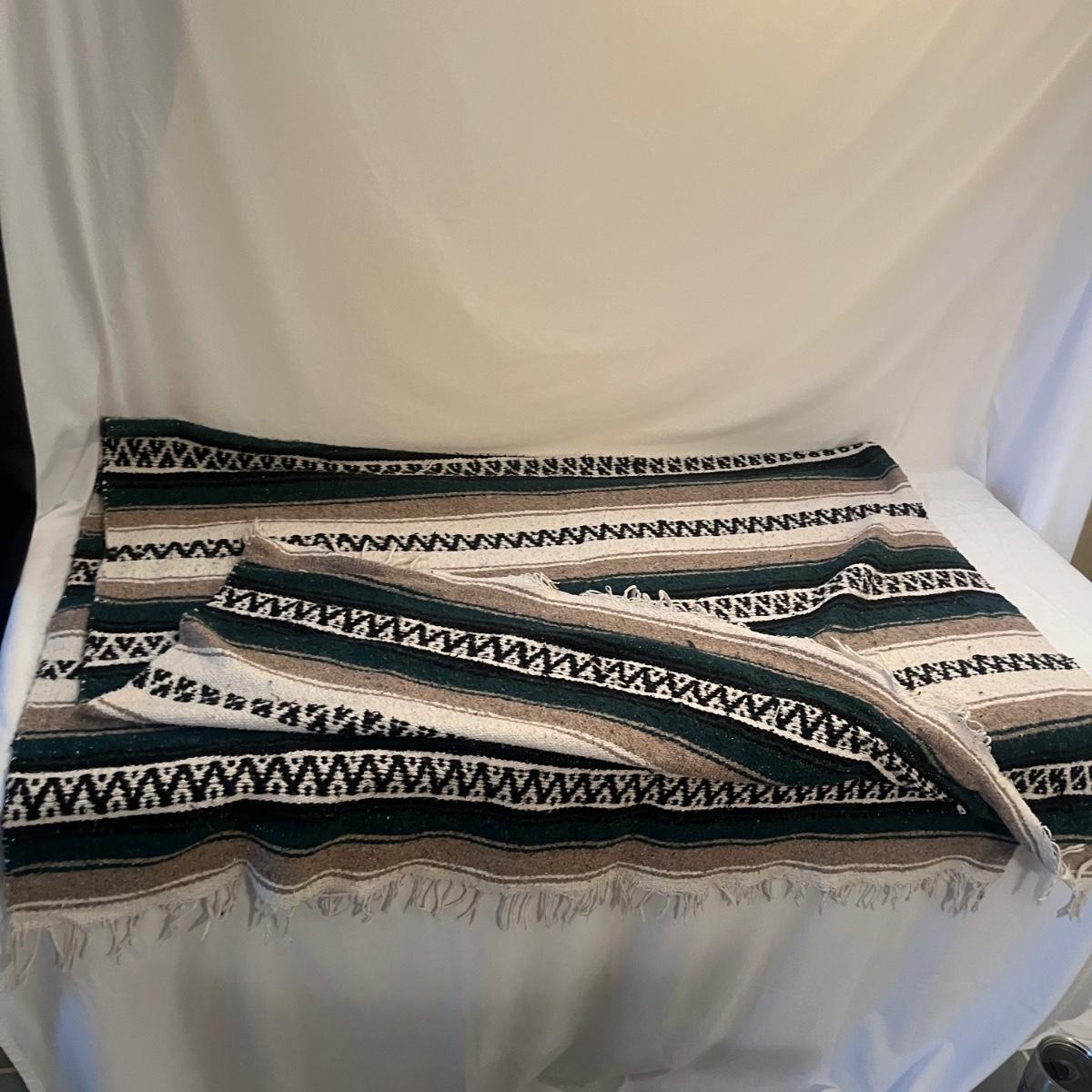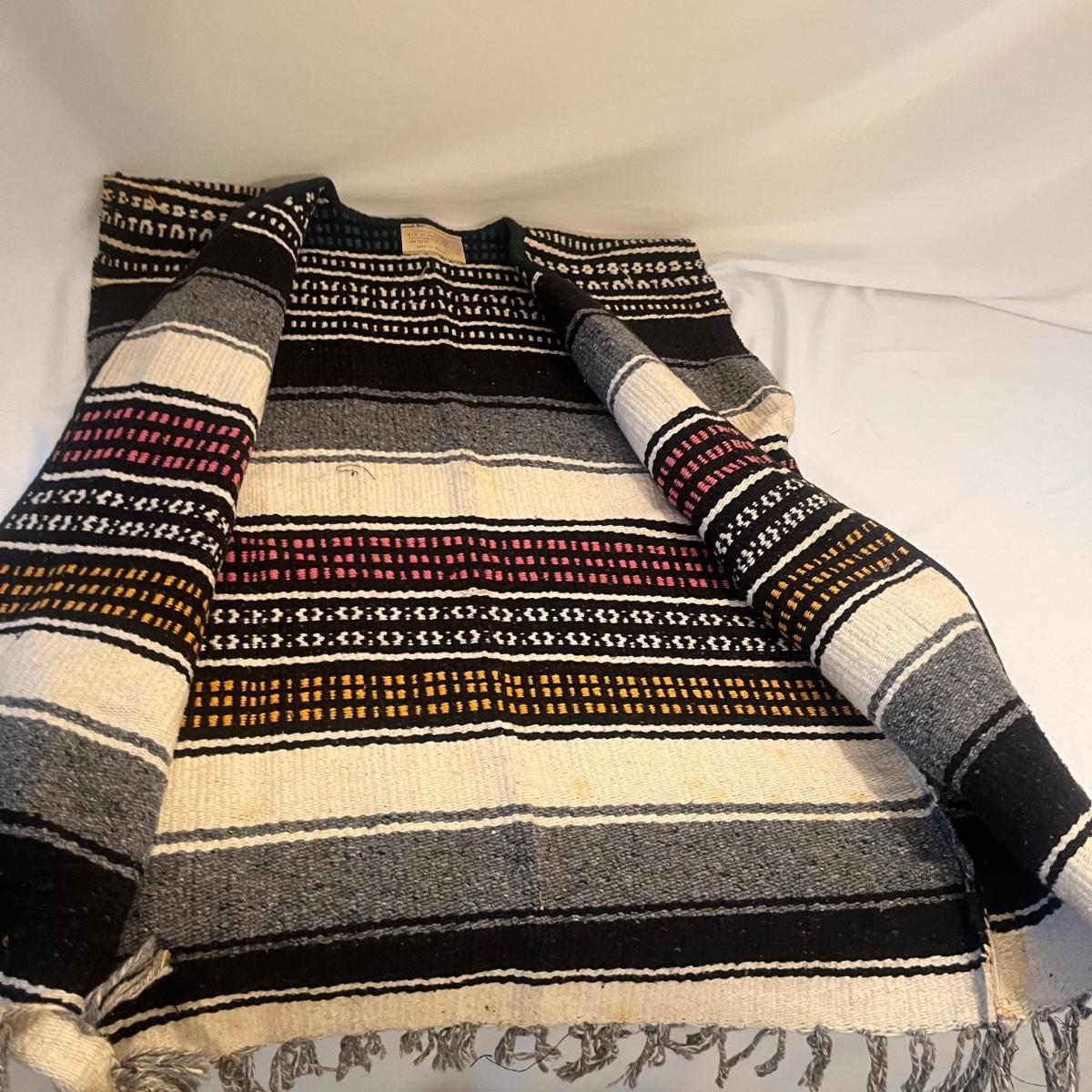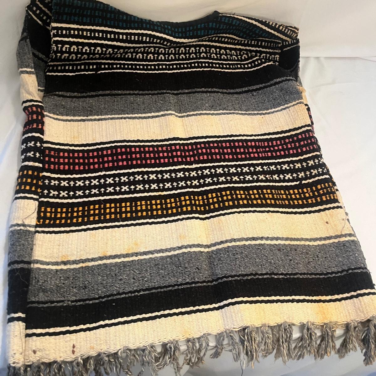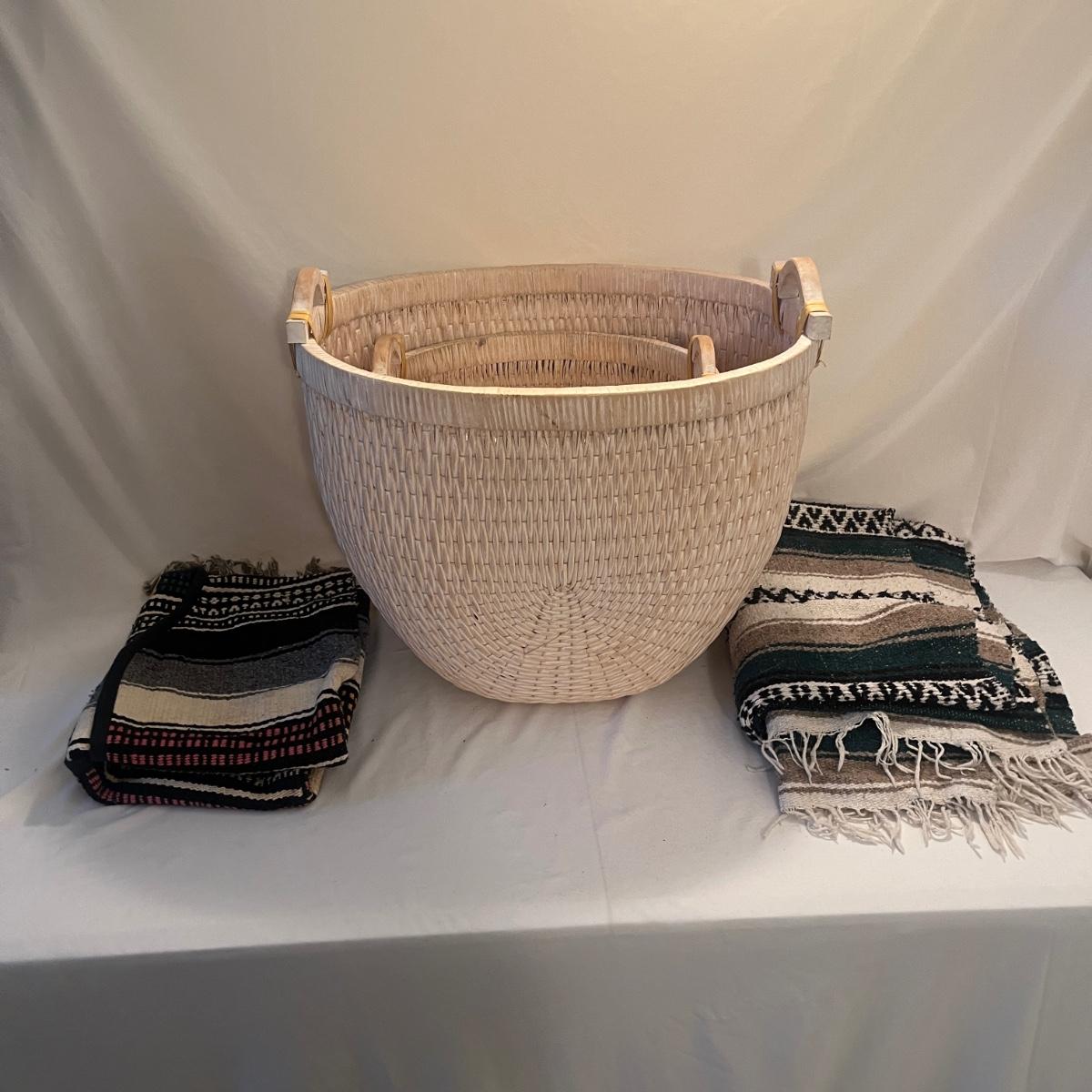 Lot include two woven baskets with wooden handles, serape and a blanket. Serape has holes in each pocket, see pictures. Largest basket measures 21” x 16” x 17”H and blanket measures 50” x 72”.