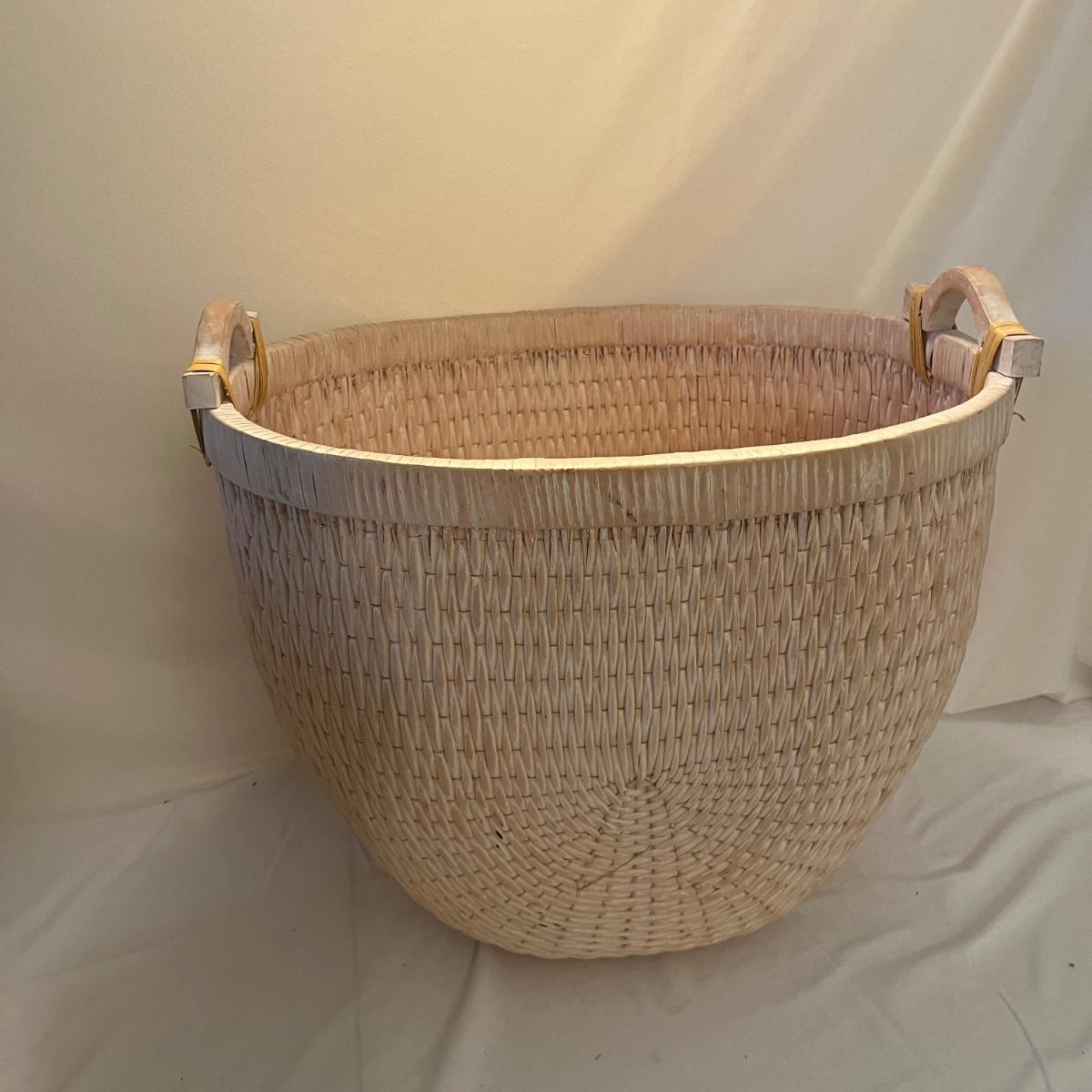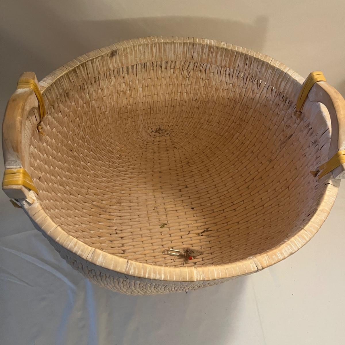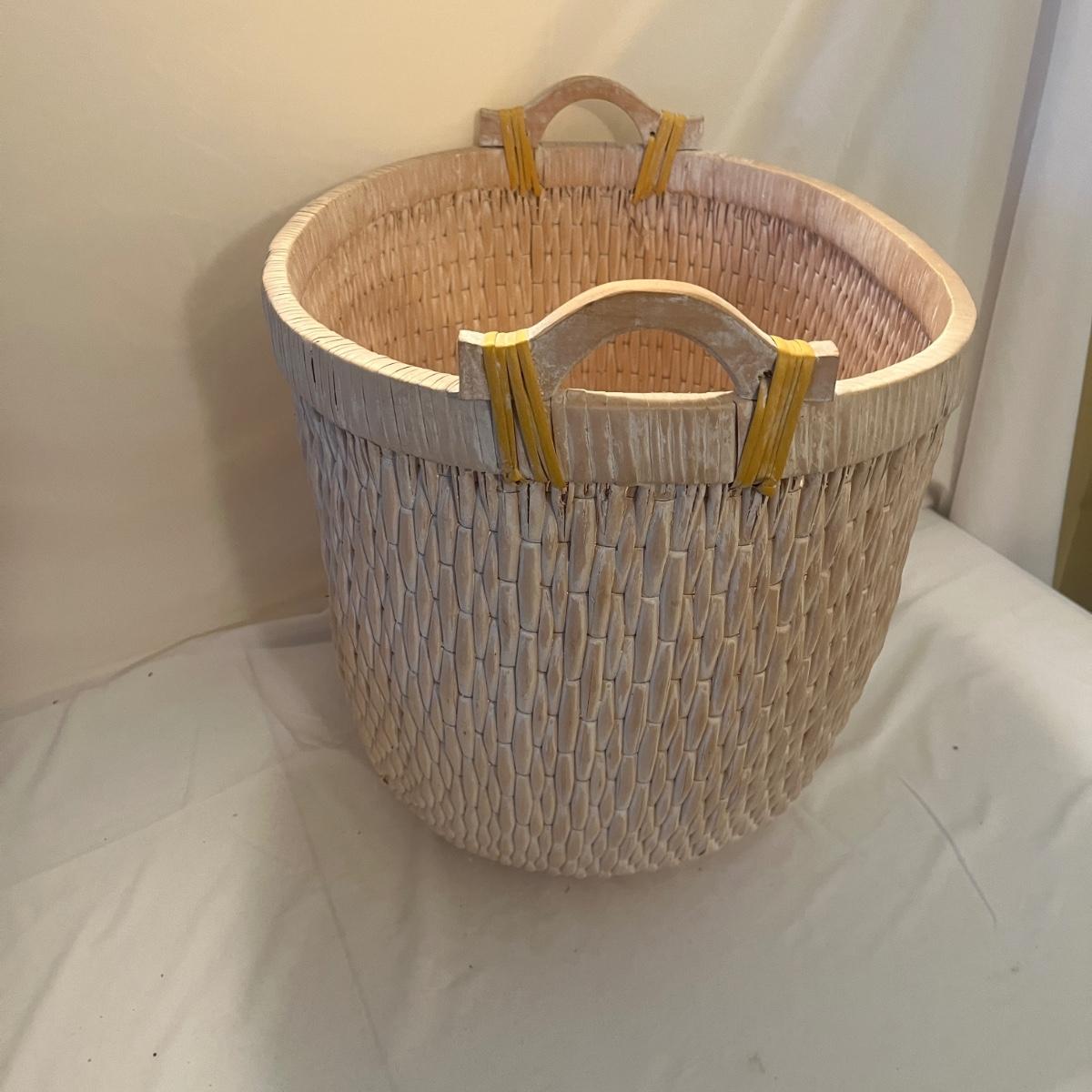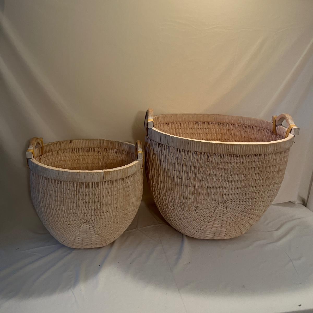 Lot include two woven baskets with wooden handles, serape and a blanket. Serape has holes in each pocket, see pictures. Largest basket measures 21” x 16” x 17”H and blanket measures 50” x 72”.
