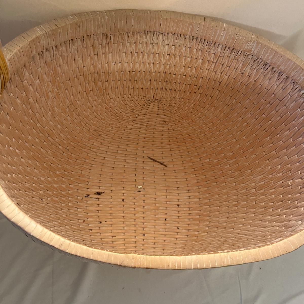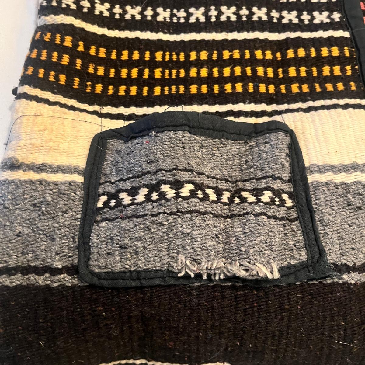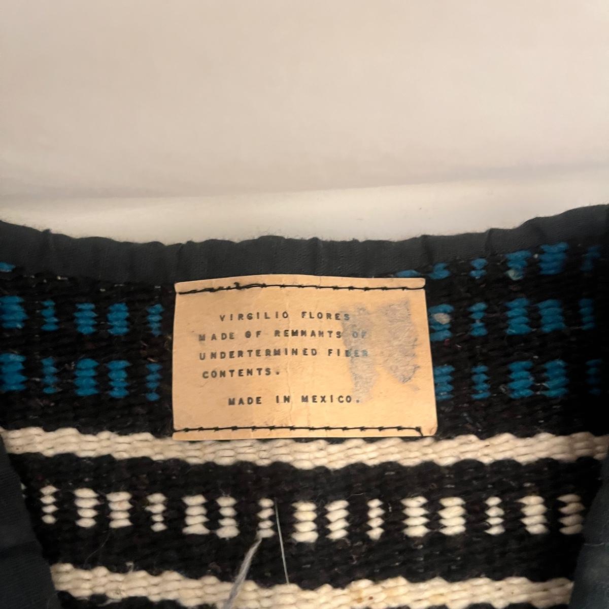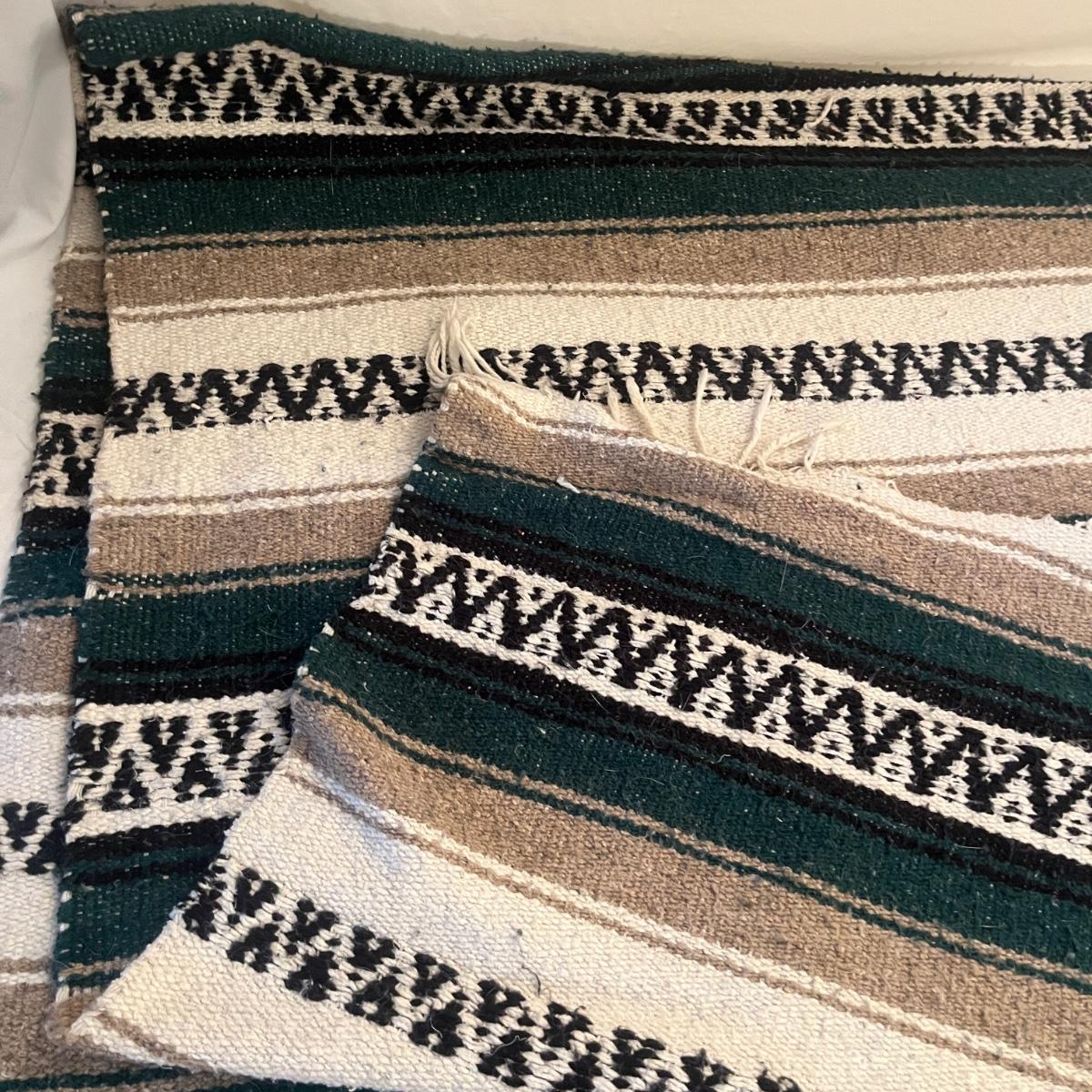 Lot include two woven baskets with wooden handles, serape and a blanket. Serape has holes in each pocket, see pictures. Largest basket measures 21” x 16” x 17”H and blanket measures 50” x 72”.