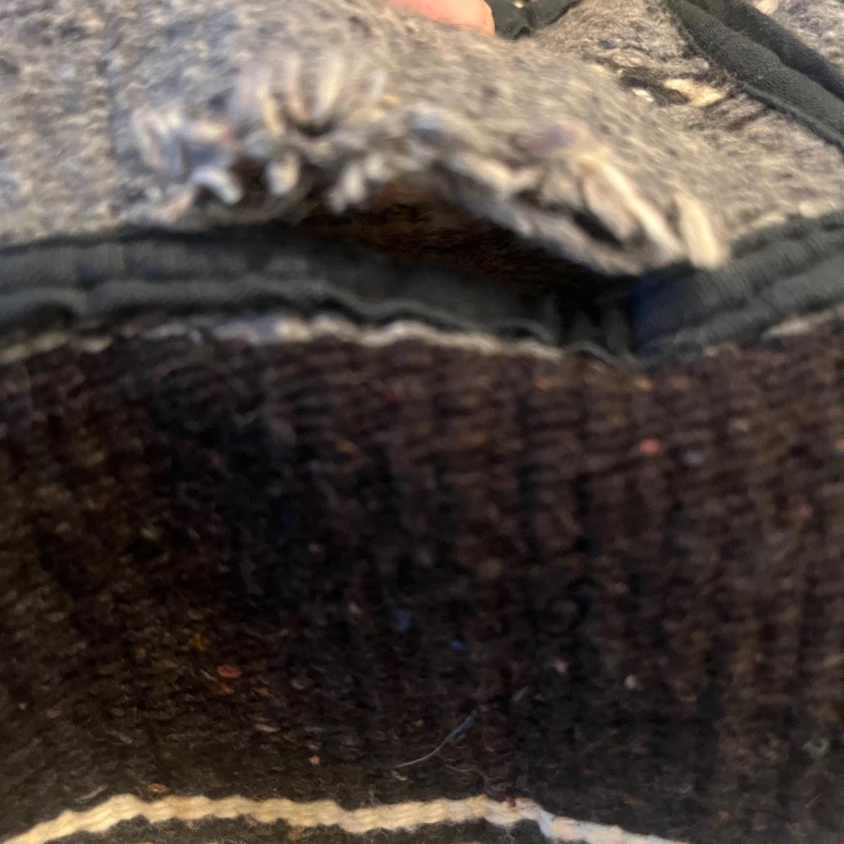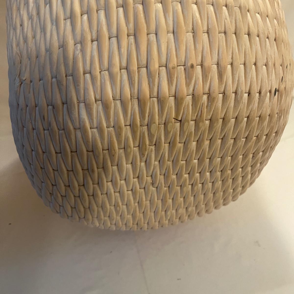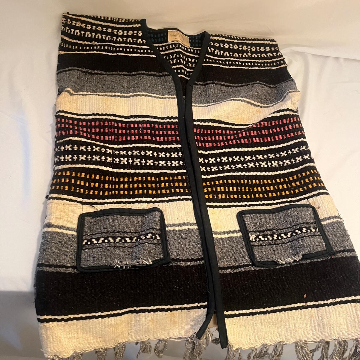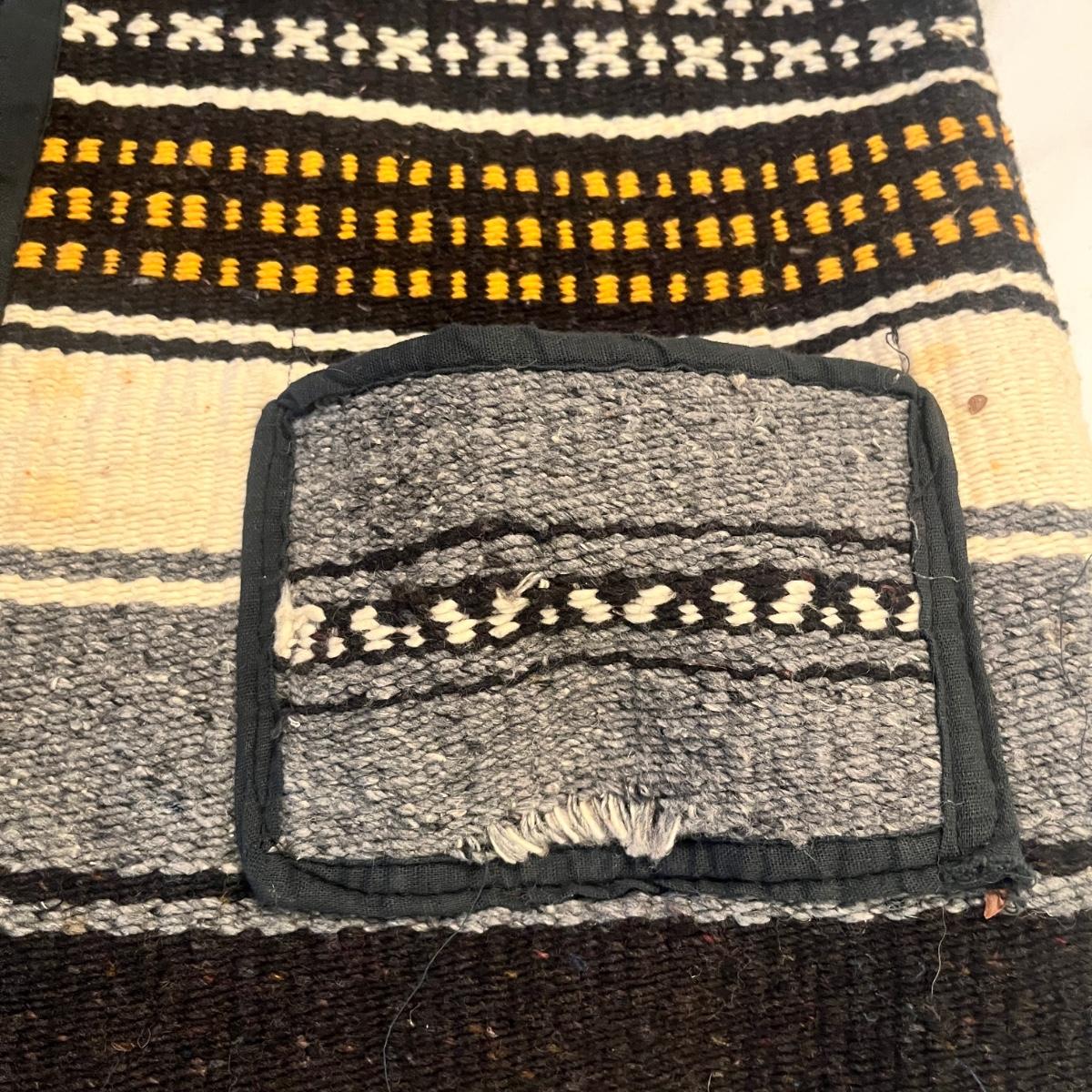 Lot include two woven baskets with wooden handles, serape and a blanket. Serape has holes in each pocket, see pictures. Largest basket measures 21” x 16” x 17”H and blanket measures 50” x 72”.